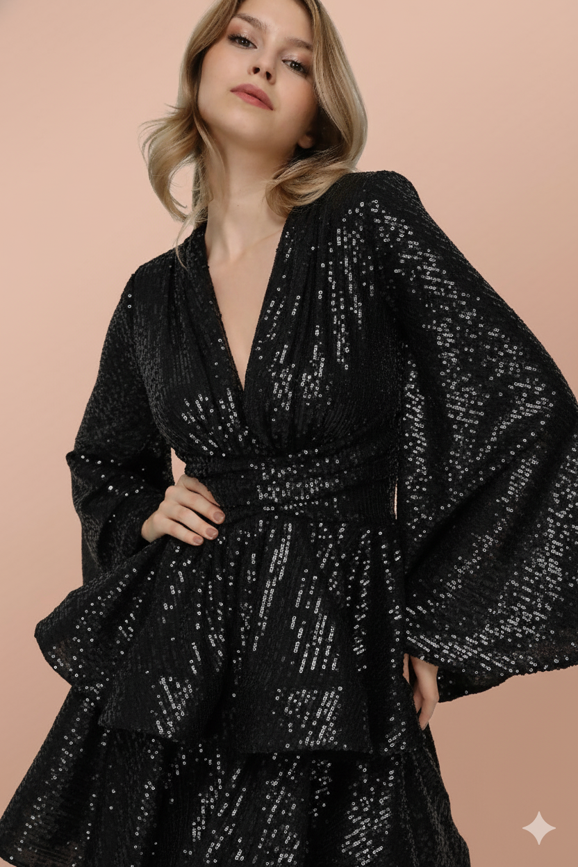 Parti şıklığınızı tamamlayacak, beyaz hologram v yaka volan etek tasarımıyla göz alıcı bir görünüm sunar.; - İpliği boyalı kumaşı sayesinde canlı renklerdeki detayları daha da belirginleştirir.; - Cepsiz yapısı ile modern ve minimalist bir tarz yaratırken, kuşak detayı belinizi zarifçe sararak feminen bir siluet oluşturur.; - Astarlı olması hem rahatlık sağlar hem de elbisenizin formunu korur.; - Fermuarlı kapama şekli pratik kullanım imkanı tanır; böylece hızlıca giyip çıkabilirsiniz.; - Sexy persona'sıyla dikkat çeken bu elbise, özel anlarınızda kendinizi özel hissetmenizi sağlar.; - Kutulu ambalajıyla hediye olarak tercih edebileceğiniz bu ürün, kaliteyi ve özeni yansıtır.; - Kloş siluetiyle hareket özgürlüğü sunarken payet dokusuyla parıldayan bir görünüm kazandırır.; - Korsaj detayı ile göğüs bölgesini vurgulayarak feminen çizgilere sahip olmanızı sağlar.; - Kuru temizleme önerisiyle uzun süre ilk günkü gibi kalmasını sağlayabilirsiniz.; - Sürdürülebilirlik detayına önem verenler için idealdir; çevre dostu malzemelerden üretilmiştir.; - %80 polyester ve %20 elastan karışımından oluşan materyali esneklik ve dayanıklılık sunar.; - Tüm sezonlarda tercih edebileceğiniz çok yönlülükteki tasarım her ortama uyum sağlar.; - Türkiye'de üretilmiş olup yerel üretim avantajlarından faydalanmanızı garanti eder.; - Örme kumaş tipi konforlu bir deneyim vaat ederken mini boy kesimiyle trendleri takip edersiniz.; - Loose kalıp sayesinde vücudu sarmadan rahatça oturan yapıya sahiptir.; - Yetişkin yaş grubuna hitap eden geniş kullanıcı kitlesi düşünülerek tasarlanmıştır.; - Kadın/kız cinsiyetine yönelik olarak üretilmiş olup stil sahibi kadınların beğenisine sunulmuştur.; - V yaka detayı boynunuzu zarifçe çerçeveleyerek sofistike bir duruş sergiler.; - Düz deseniyle sadeliği ön plana çıkartırken İspanyol kol tipi modern estetiği tamamlar.; - Uzun kol boyu mevsimsel geçişlerde ideal koruma sağlarken payet detaylarıyla gece şıklığına katkıda bulunur.