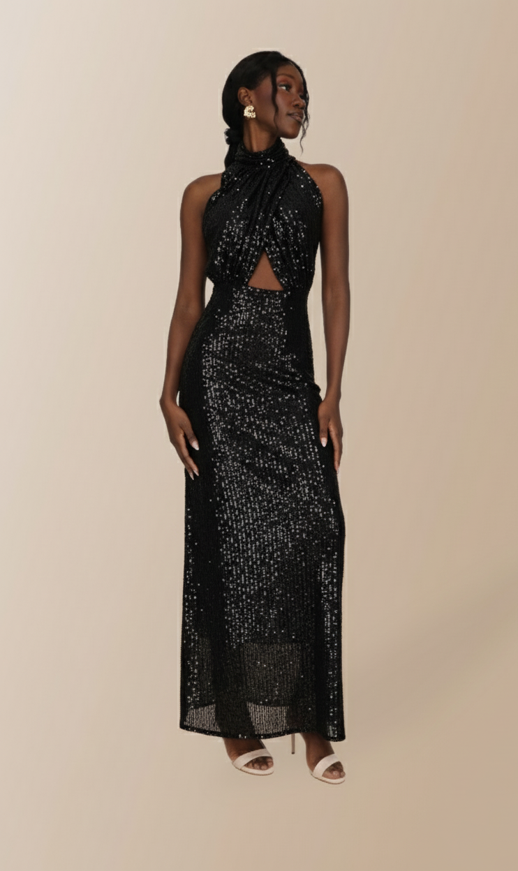 Elifnaz Beyaz Payetli Çapraz Detaylı Boğazlı Uzun Elbise