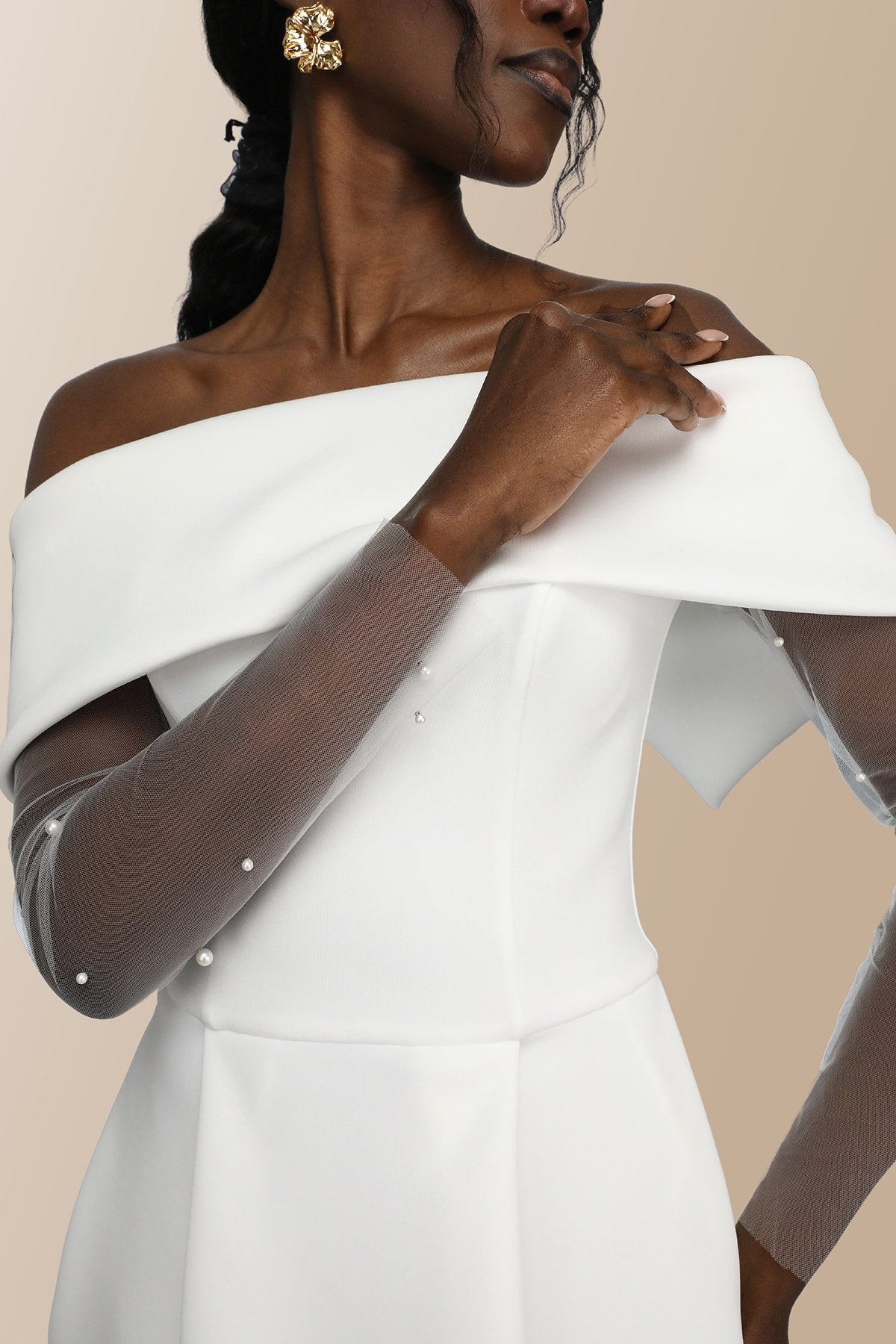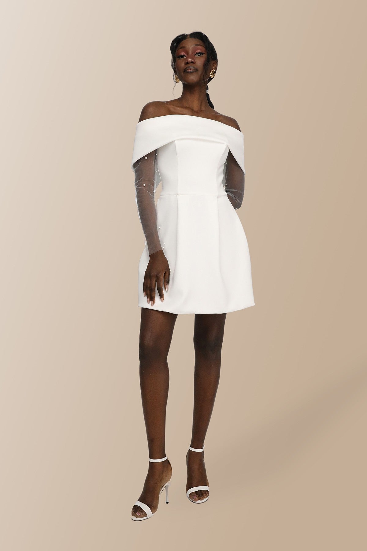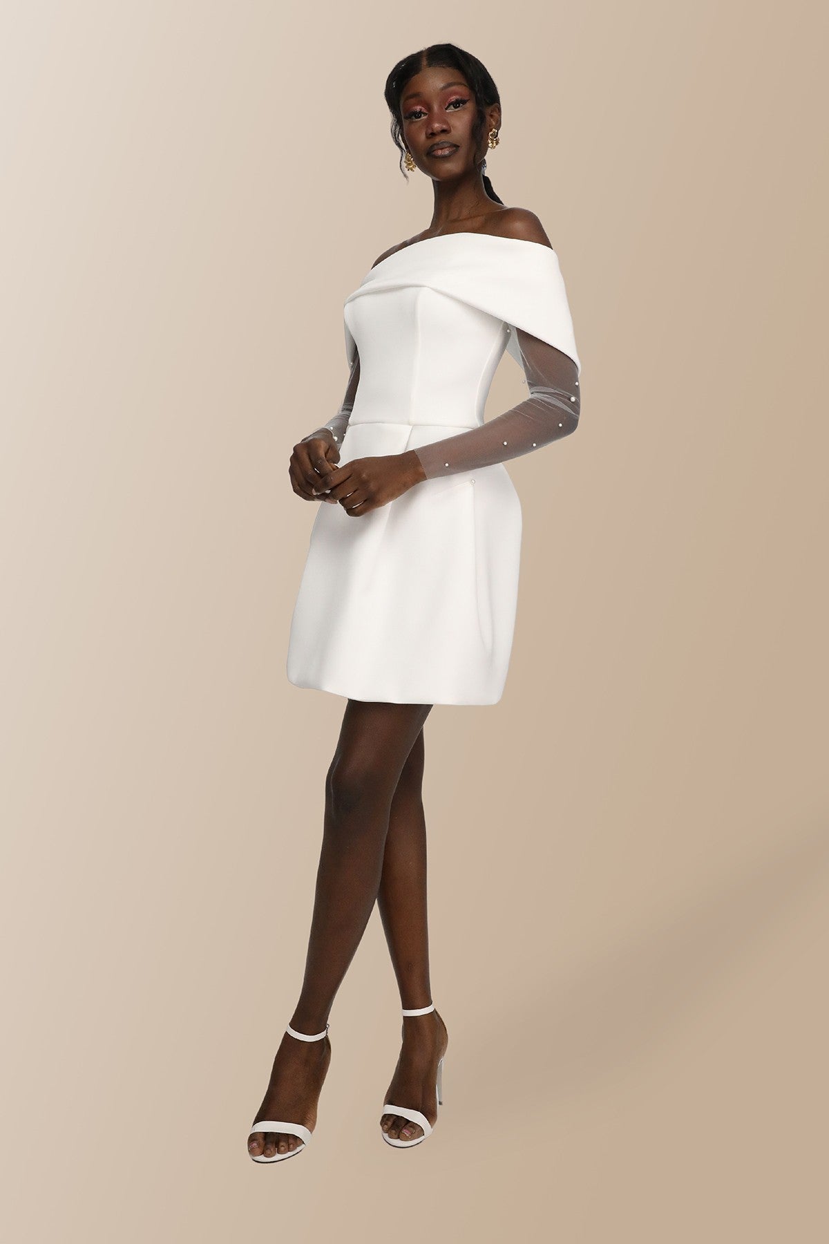 İnci Kol Detaylı Carmen Yaka Mini Elbise - Beyaz
