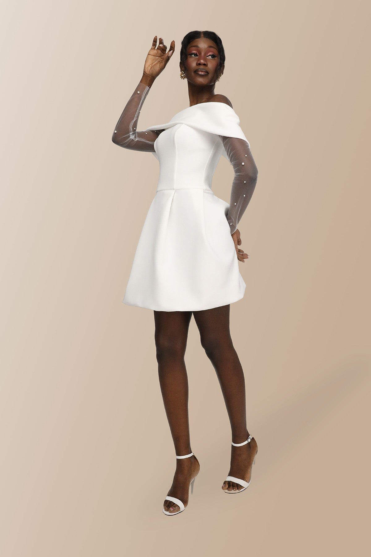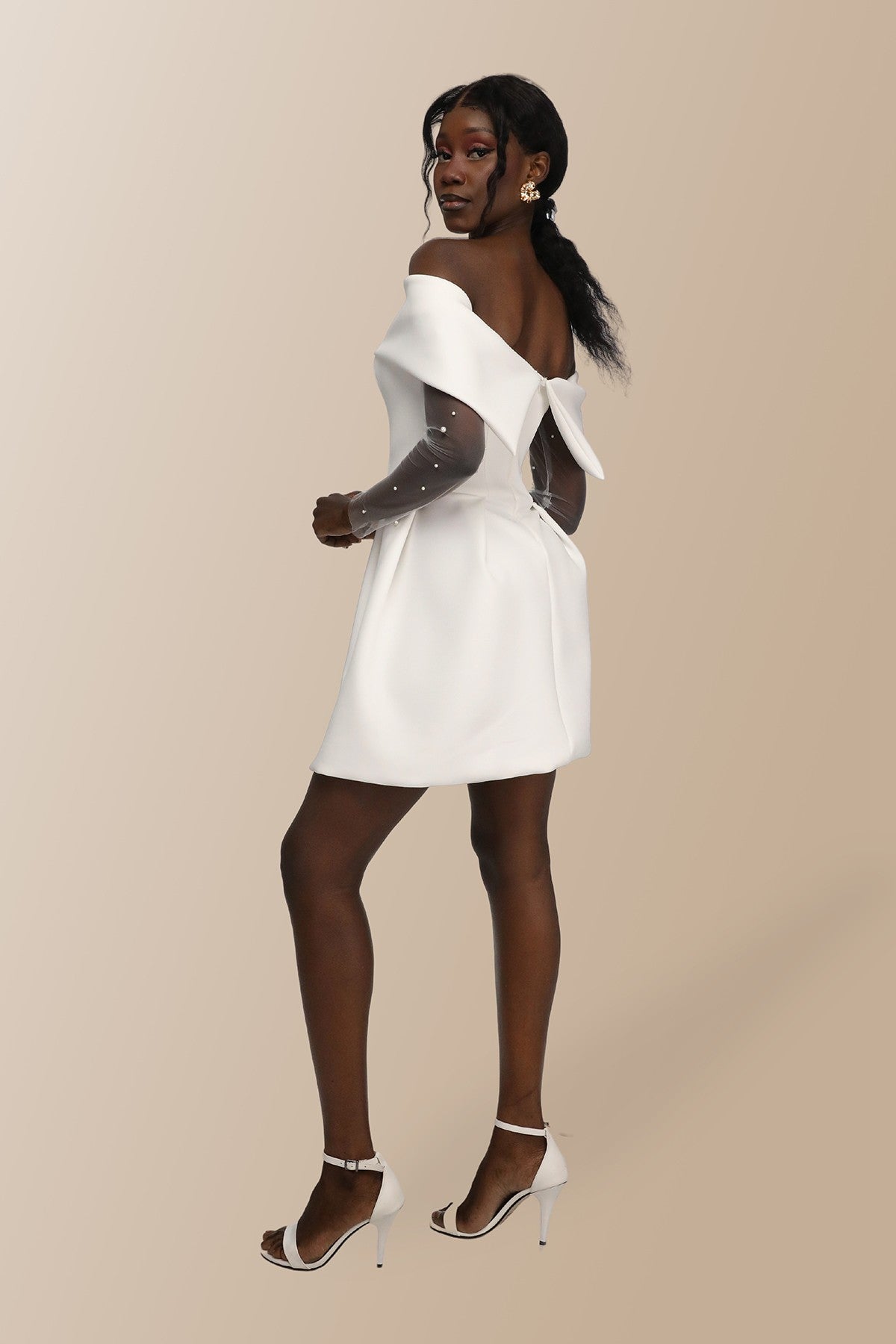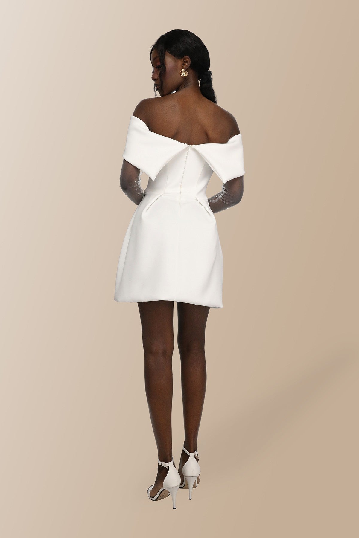 İnci Kol Detaylı Carmen Yaka Mini Elbise - Beyaz