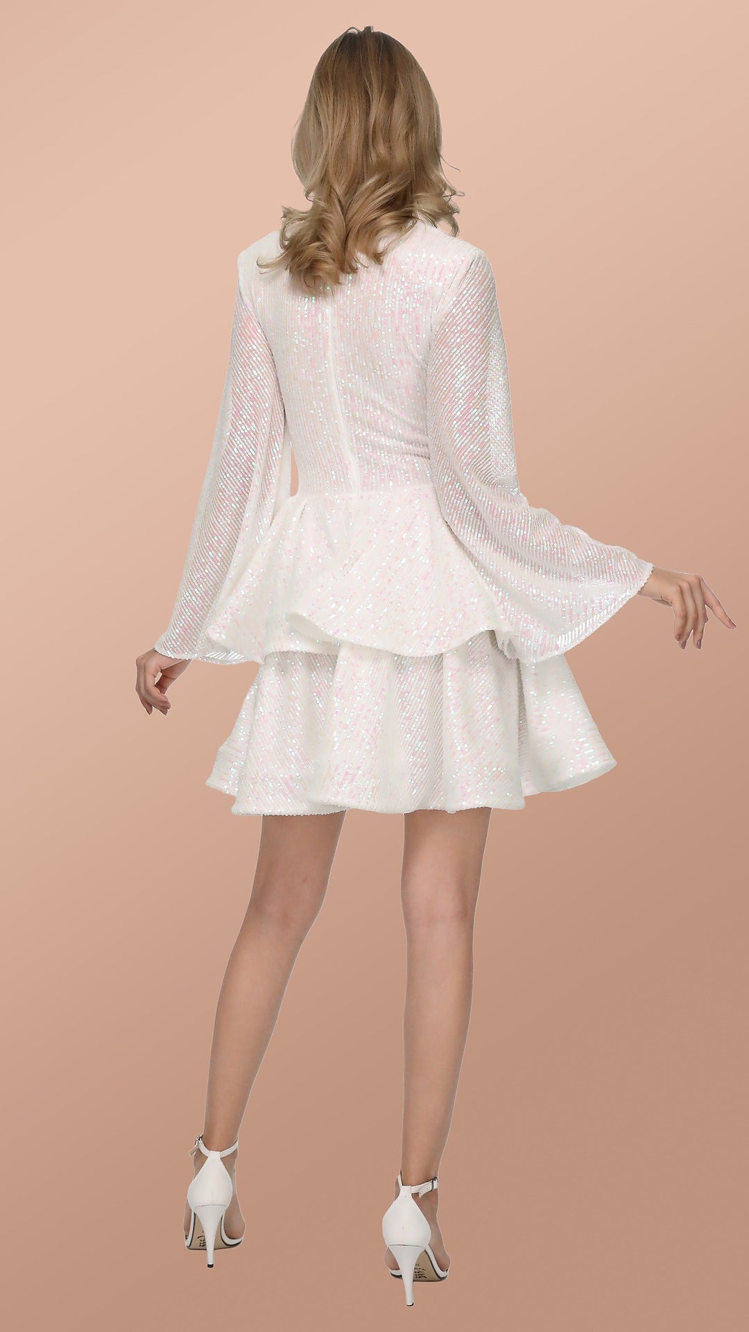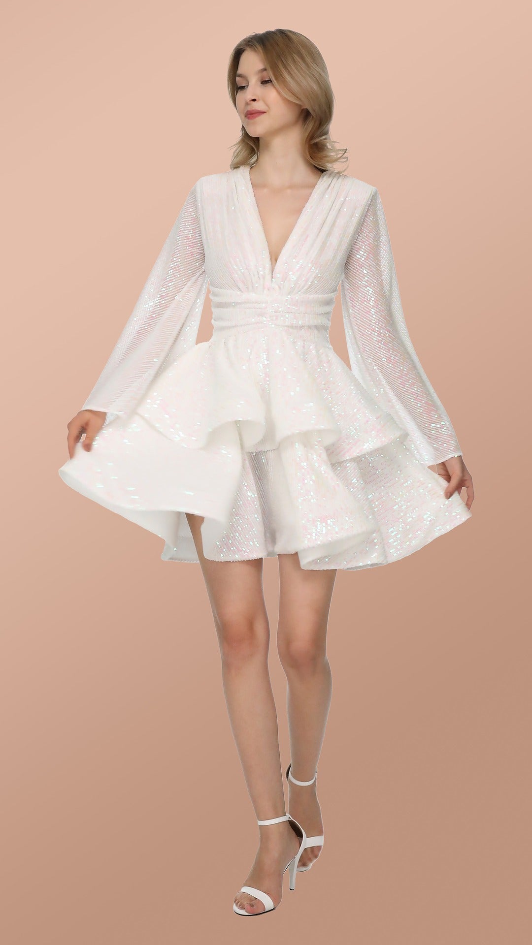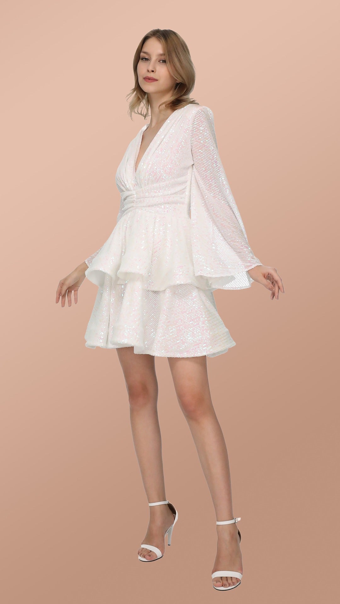 Parti şıklığınızı tamamlayacak, beyaz hologram v yaka volan etek tasarımıyla göz alıcı bir görünüm sunar.; - İpliği boyalı kumaşı sayesinde canlı renklerdeki detayları daha da belirginleştirir.; - Cepsiz yapısı ile modern ve minimalist bir tarz yaratırken, kuşak detayı belinizi zarifçe sararak feminen bir siluet oluşturur.; - Astarlı olması hem rahatlık sağlar hem de elbisenizin formunu korur.; - Fermuarlı kapama şekli pratik kullanım imkanı tanır; böylece hızlıca giyip çıkabilirsiniz.; - Sexy persona'sıyla dikkat çeken bu elbise, özel anlarınızda kendinizi özel hissetmenizi sağlar.; - Kutulu ambalajıyla hediye olarak tercih edebileceğiniz bu ürün, kaliteyi ve özeni yansıtır.; - Kloş siluetiyle hareket özgürlüğü sunarken payet dokusuyla parıldayan bir görünüm kazandırır.; - Korsaj detayı ile göğüs bölgesini vurgulayarak feminen çizgilere sahip olmanızı sağlar.; - Kuru temizleme önerisiyle uzun süre ilk günkü gibi kalmasını sağlayabilirsiniz.; - Sürdürülebilirlik detayına önem verenler için idealdir; çevre dostu malzemelerden üretilmiştir.; - %80 polyester ve %20 elastan karışımından oluşan materyali esneklik ve dayanıklılık sunar.; - Tüm sezonlarda tercih edebileceğiniz çok yönlülükteki tasarım her ortama uyum sağlar.; - Türkiye'de üretilmiş olup yerel üretim avantajlarından faydalanmanızı garanti eder.; - Örme kumaş tipi konforlu bir deneyim vaat ederken mini boy kesimiyle trendleri takip edersiniz.; - Loose kalıp sayesinde vücudu sarmadan rahatça oturan yapıya sahiptir.; - Yetişkin yaş grubuna hitap eden geniş kullanıcı kitlesi düşünülerek tasarlanmıştır.; - Kadın/kız cinsiyetine yönelik olarak üretilmiş olup stil sahibi kadınların beğenisine sunulmuştur.; - V yaka detayı boynunuzu zarifçe çerçeveleyerek sofistike bir duruş sergiler.; - Düz deseniyle sadeliği ön plana çıkartırken İspanyol kol tipi modern estetiği tamamlar.; - Uzun kol boyu mevsimsel geçişlerde ideal koruma sağlarken payet detaylarıyla gece şıklığına katkıda bulunur.