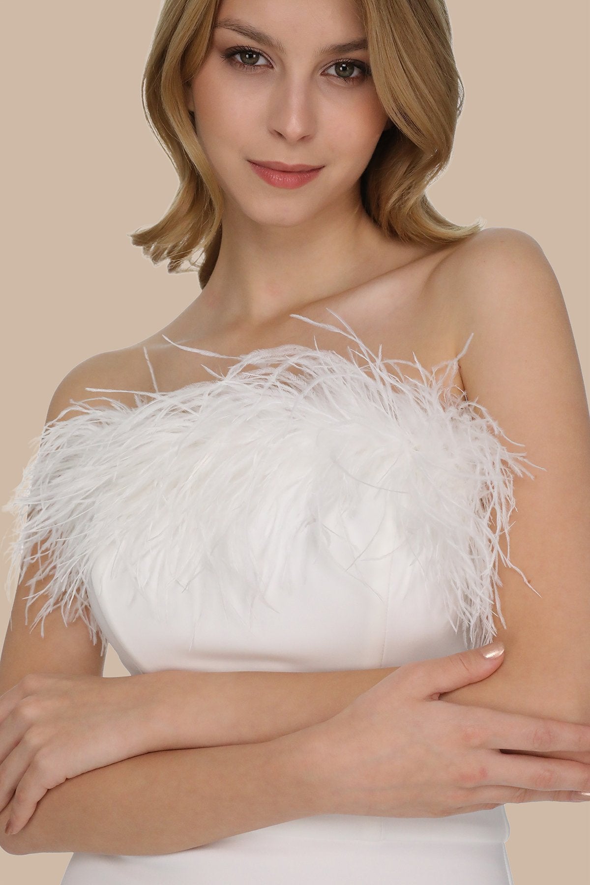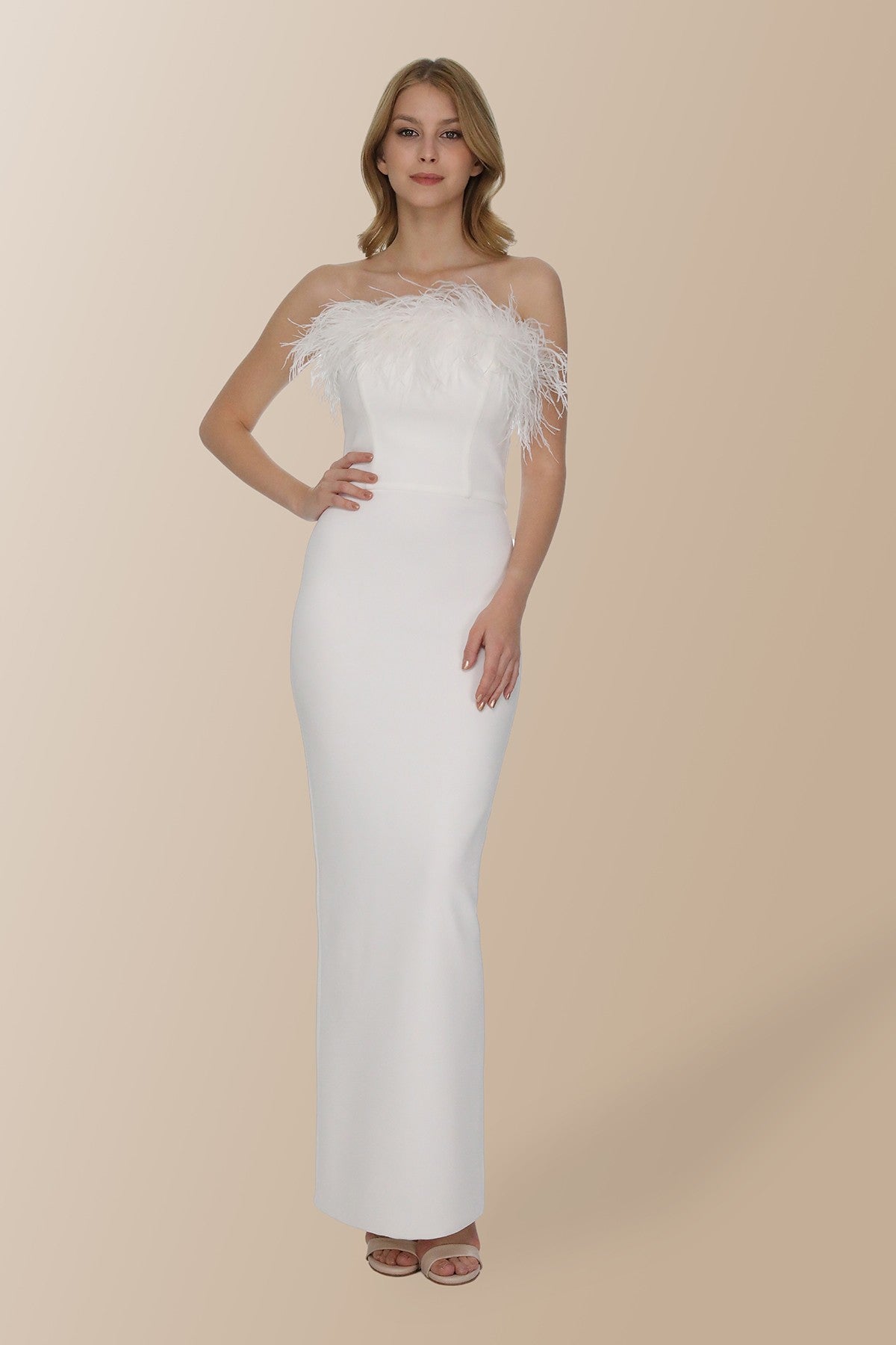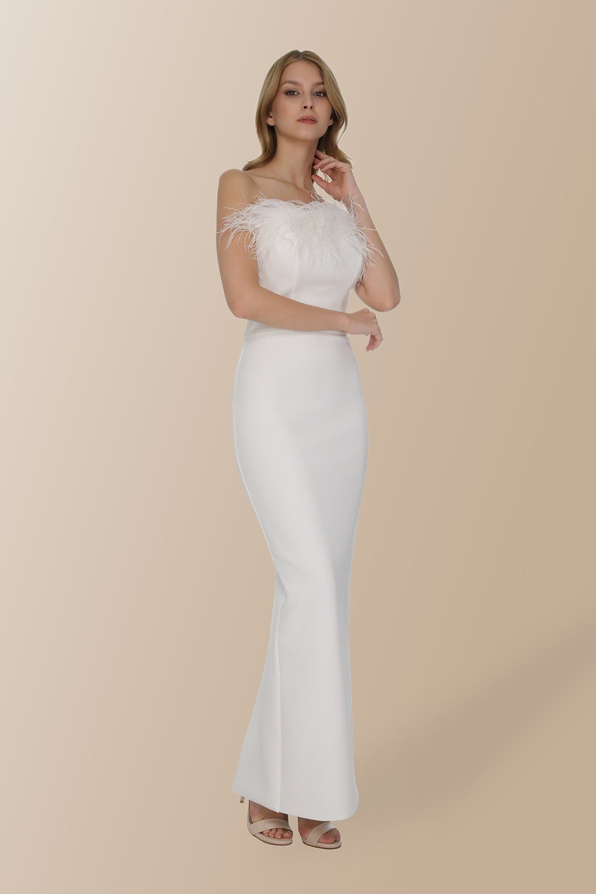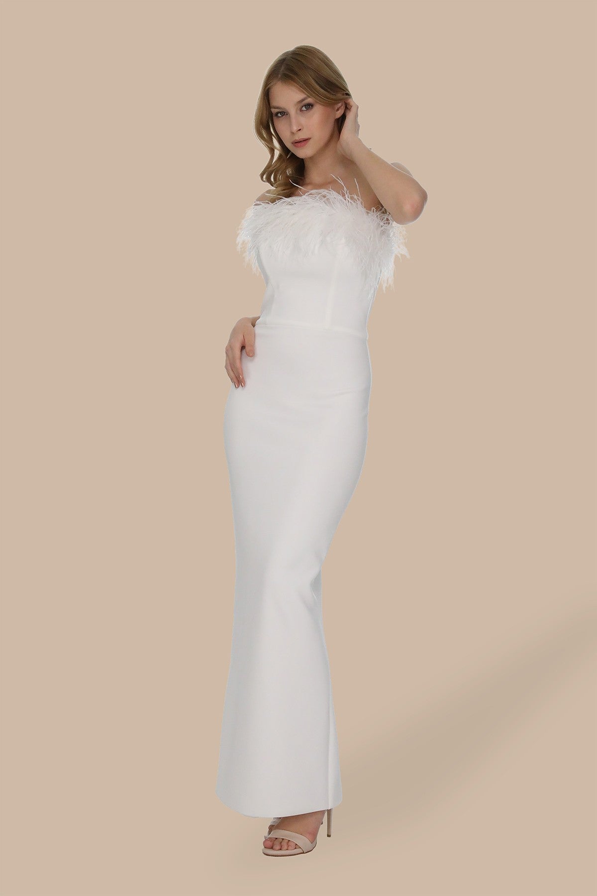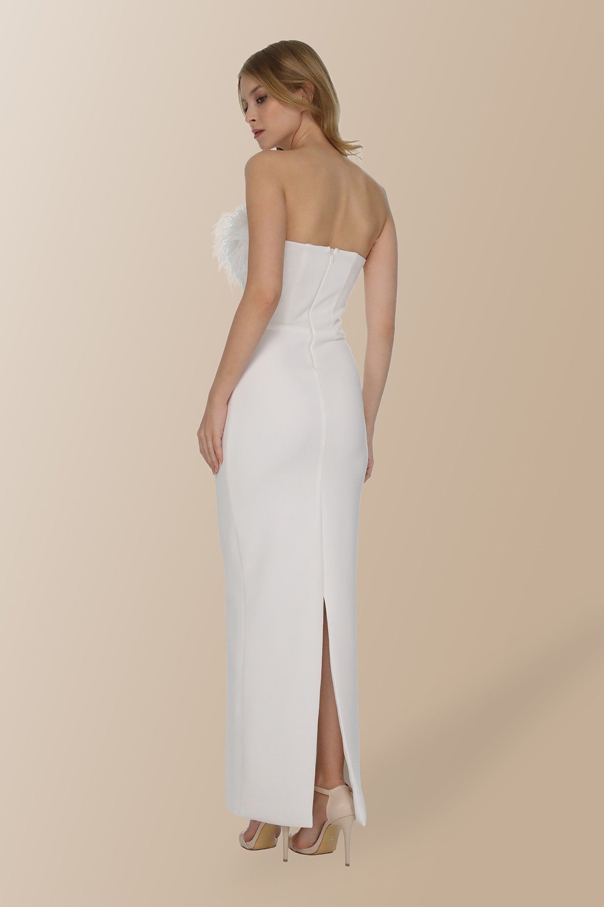 Beyaz Otriş Detaylı Straplez Uzun Elbise