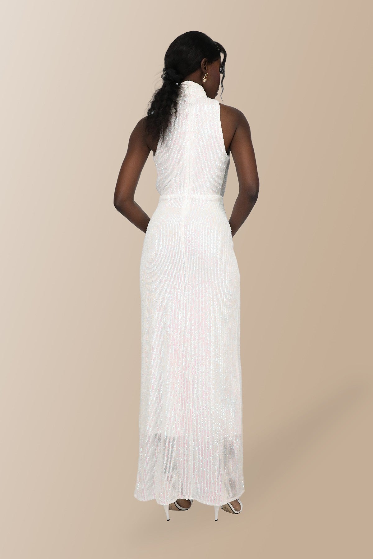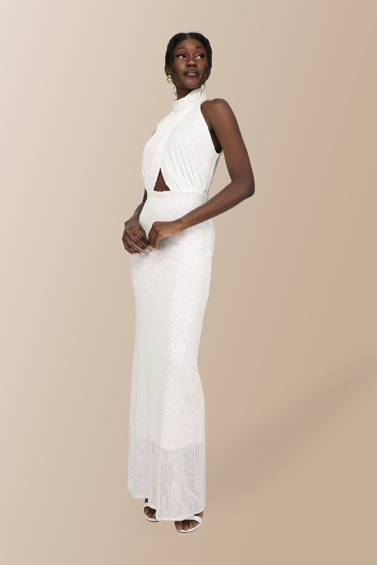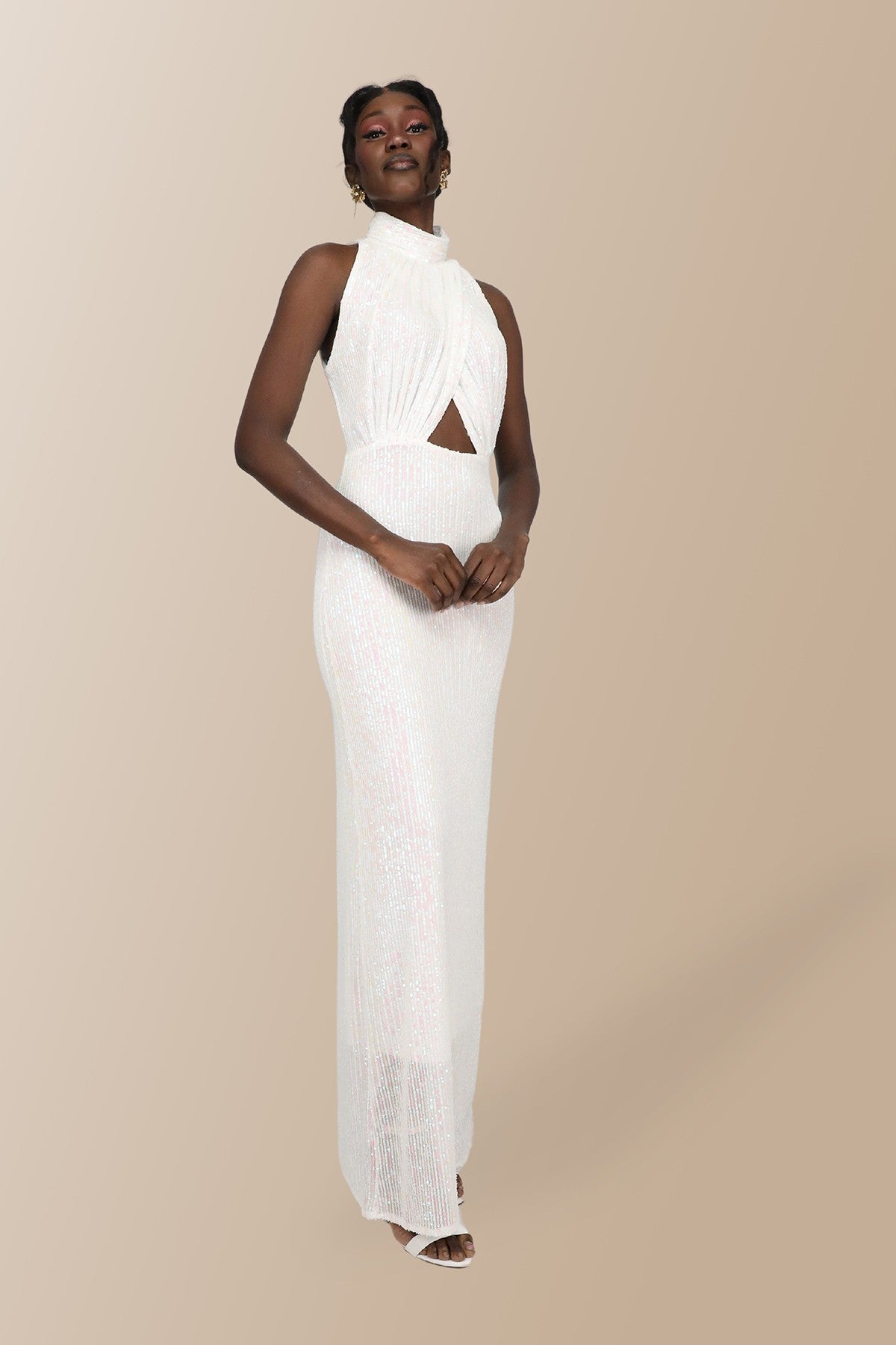 Elifnaz Beyaz Payetli Çapraz Detaylı Boğazlı Uzun Elbise