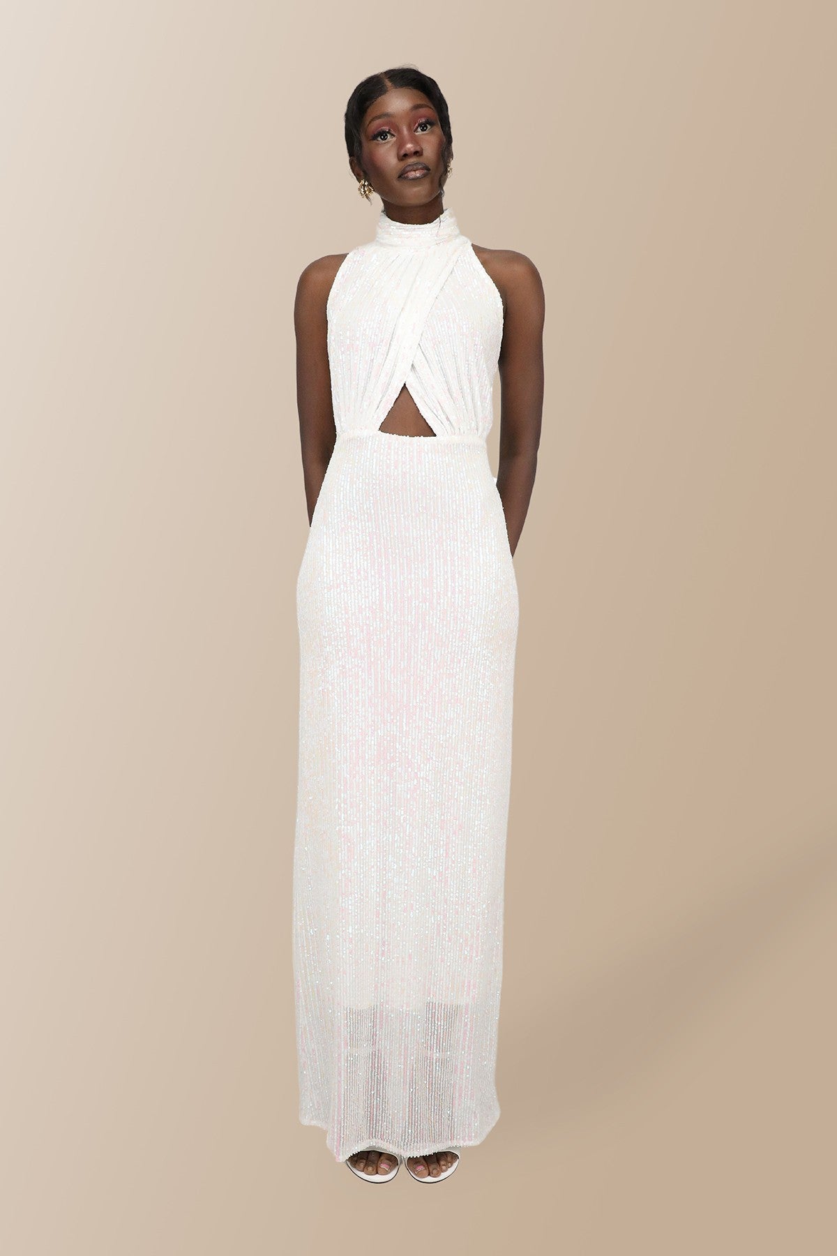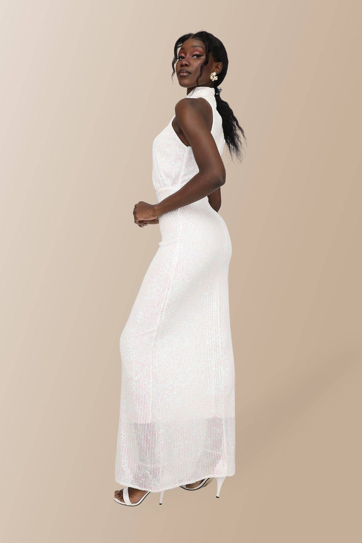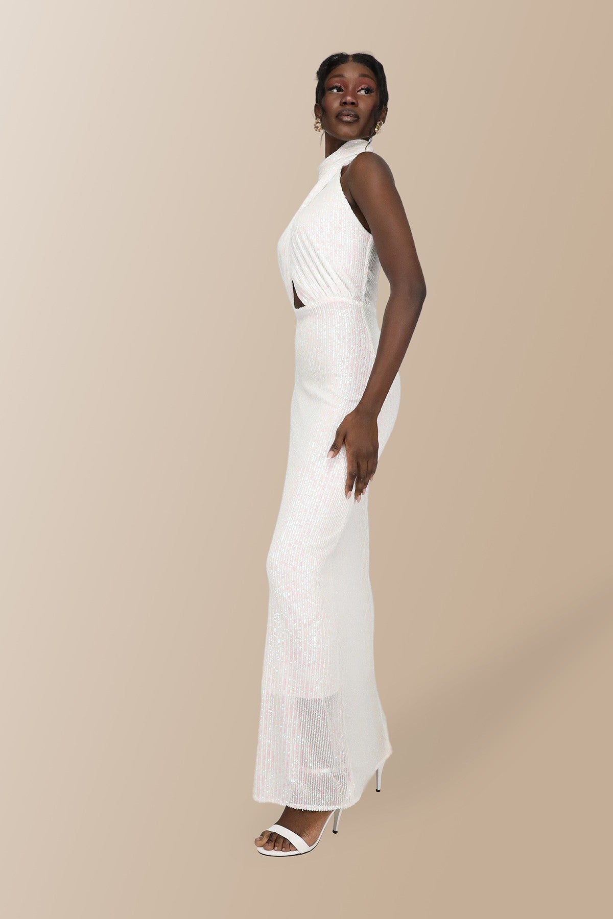 Elifnaz Beyaz Payetli Çapraz Detaylı Boğazlı Uzun Elbise