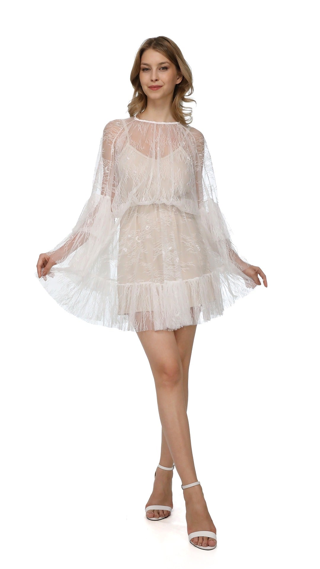 Zarif dantel detaylarıyla süslenmiş, sıfır yaka tasarımıyla feminen bir görünüm sunar.; - Cepsiz yapısı ve kemersiz tasarımı ile rahatlık ve şıklığı bir arada yaşatır.; - Astarlı olması sayesinde iç göstermez ve konforlu bir kullanım sağlar.; - Düğmeli kapama şekliyle kolayca giyilip çıkartılabilir; pratik kullanım sunar.; - Young persona'ya hitap eden dinamik ve genç ruhunu yansıtan bir stil oluşturur.; - Kutulu ambalajıyla hediye olarak da tercih edilebilecek ideal bir seçenektir.; - Kloş silueti sayesinde hareket özgürlüğü tanırken, dantel dokusuyla göz alıcı bir etki bırakır.; - Volanlı detayları ile romantik ve zarif bir hava katarken, beli lastikli oluşu vücut hatlarını nazikçe sararak konforlu bir deneyim sunar.; - Elde yıkanabilme özelliğiyle kolay bakım imkanı sağlar; kuru temizleme de tercihe bağlıdır.; - Sürdürülebilirlik detayına sahip bu elbise, çevre dostu üretim anlayışını destekler.; - %70 polyester, %15 pamuk ve %15 elastan karışımından oluşan materyali esneklik kazandırarak gün boyu rahatlık sağlar.; - Tüm sezonlarda tercih edebileceğiniz çok yönlülükteki tasarım, gardrobunuzda yerini almayı hak ediyor.; - Türkiye menşeli olup kaliteli malzemeler kullanılarak üretilmiştir.; - Düğün veya nişan gibi özel günlerde şıklığınızla fark yaratmanız için idealdir.; - Uzun kollu ve mini boyuyla mevsim koşullarına uygun kombinler oluşturmanıza olanak tanır.; - Loose kalıbı sayesinde vücudu sarmayan yapıda olup özgürce hareket etmenize izin verir.; - Genç yaş grubuna hitap eden modern çizgilerle tarzınızı yansıtmanız için tasarlanmıştır.; - Kadın ve kız kullanıcılar için uygundur; herkes tarafından rahatlıkla tercih edilebilir.
