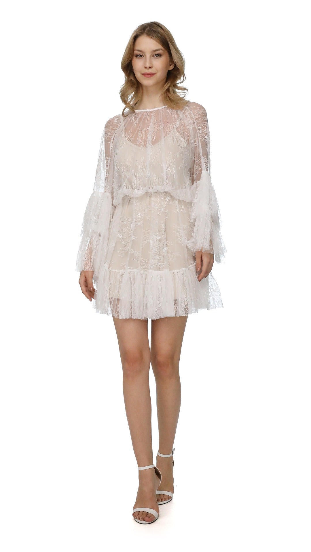 Beyaz sıfır yaka fırfırlı dantel elbise
