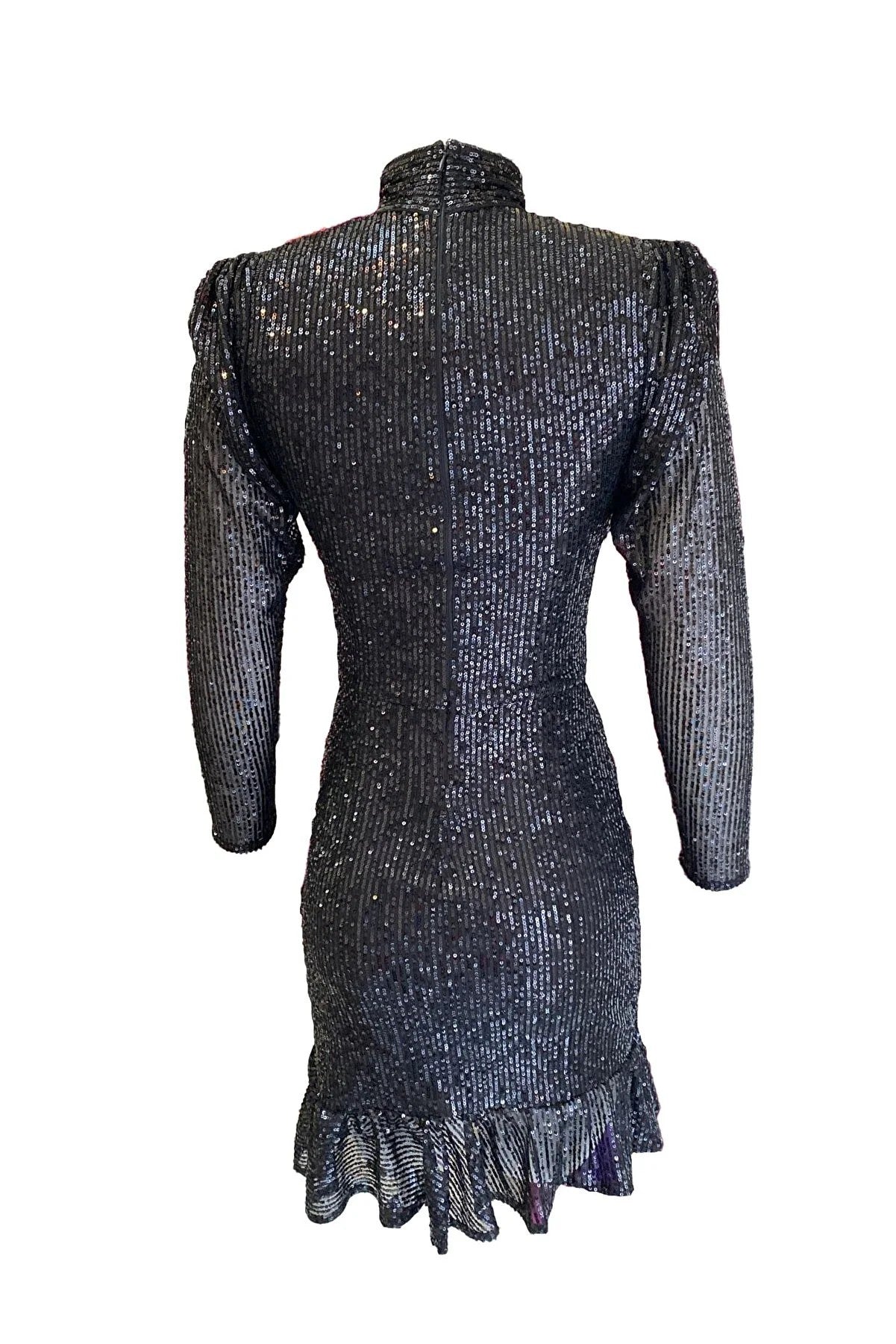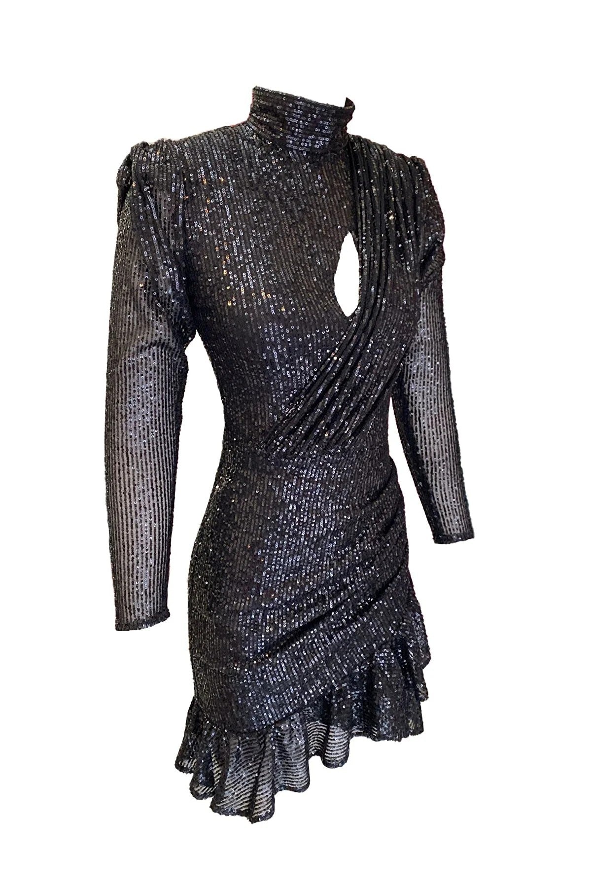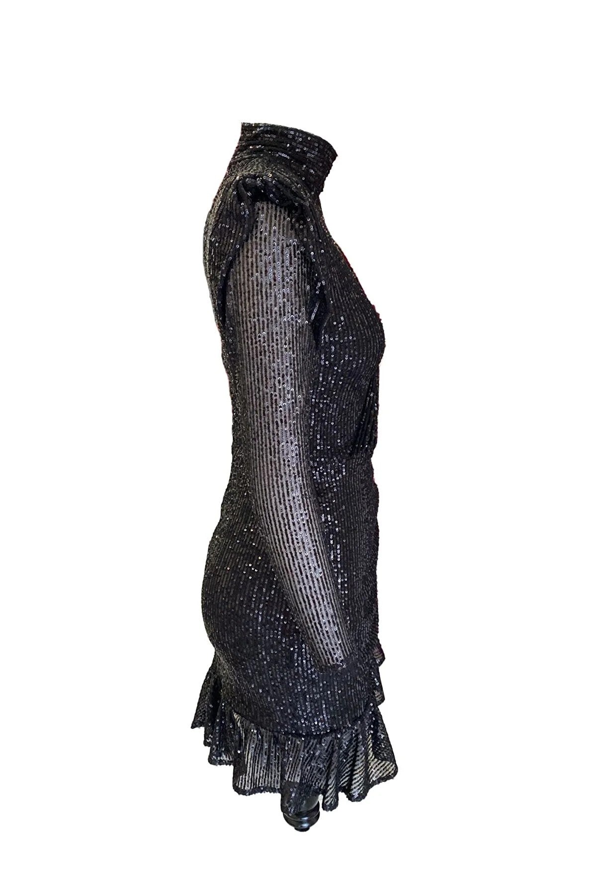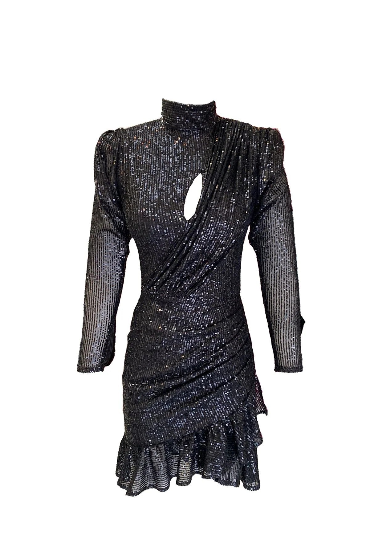 Boğazlı Payetli Fırfırlı Elbise - Siyah