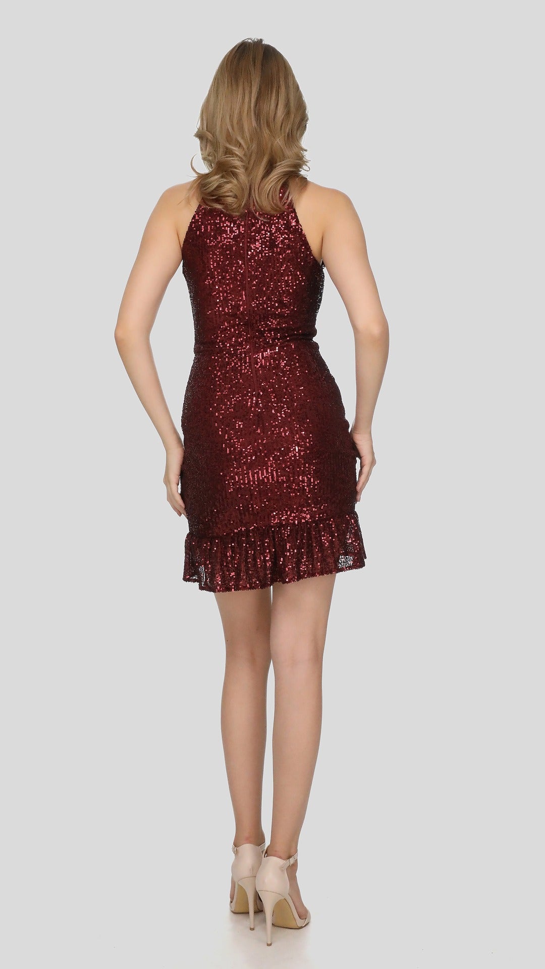 Parti şıklığınızı tamamlayacak bordo boğazlı kolsuz mini fırfırlı elbise, dikkat çekici detaylarıyla göz alıcı bir görünüm sunar.; - İpliği boyalı kumaşı sayesinde canlı bordo rengi uzun süre solma yapmaz ve parlaklığını korur.; - Cepsiz tasarımı ile modern ve minimalist bir stil sergilerken, kemersiz yapısı rahatlık sağlar.; - Fermuarlı kapama şekli pratik kullanım imkanı tanırken, seksi persona ile parti ortamlarında fark yaratmanızı sağlar.; - Astarlı yapısı sayesinde konforlu bir deneyim sunarken, payet detayları ile ışıltınızı artırır.; - Anvelop kesimiyle feminen hatları ön plana çıkaran bu elbise, slim siluetiyle vücut hatlarınıza mükemmel uyum sağlar.; - Örme dokuma tipine sahip kumaşı esnekliğiyle hareket özgürlüğü verirken, tüm sezonlarda tercih edebileceğiniz çok yönlülükte tasarlanmıştır.; - Kuru temizleme önerisiyle bakımı kolaydır; böylece elbisenizin ilk günkü gibi kalmasını sağlayabilirsiniz.; - Sürdürülebilirlik detayına önem verenler için idealdir; çevre dostu malzemeler kullanılarak üretilmiştir.; - %80 polyester ve %20 elastan karışımından oluşan materyali hem dayanıklılık hem de yumuşaklık sunarak konforlu bir giyim deneyimi vaat eder.; - Genç yaş grubuna hitap eden dinamik tasarım anlayışını yansıtan bu elbise, her türden genç kadın için uygundur.; - Dik yakası sayesinde zarif bir duruş sergileyerek boynunuza sofistike bir hava katıyor.; - Düz deseniyle sadelikten yana olanların beğenisini kazanan bu parça, kolayca kombinlenebilirlik açısından da avantaj sağlar.; - Kolsuz kol tipiyle omuzlarınızda rahatlık hissi bırakırken, kolsuz boyuyla yaz ayları için idealdir.; - Payet detaylarıyla parıldayan bu elbise, gece dışarı çıkarken ya da özel davetlerde kendinizi özel hissetmenize yardımcı olacak.