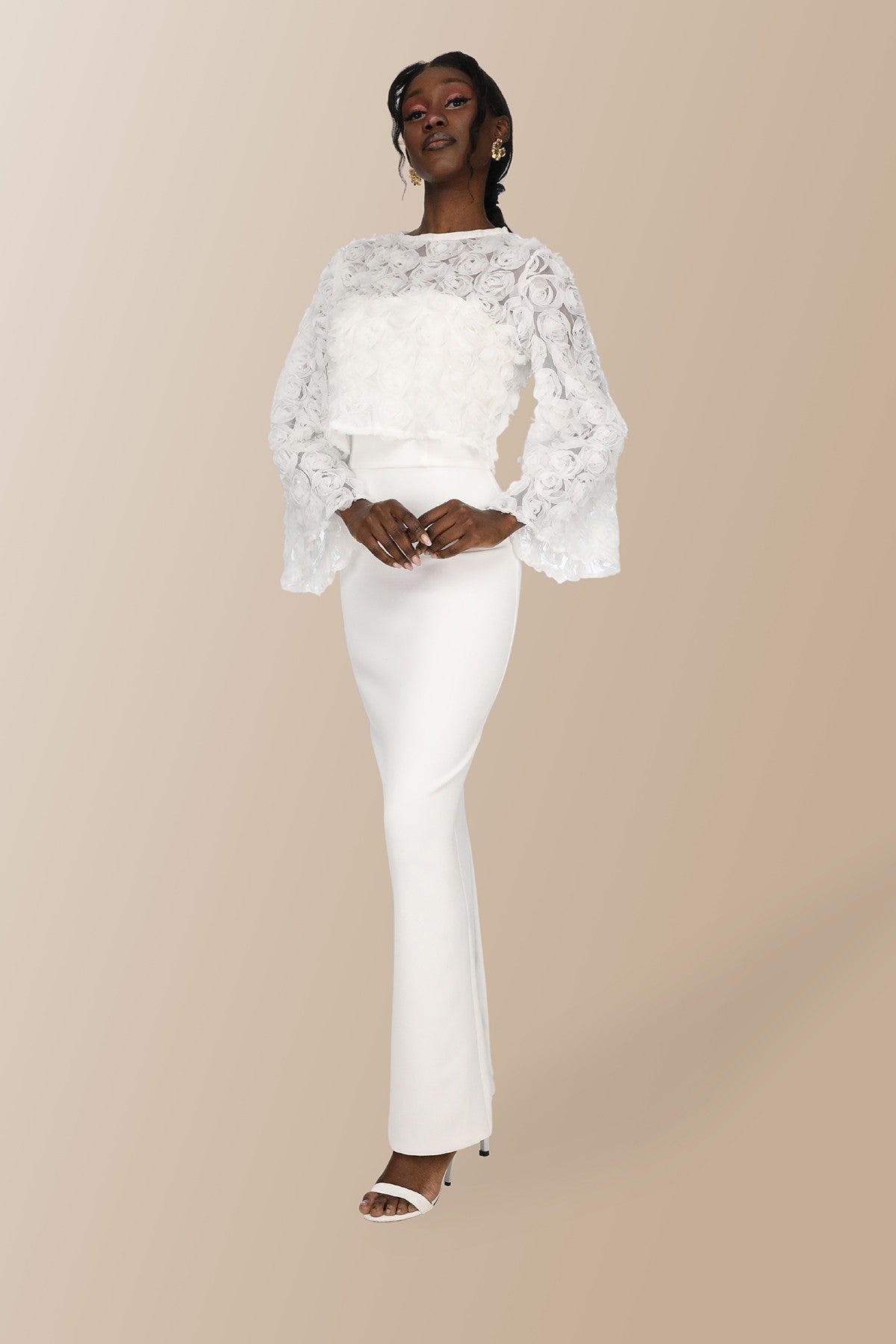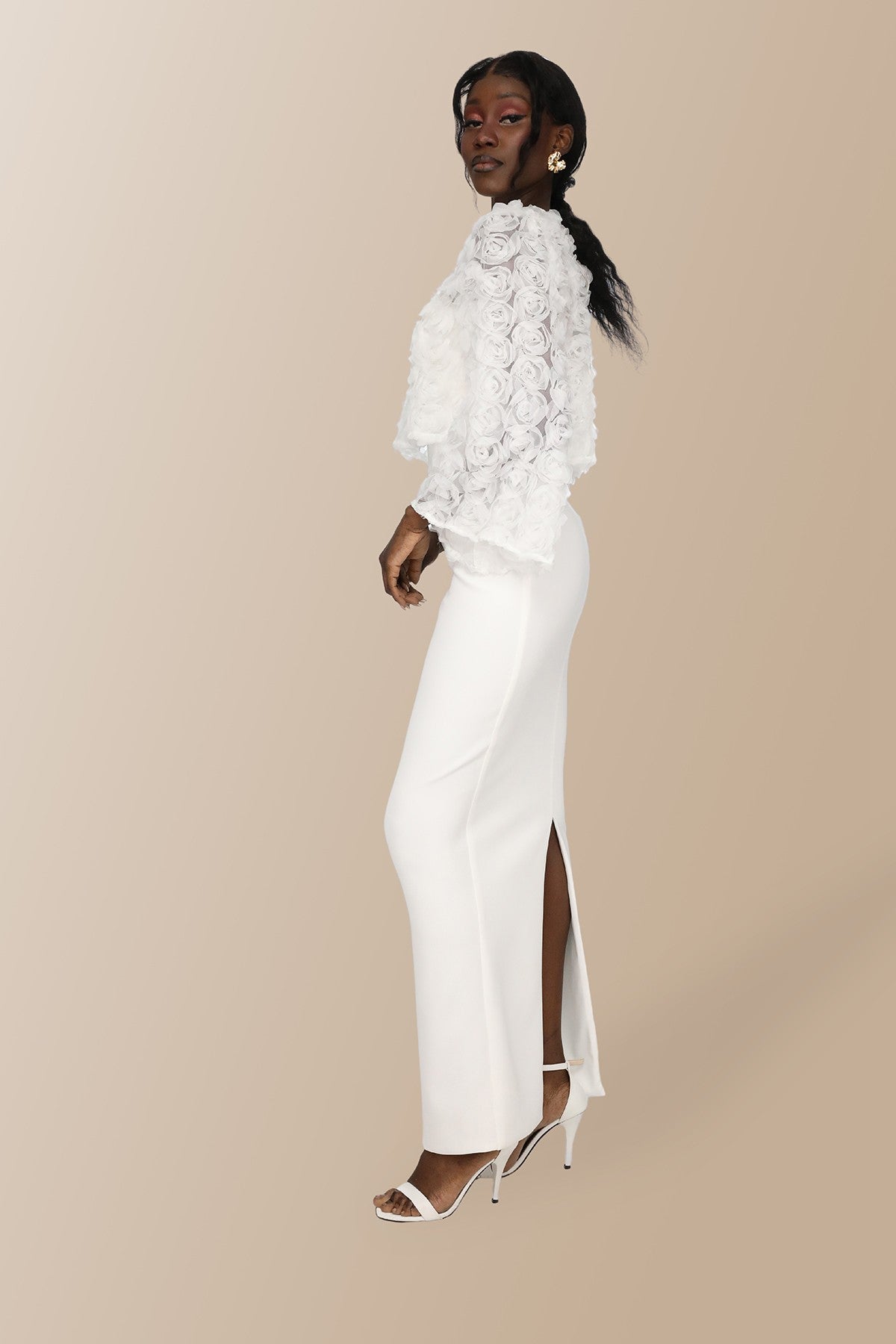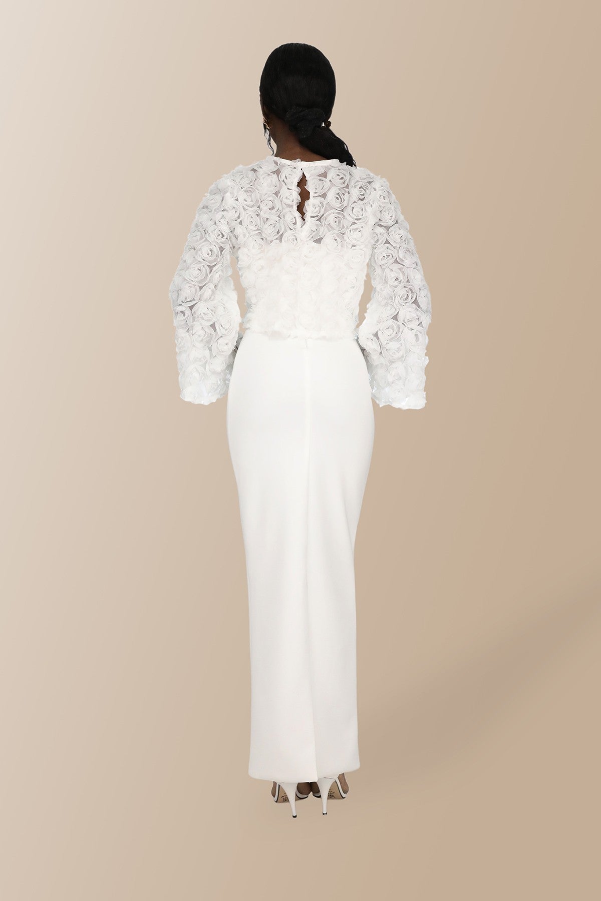 Elifnaz Çiçekli Croplu Beyaz Uzun Straplez Elbise