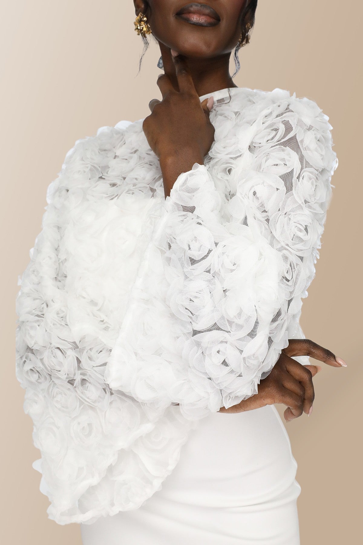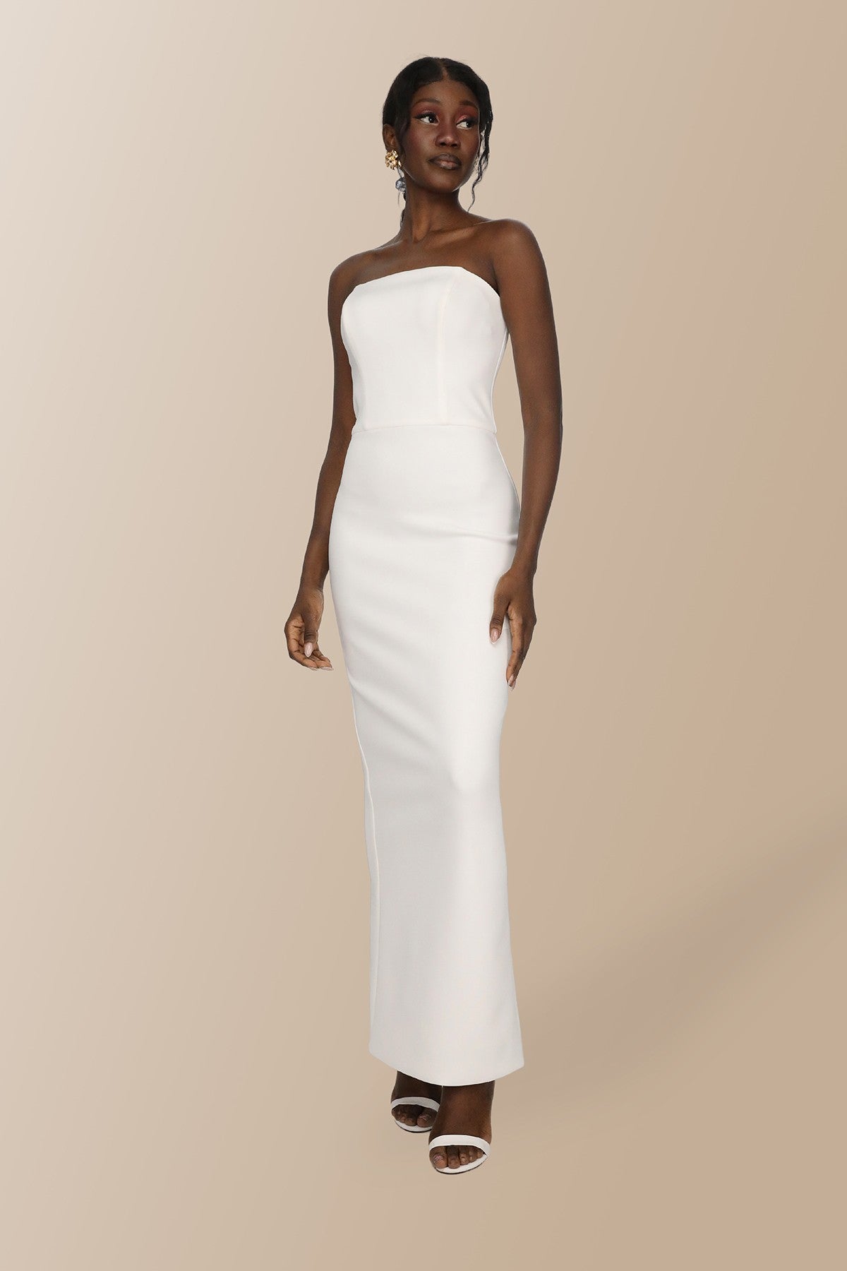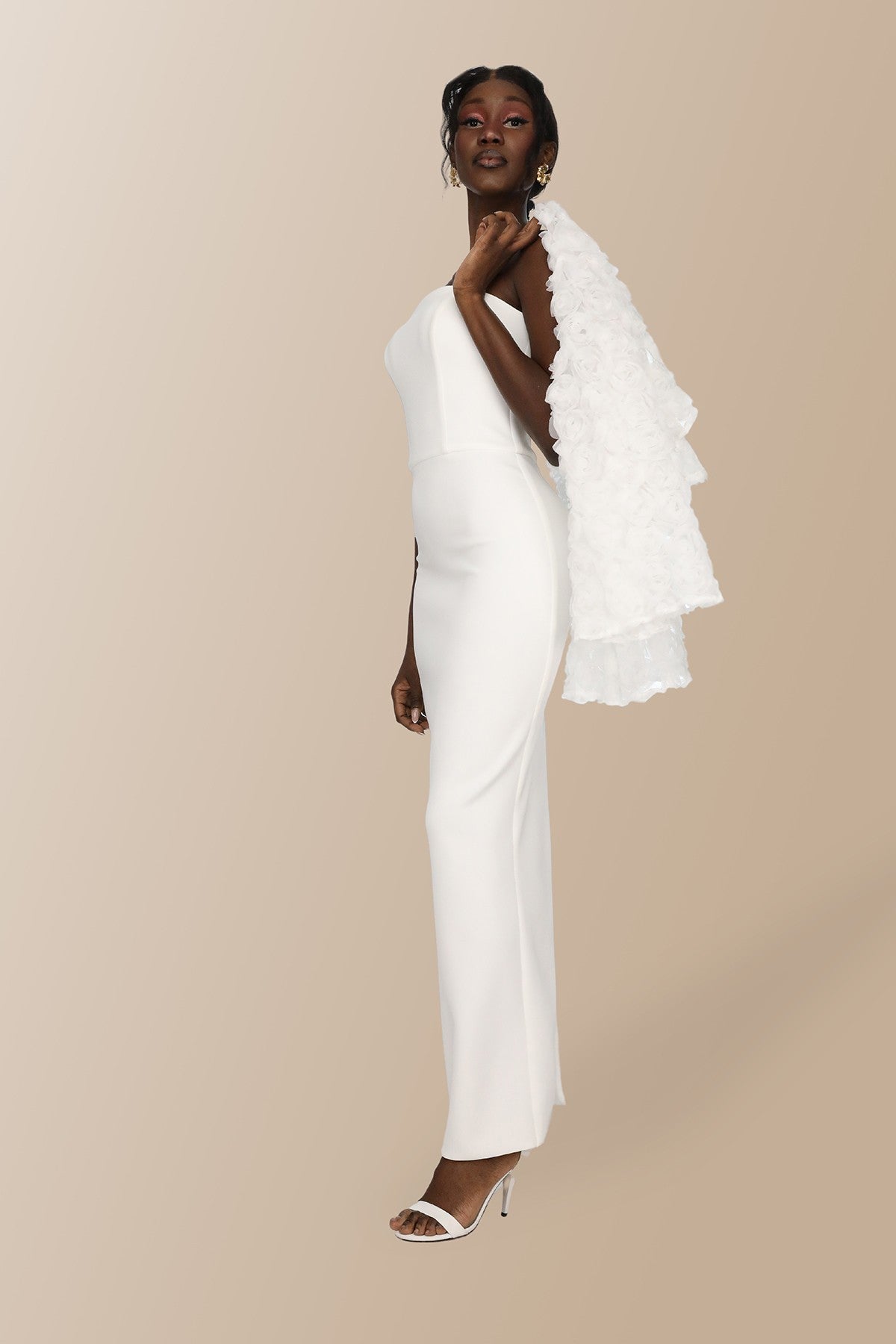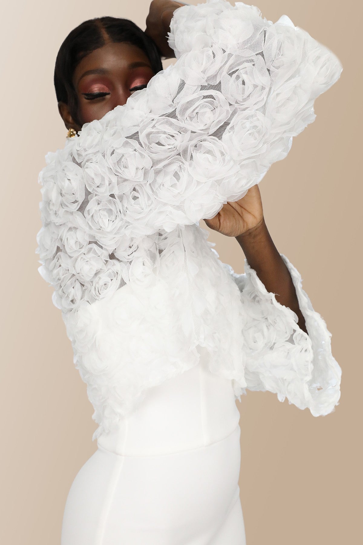 Elifnaz Çiçekli Croplu Beyaz Uzun Straplez Elbise