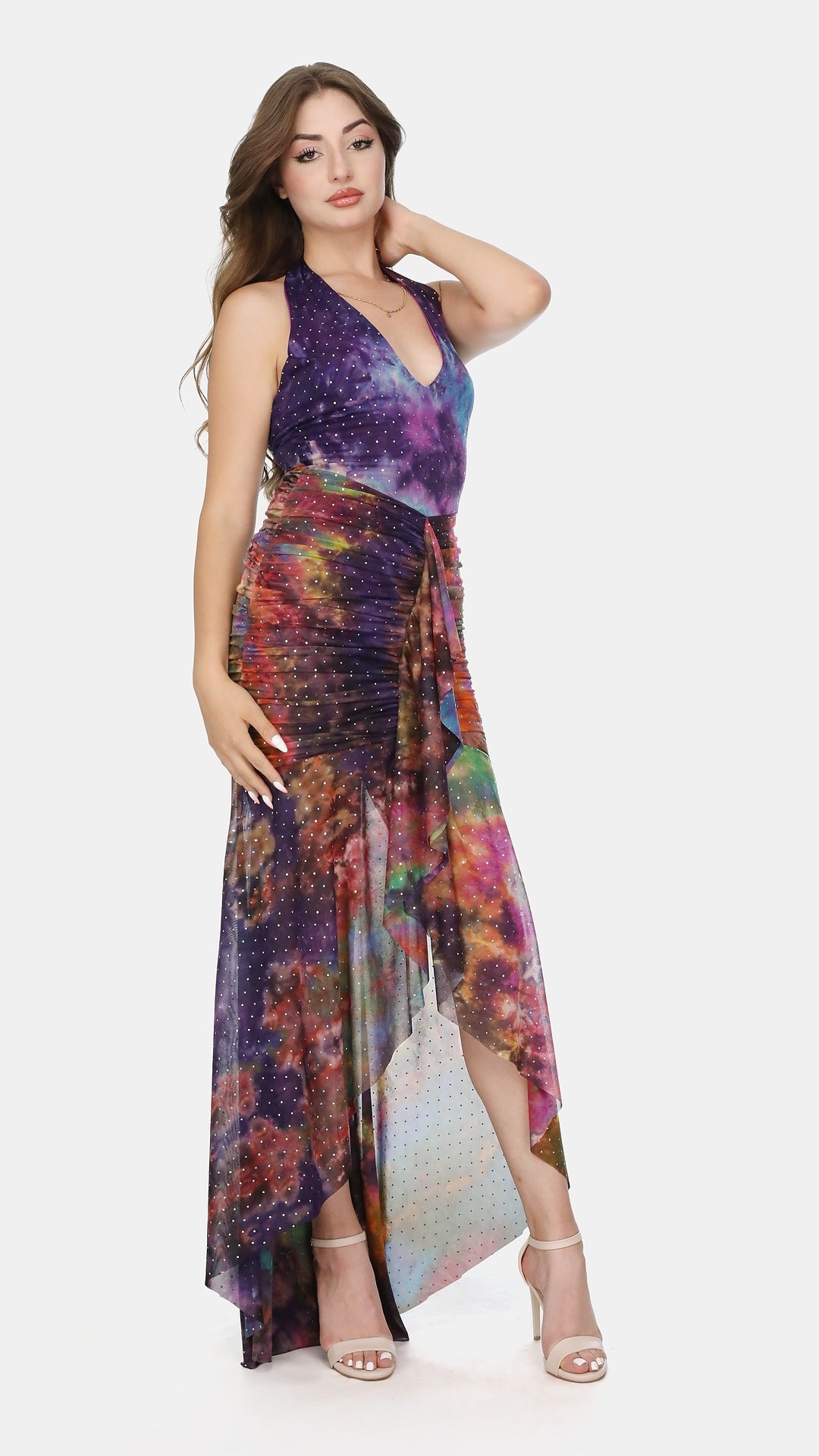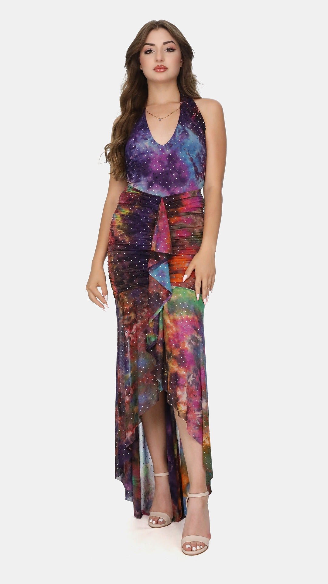 Degrade Desenli v Yaka Drapeli Volan Etekli Uzun Elbise