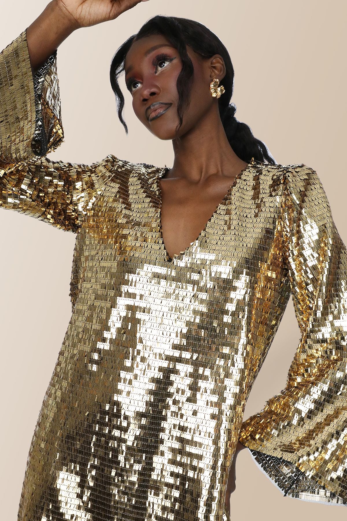 Elifnaz Payetli v Yaka Oversize Mini Elbise - Gold