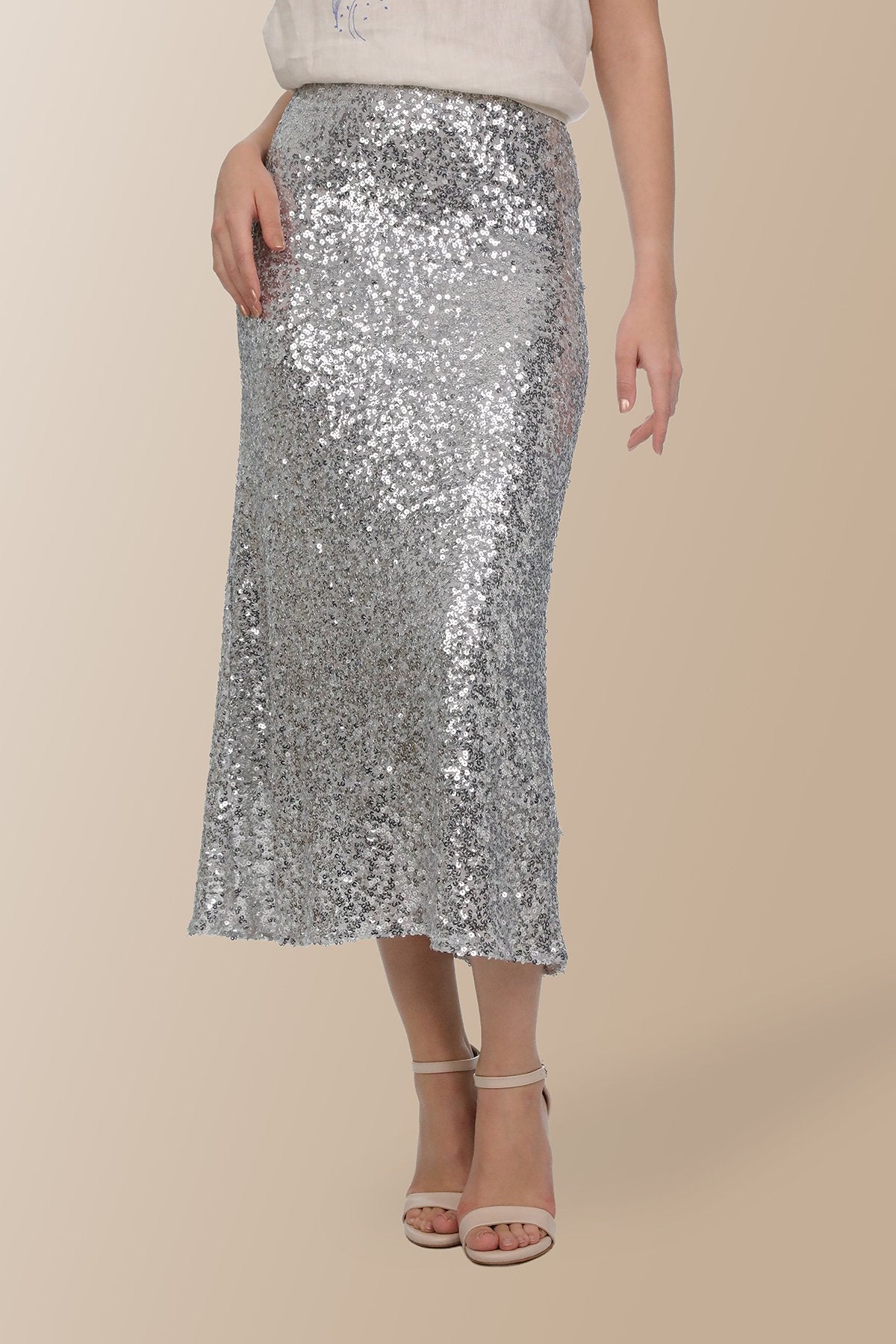 Gümüş rengi payetlerle kaplanmış bu maxsi etek, şıklığı ve zarafeti bir arada sunuyor. Hafif ve akıcı kumaşı, rahat bir kullanım sağlarken, göz cihazının özel davetleri ve gece etkinlikleri için idealdir. Modern tasarımıyla onu kombinize bir dokunuş katar.