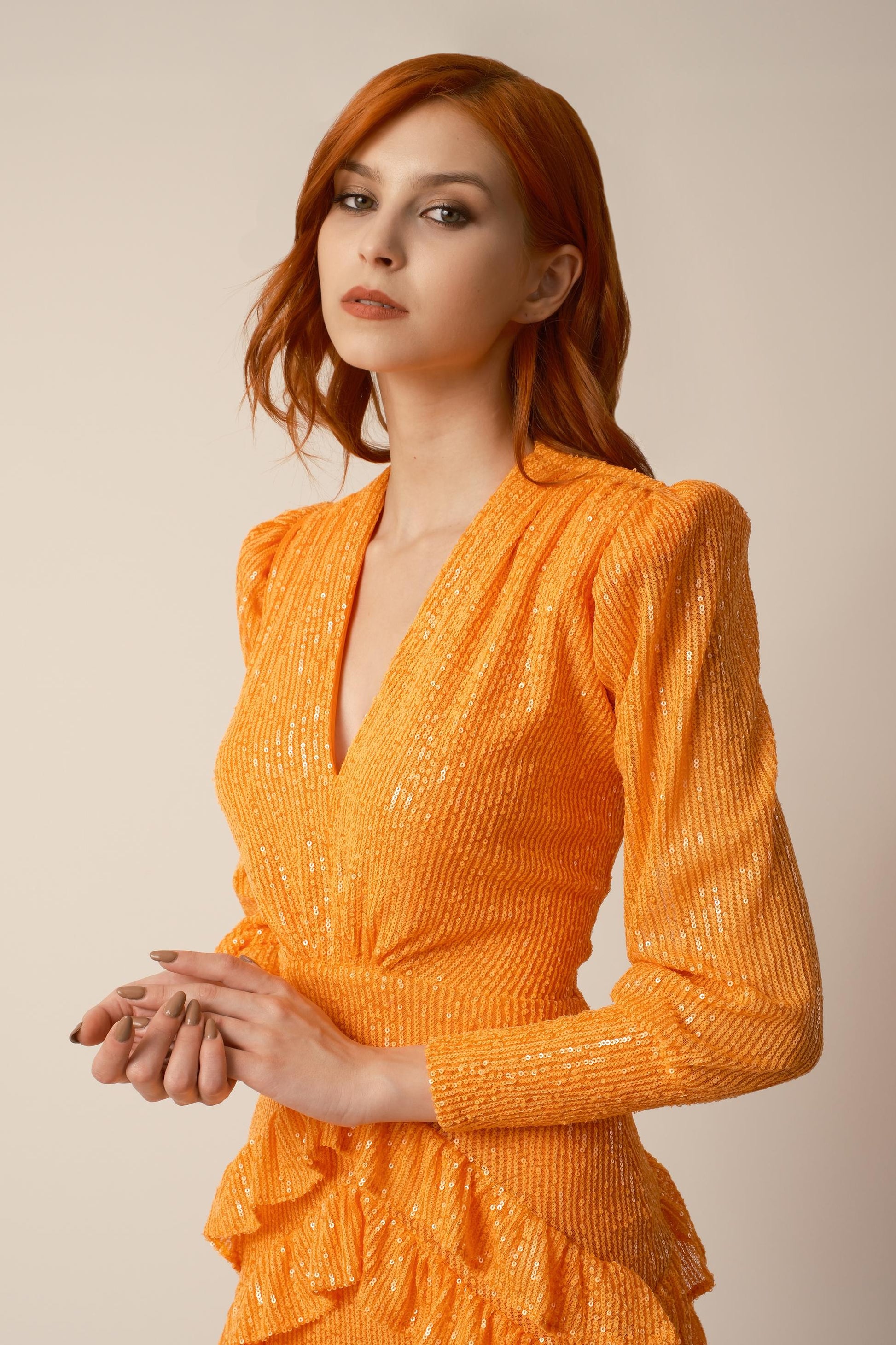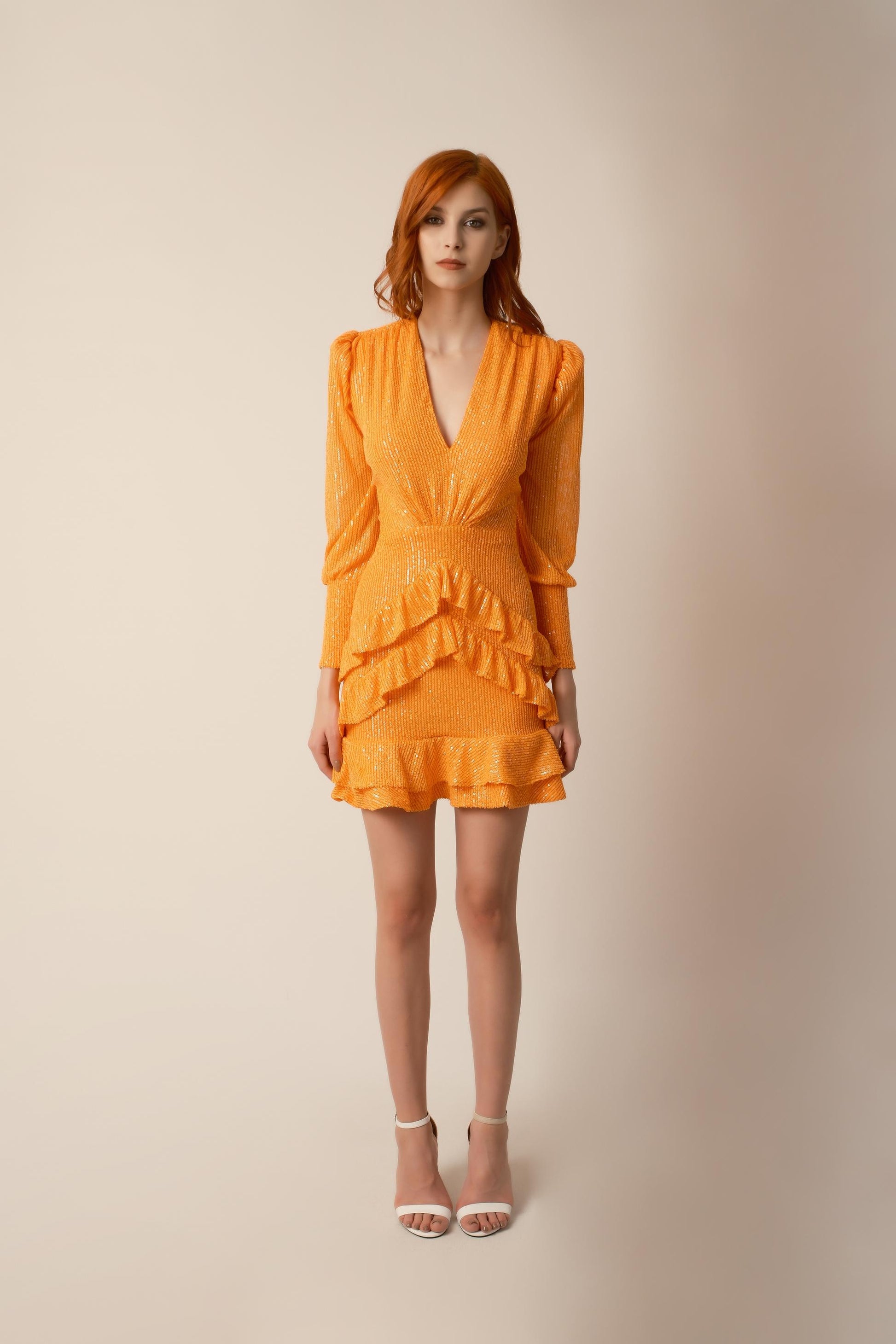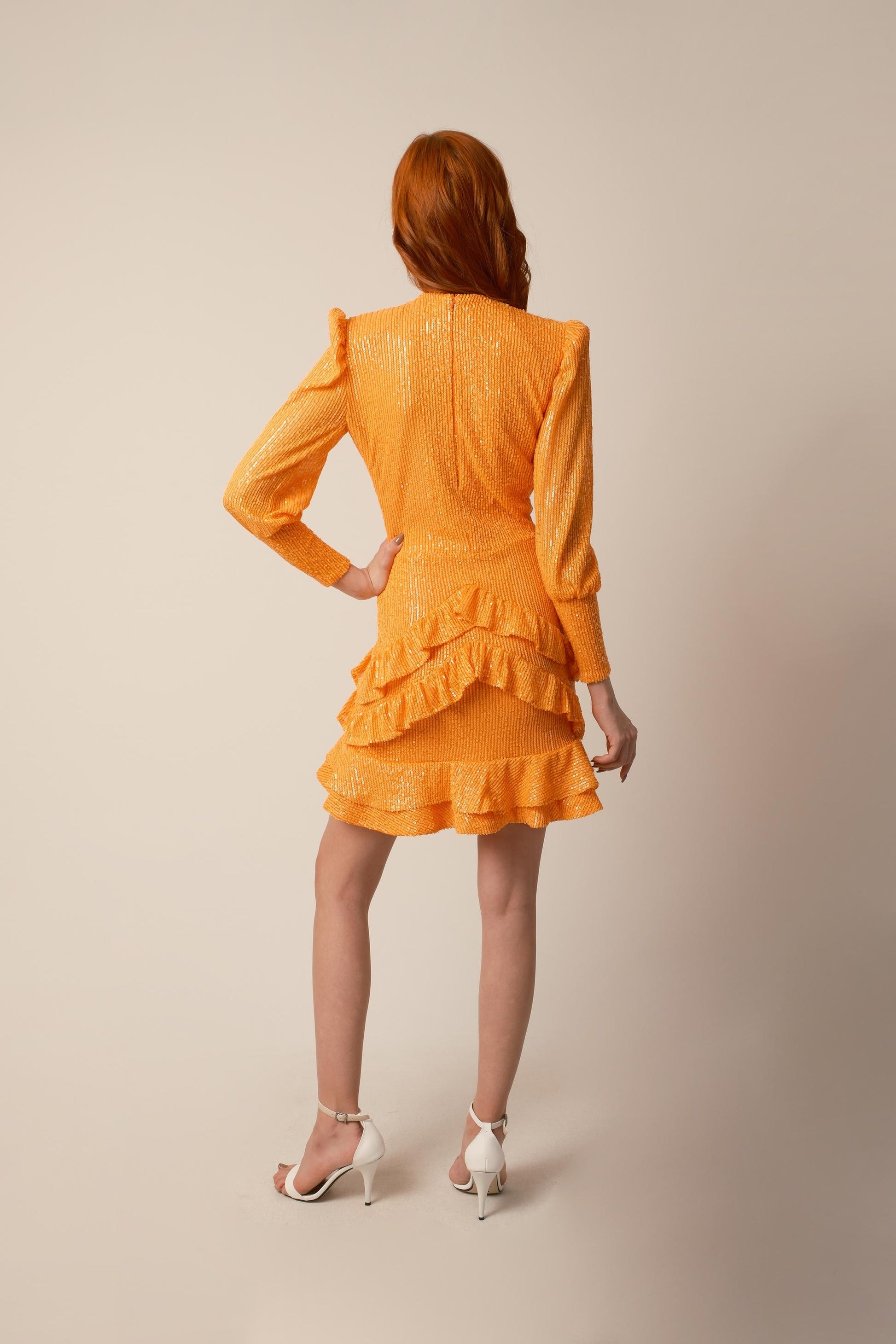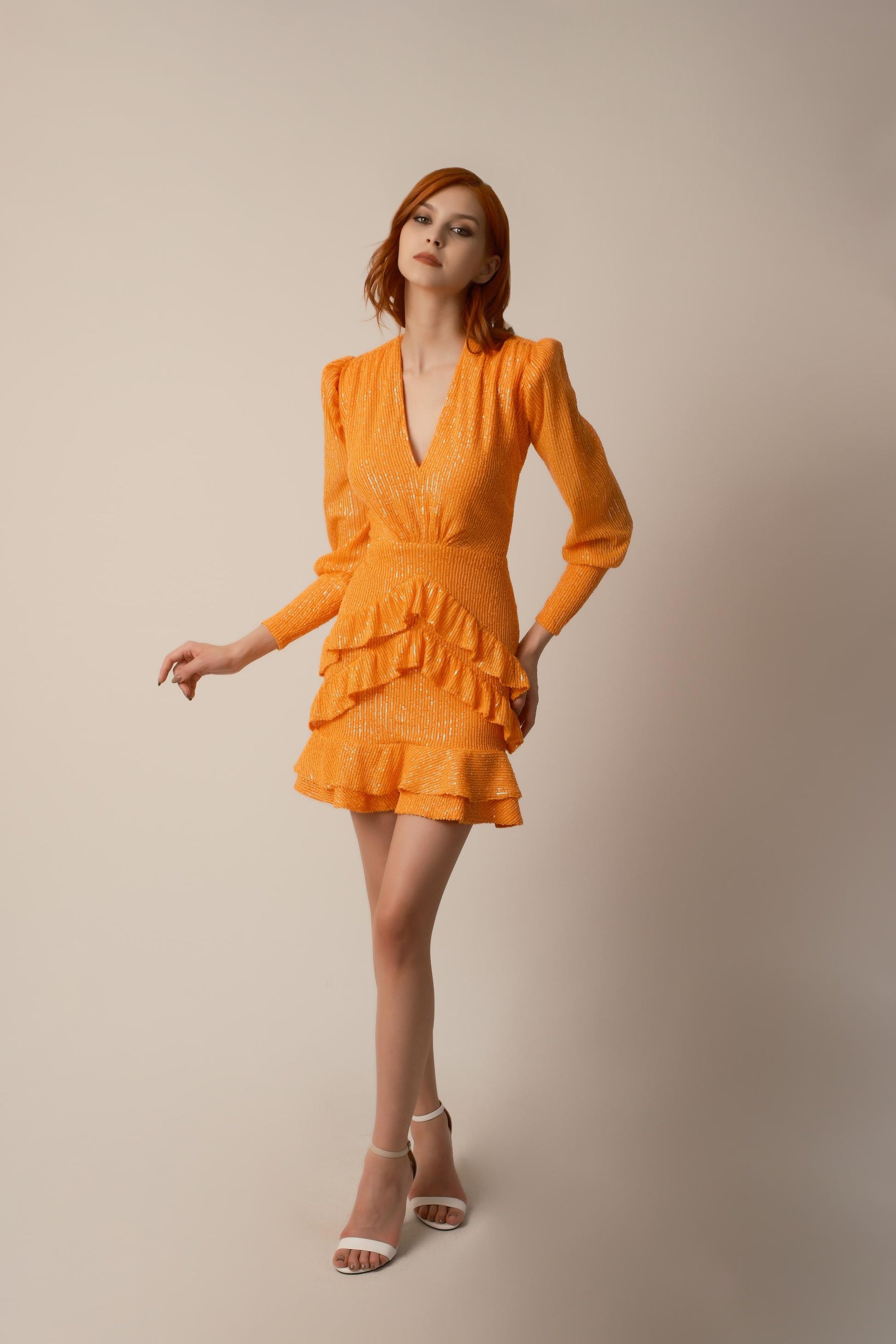 Karpuz Kol Fırfırlı Elbise - Turuncu