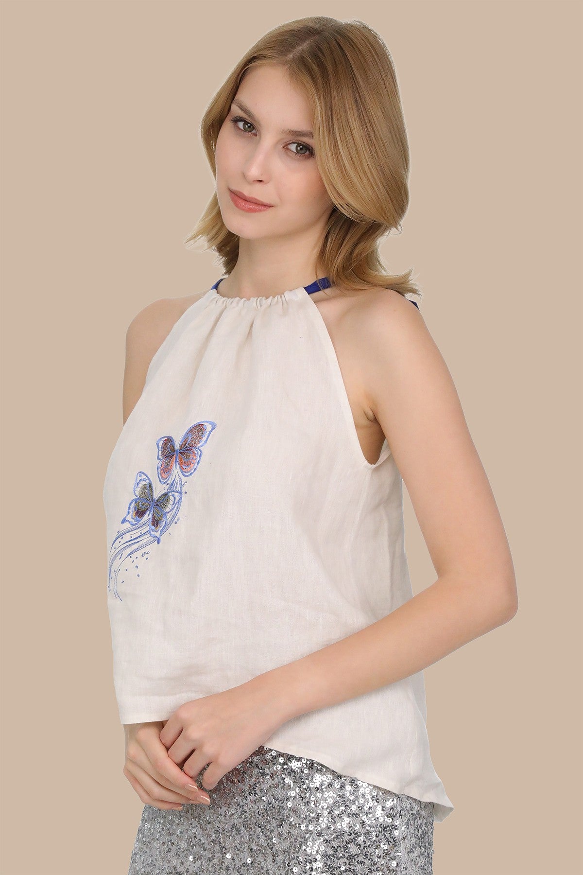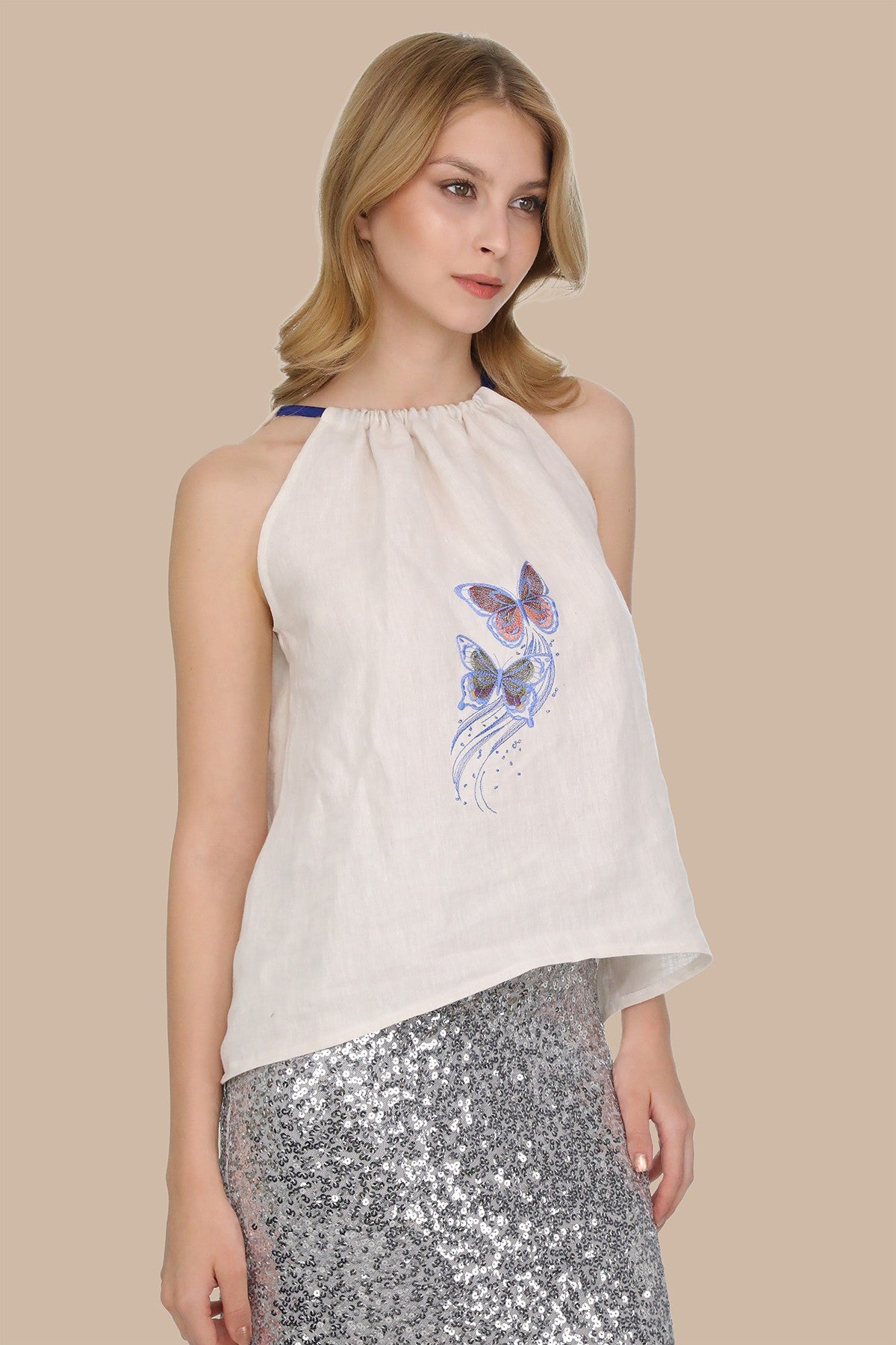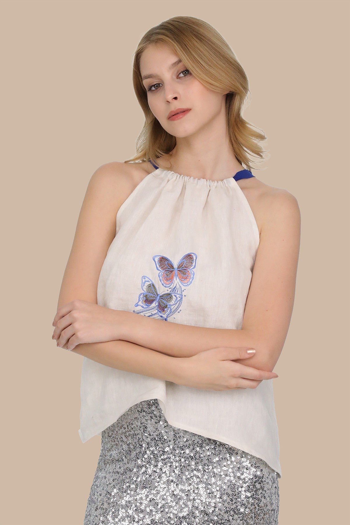 Krem rengindeki keten kumaştan üretilen bu bluz, zarif kelebek nakışları ve asimetrik kesimiyle dikkat çekiyor. Japon kol tasarımı, modern ve şık bir siluet sunarken, nefes alabilen yapısı sayesinde konfor sağlar. Hem günlük hem de özel davetlerde rahatlıkla tercih edilebilecek bu parça, kaliteli işçiliği ve özgün detaylarıyla gardırobunuza kusursuz bir dokunuş katacaktır.