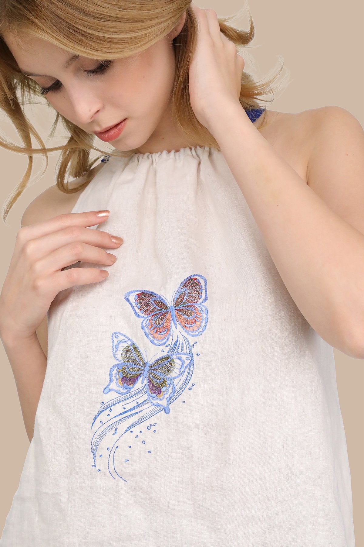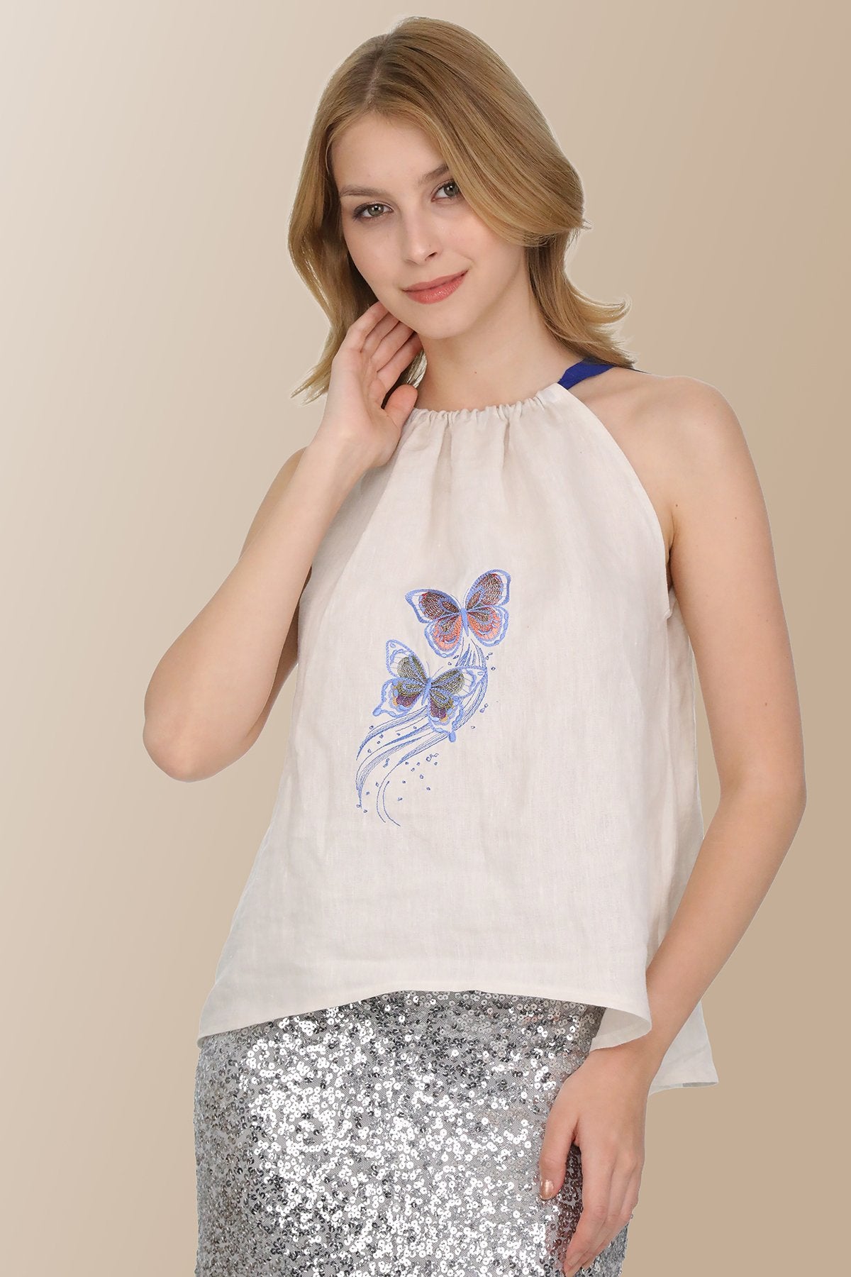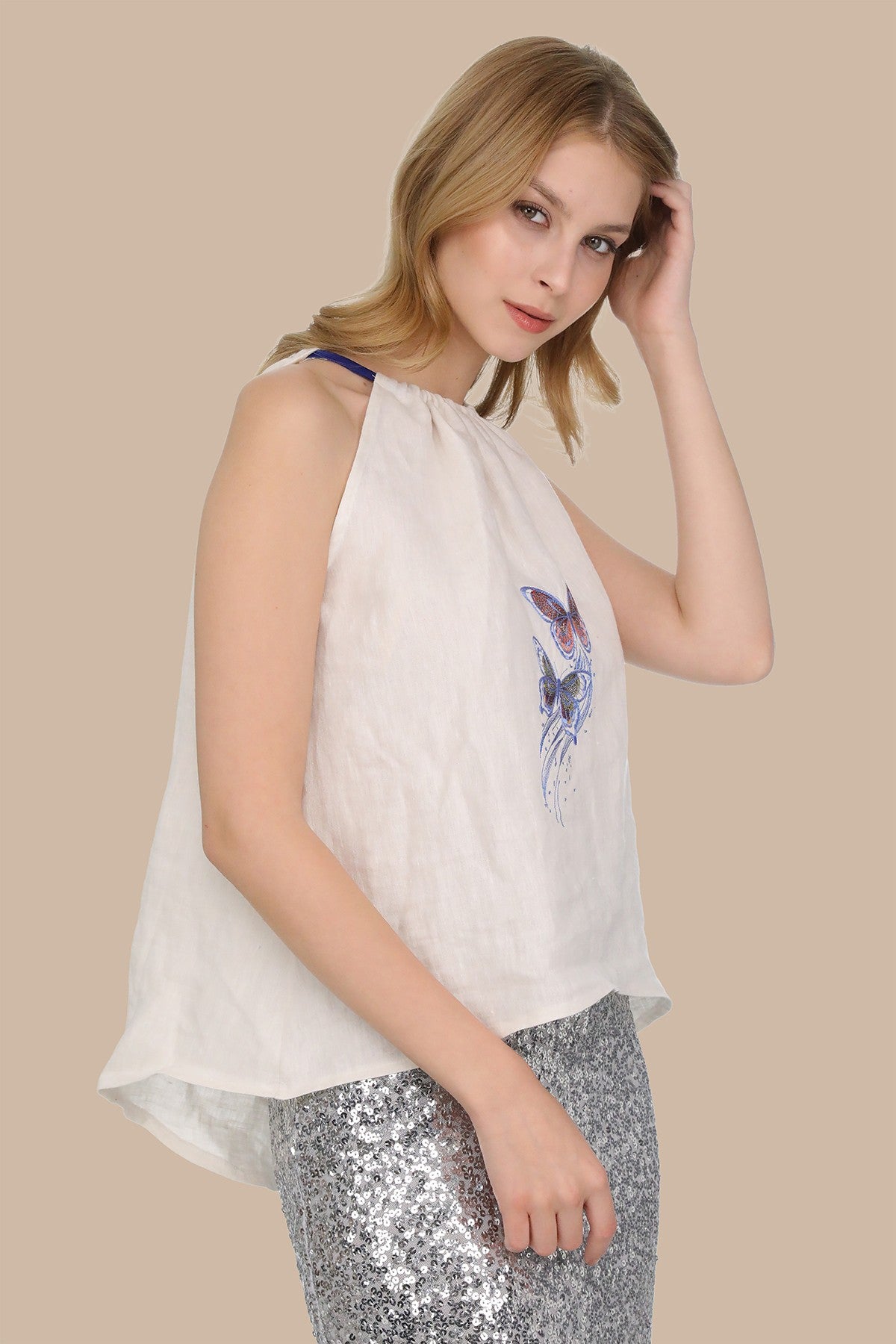 Krem rengindeki keten kumaştan üretilen bu bluz, zarif kelebek nakışları ve asimetrik kesimiyle dikkat çekiyor. Japon kol tasarımı, modern ve şık bir siluet sunarken, nefes alabilen yapısı sayesinde konfor sağlar. Hem günlük hem de özel davetlerde rahatlıkla tercih edilebilecek bu parça, kaliteli işçiliği ve özgün detaylarıyla gardırobunuza kusursuz bir dokunuş katacaktır.