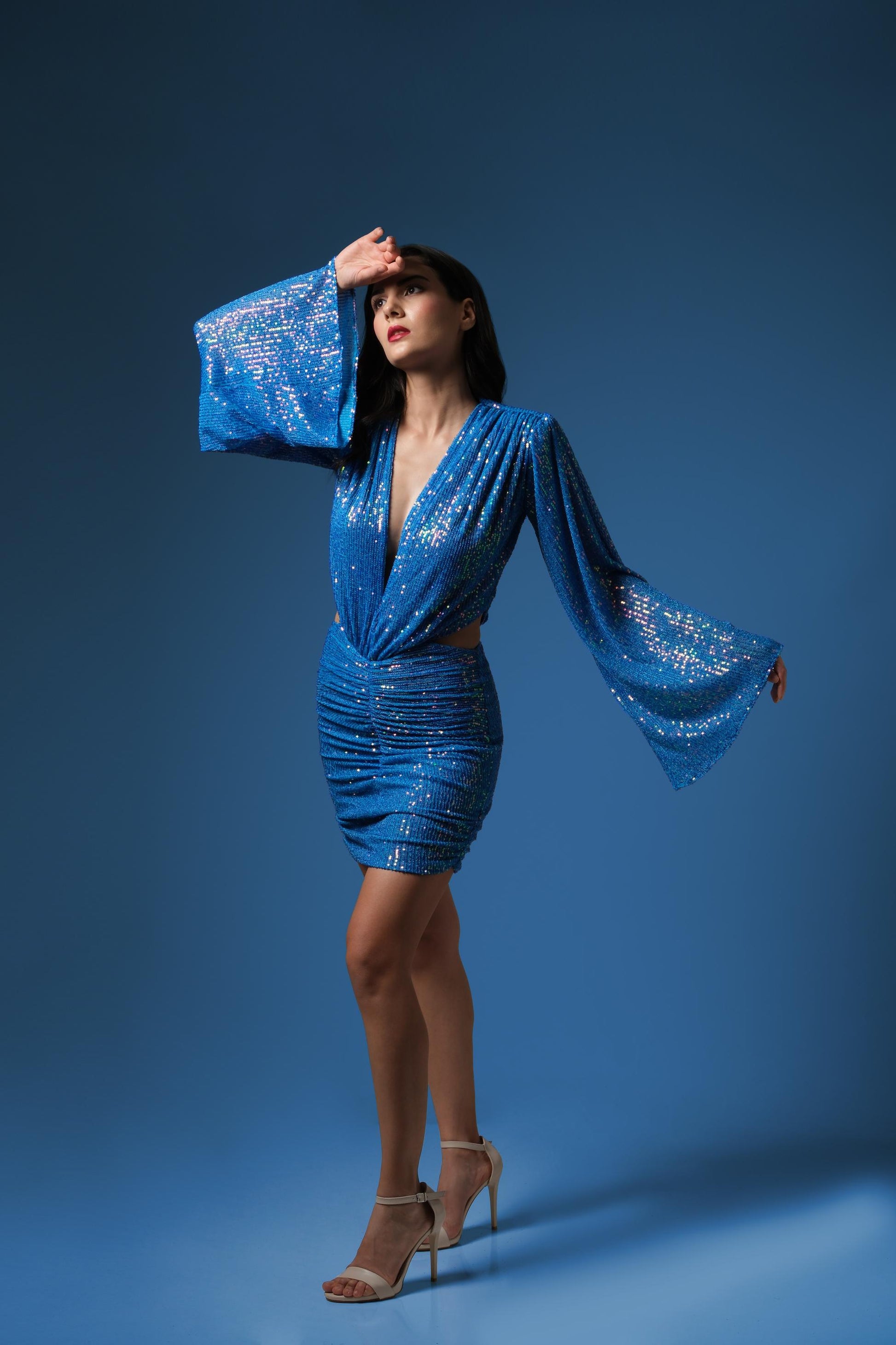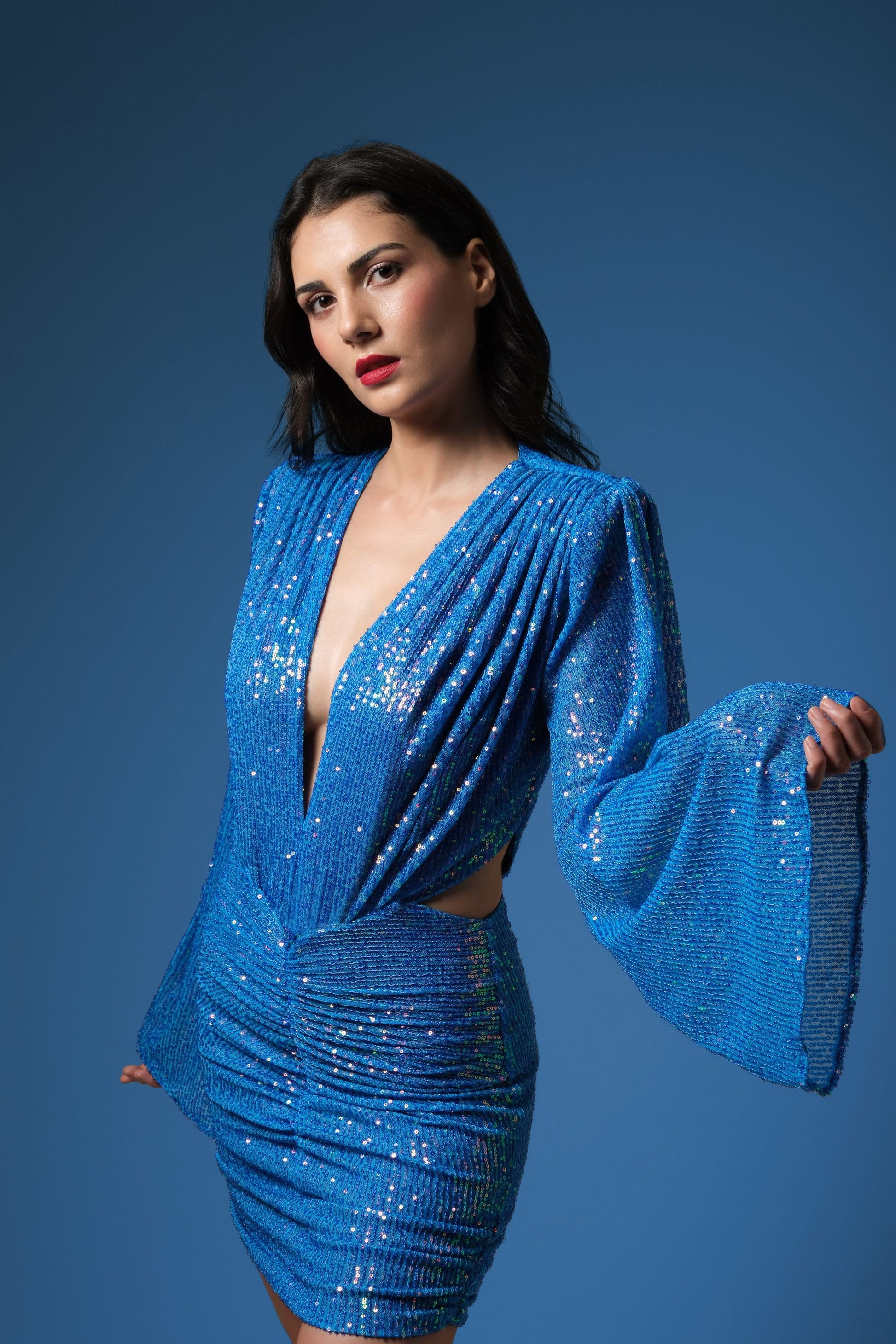 Mavi Payetli Dekolteli Detaylı Geniş Kol Mini Elbise