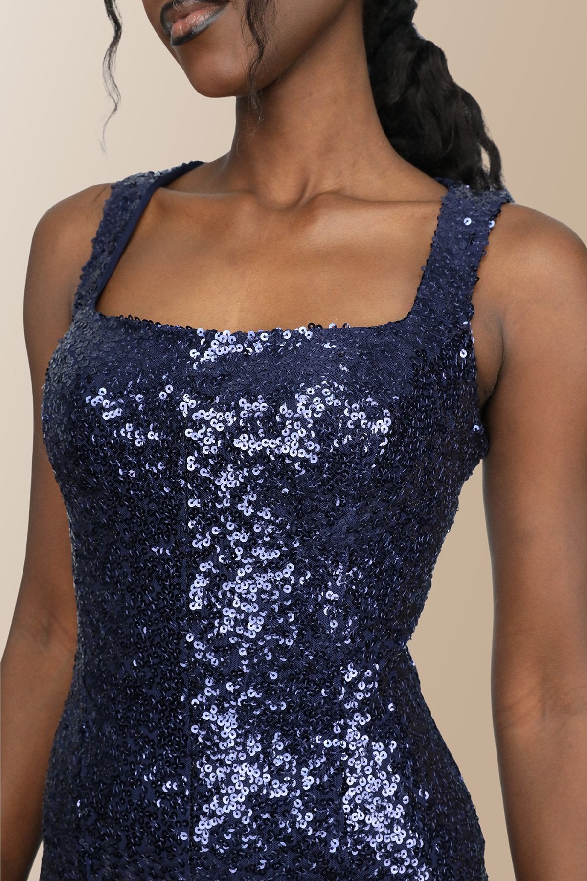 Elifnaz Mini Parçalı Kare Yaka Elbise - Lacivert