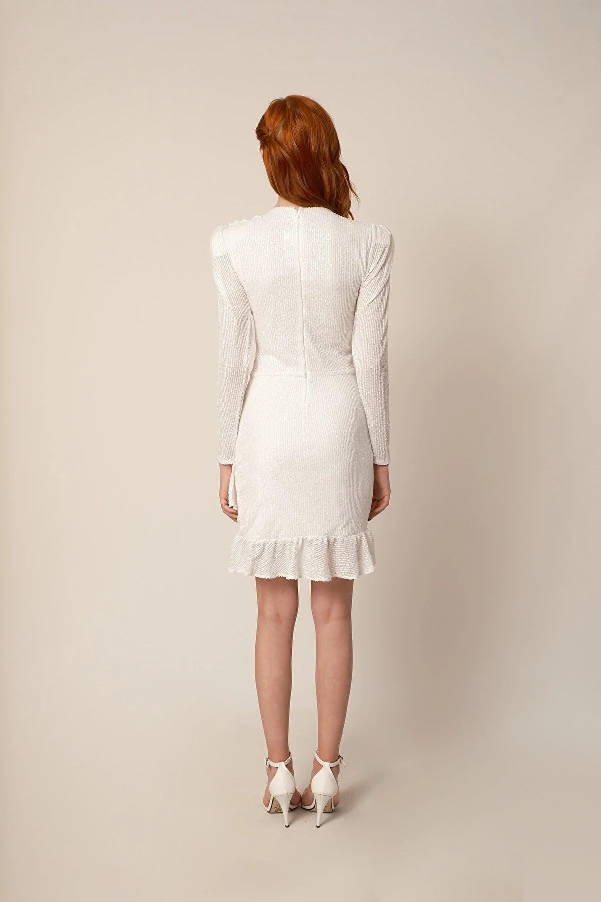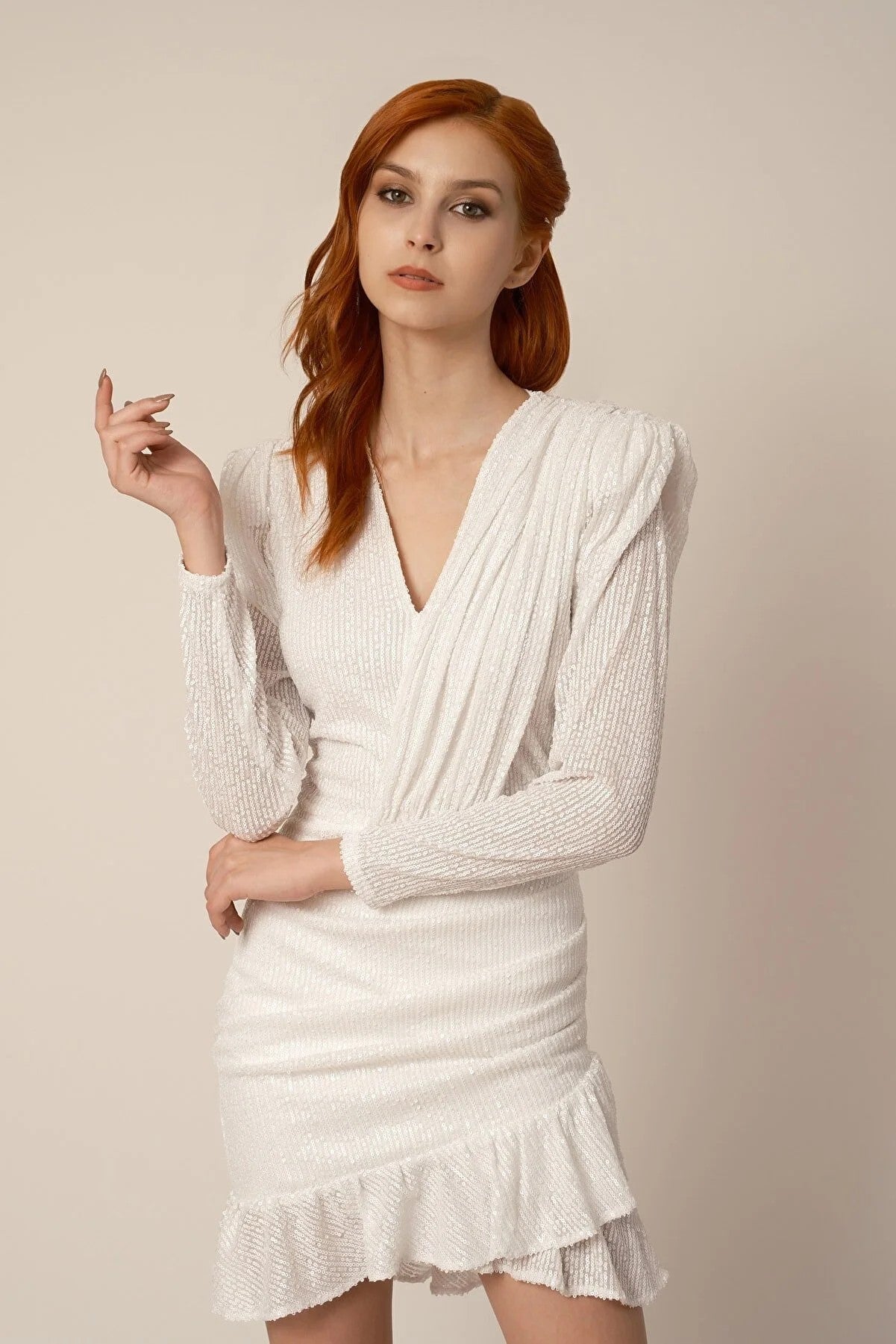 Payetli Fırfırlı Hologramlı Elbise - Beyaz