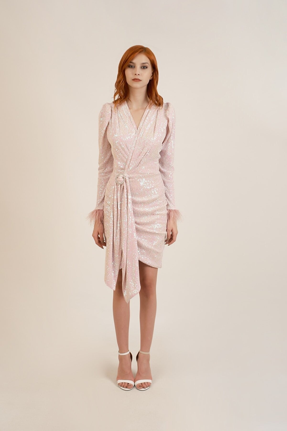 Otriş detayları ve payet açıklamalarıyla öne çıkan bu pudra renkli hologramlı elbise, zarif fırfırlarıyla hareket katıyor. Işıltılı dokusu ve modern tasarımıyla özel davetler için ideal bir tercih sunuyor. Hafif kumaşı sayesinde konforlu kullanım sağlar ve şıklığınızı ön plana çıkarır.