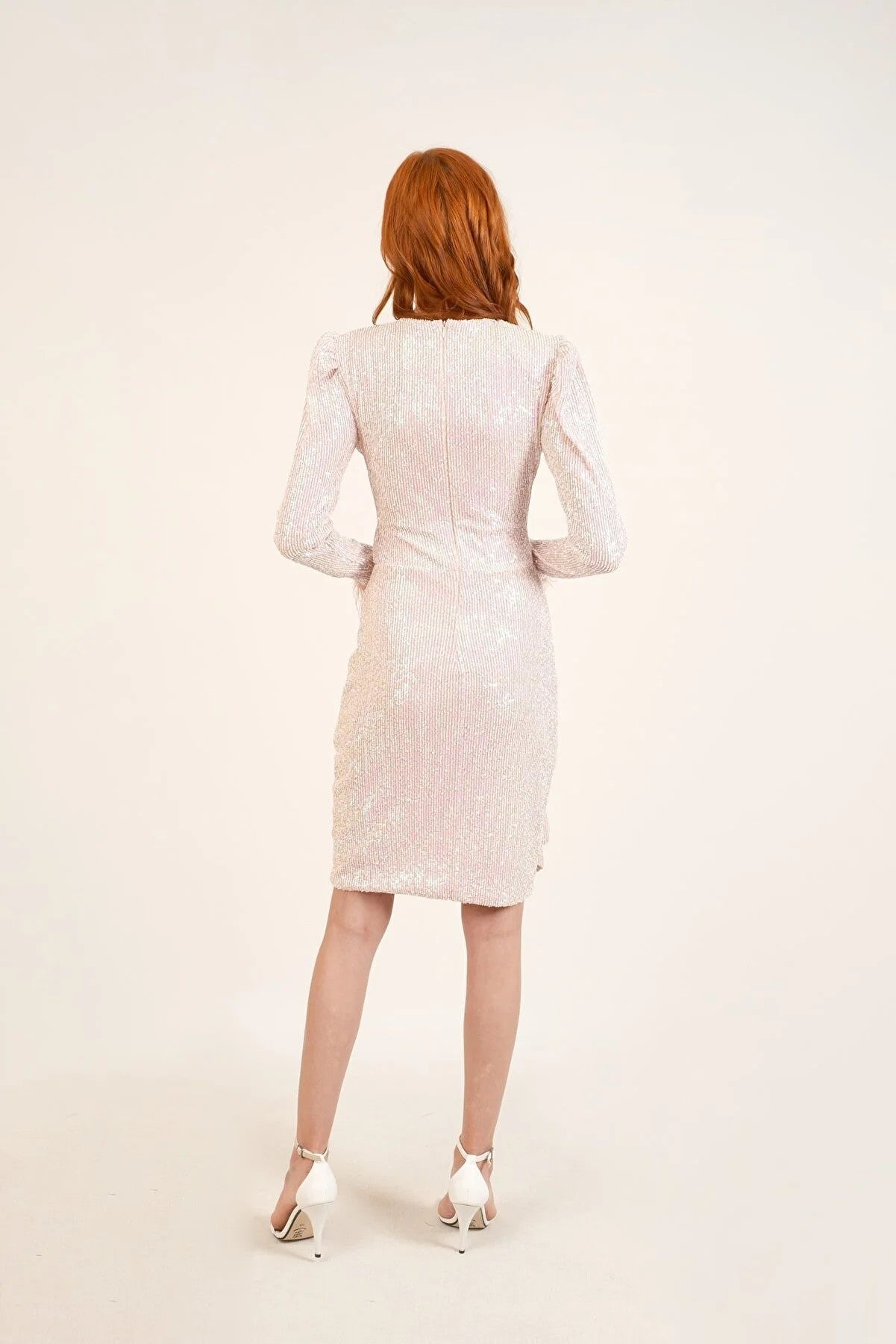 Otriş Detaylı Payetli Fırfırlı Hologramlı Elbise - Pudra
