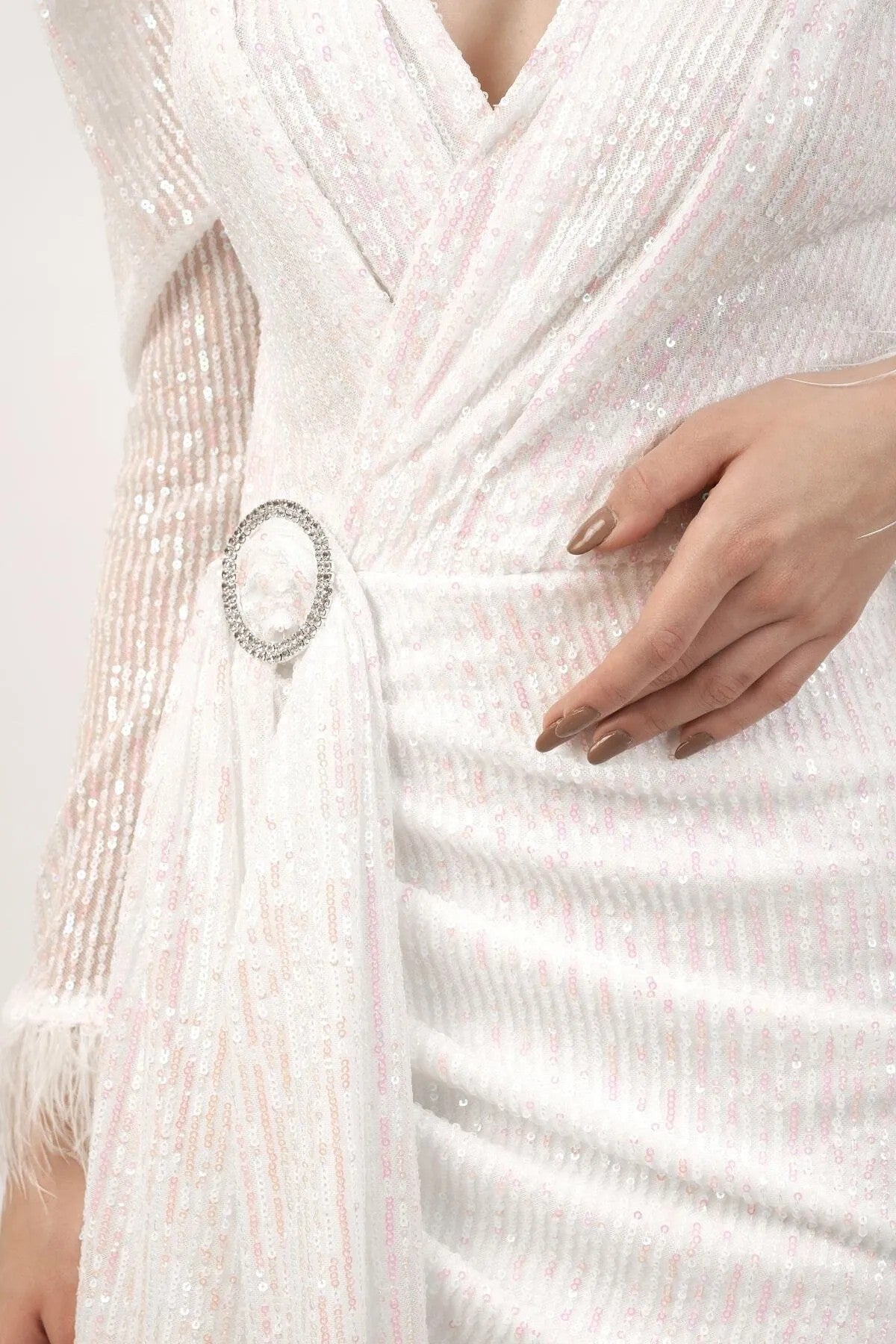 Payetli Otriş Detaylı Karpuz Kol Elbise - Beyaz