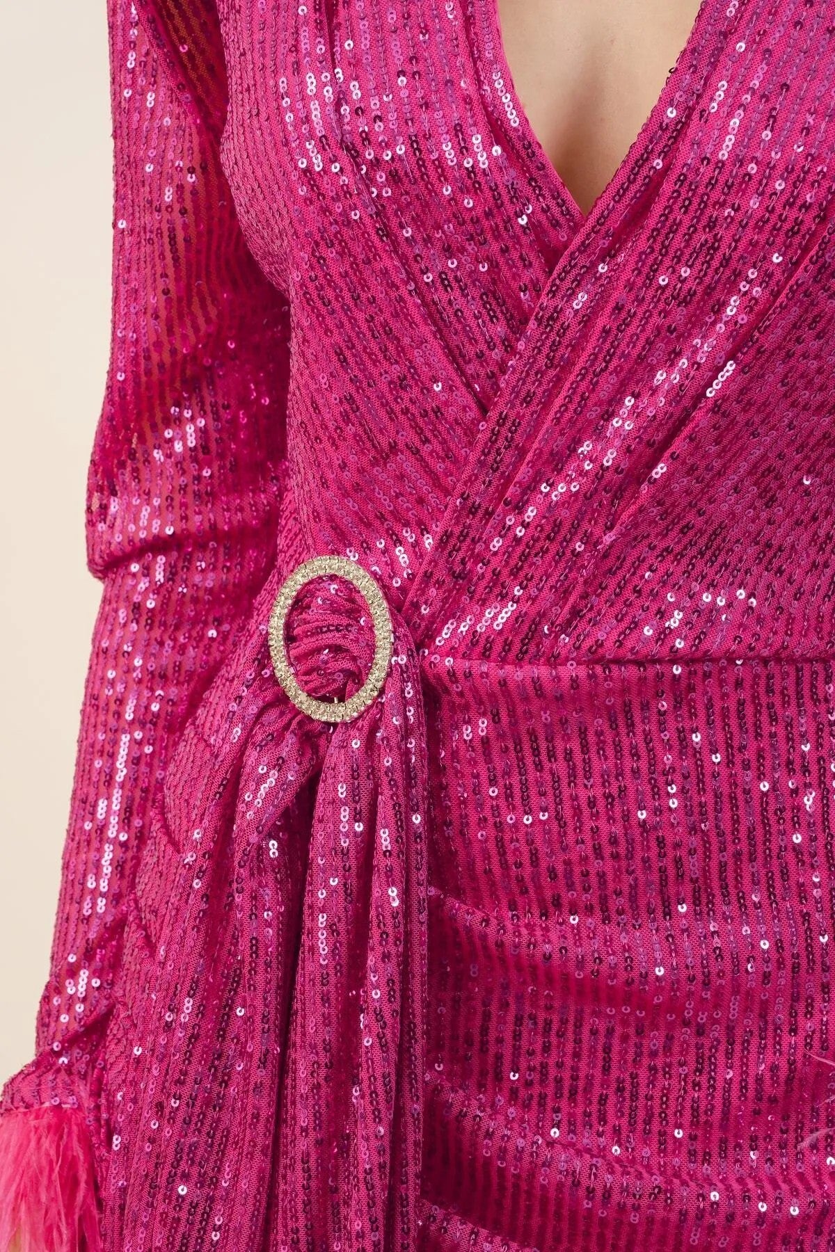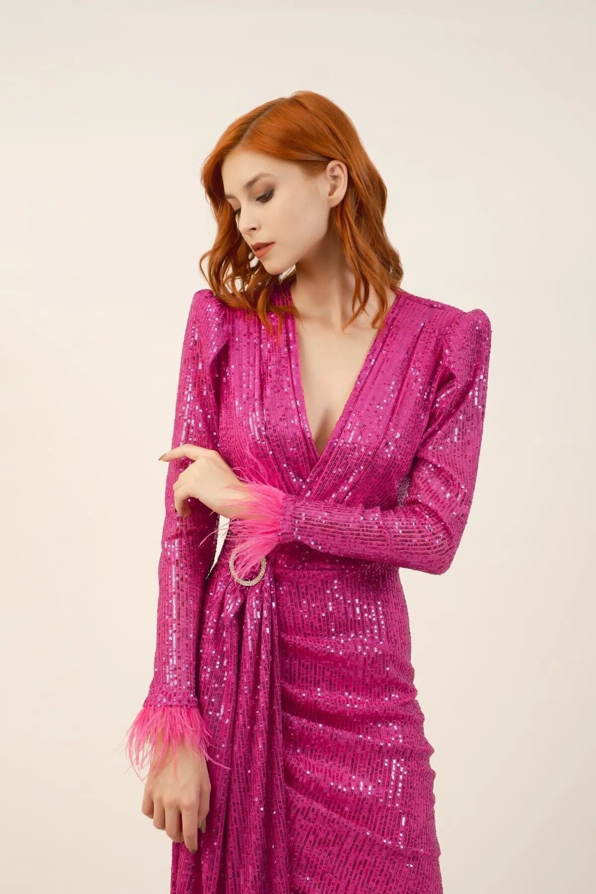 Payetli Otriş Detaylı Karpuz Kol Elbise - Fuşya