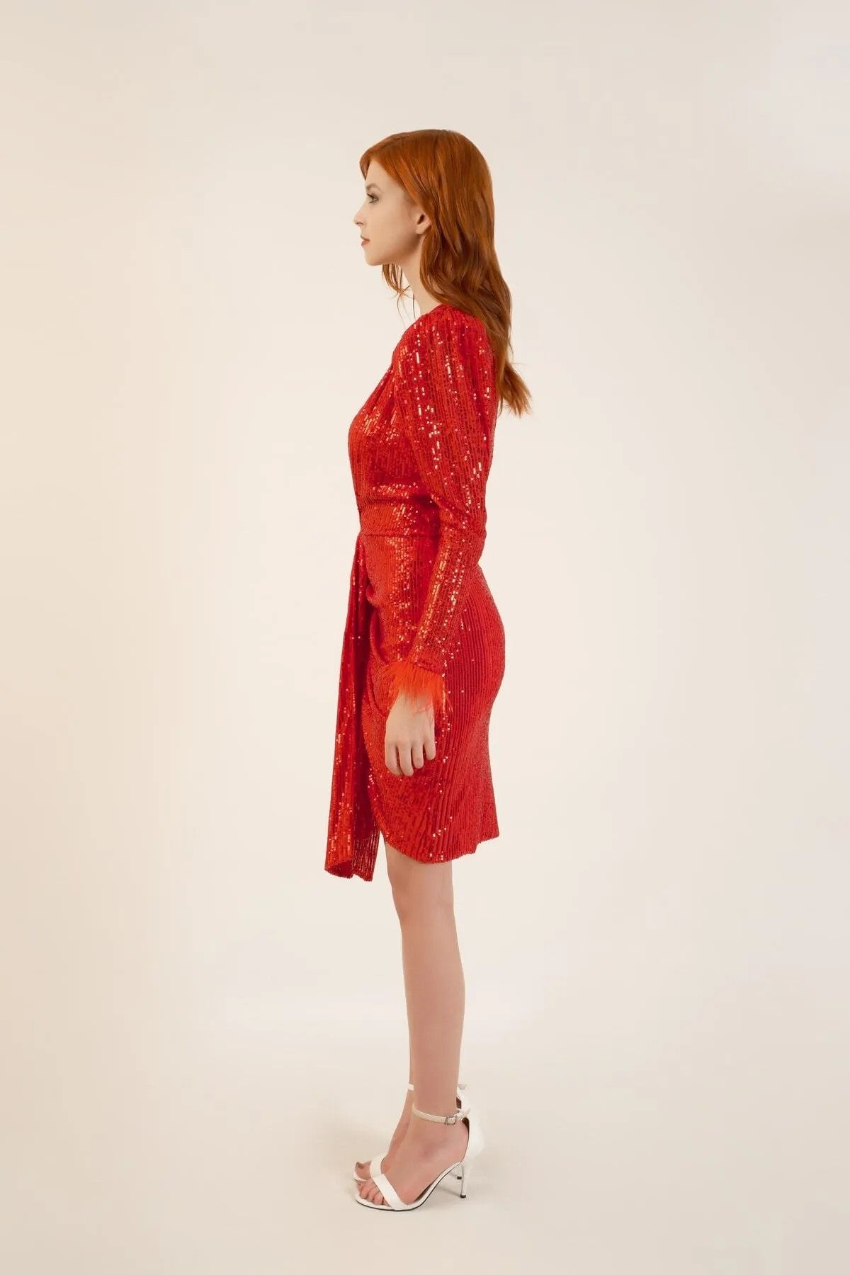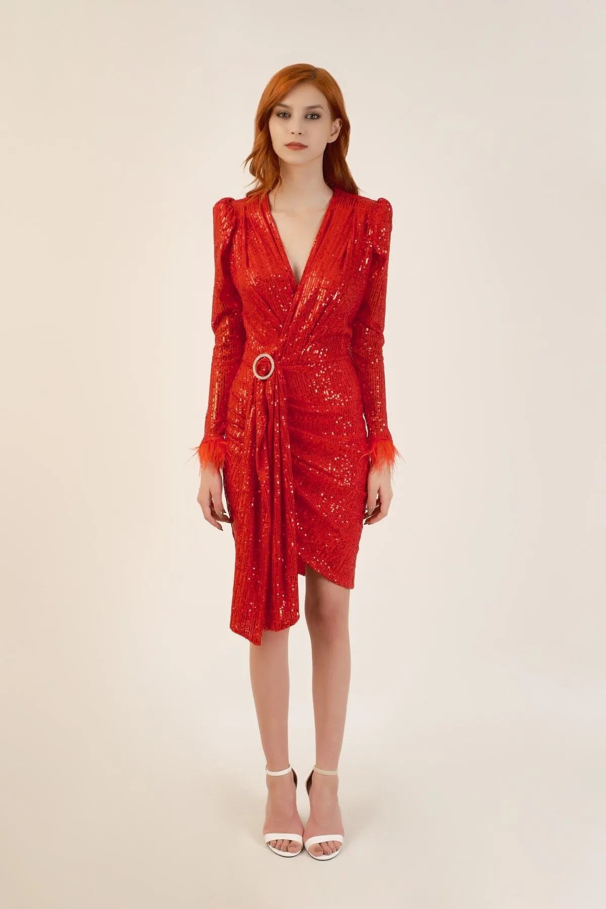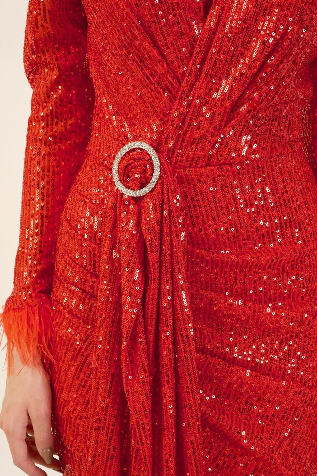 Payetli Otriş Detaylı Karpuz Kol Elbise - Kırmızı
