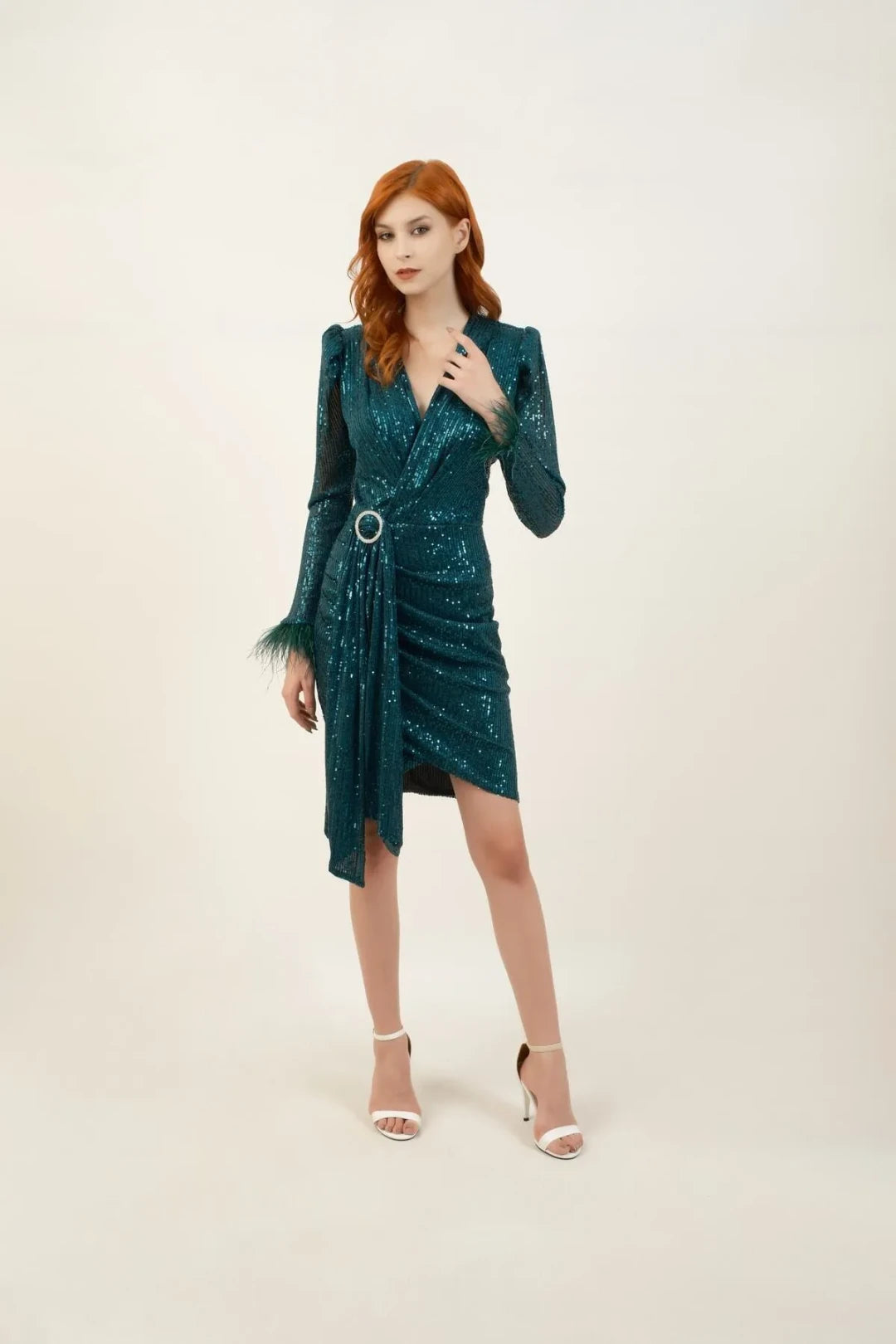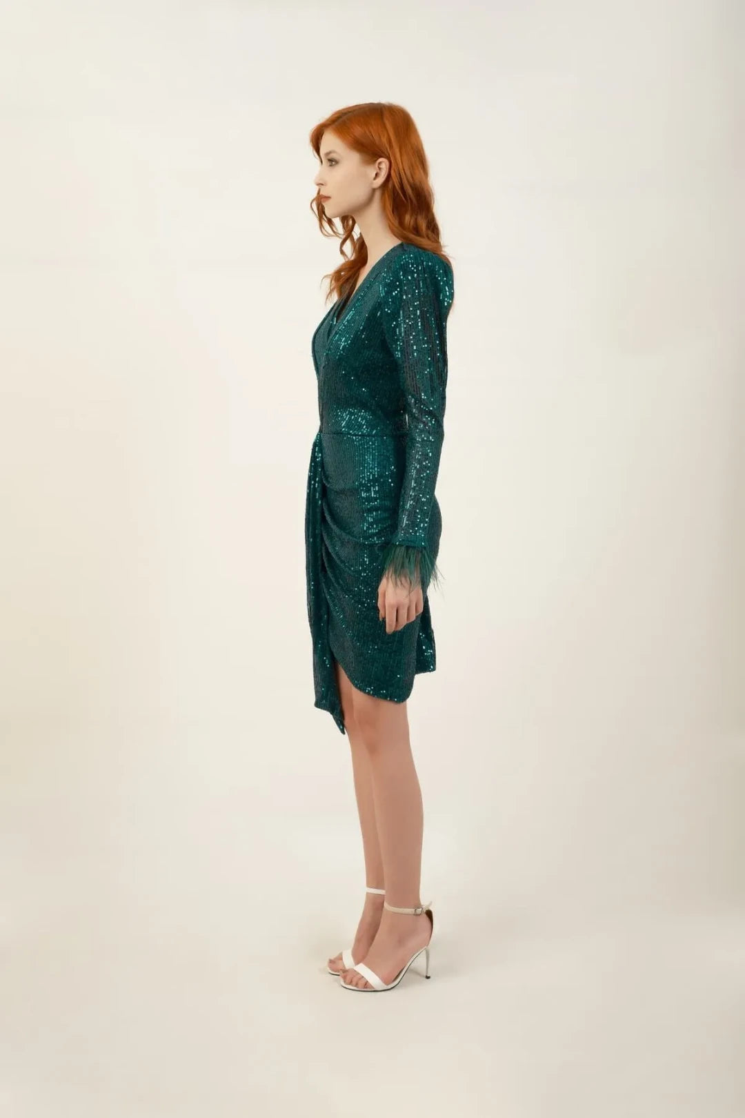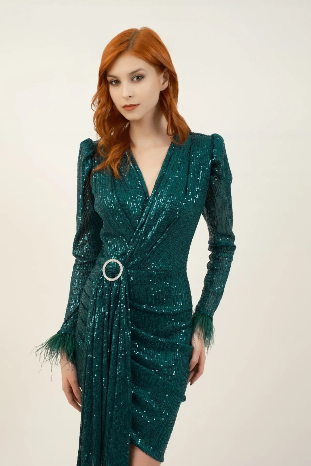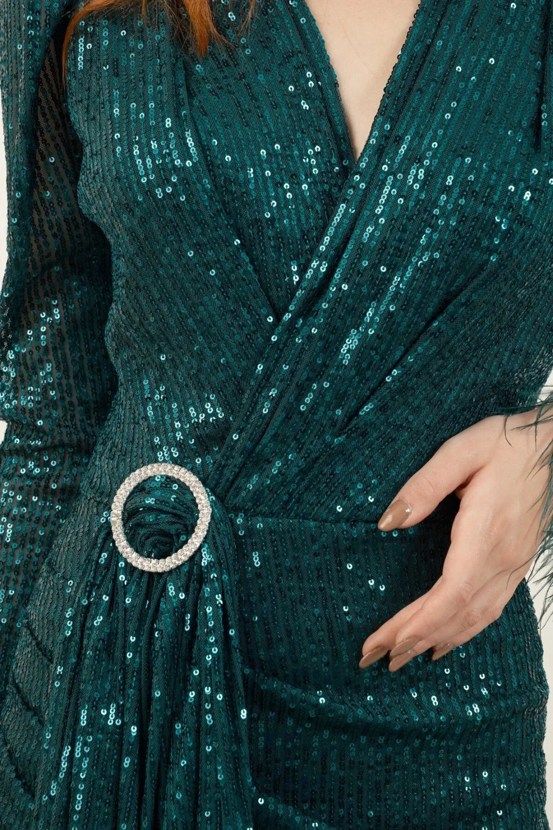 Payetli Otriş Detaylı Karpuz Kol Elbise - Zümrüt Yeşili