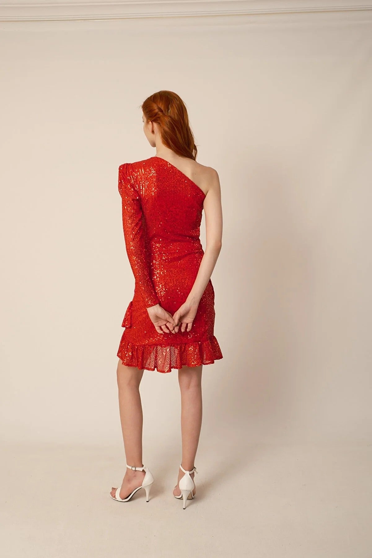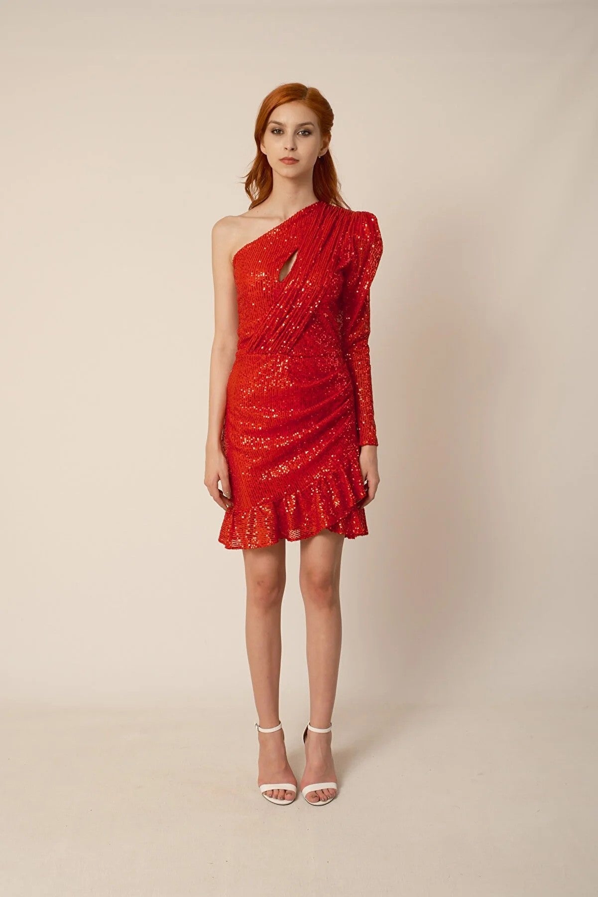 Parlak kırmızı renkte, tek omuz tasarımıyla dikkat çeken bu payetli elbise, özel davetler ve gece etkinlikleri için ideal bir seçimdir. İnce işçilikle hazırlanmış payetler, zarif ve sıradışı bir görünüm sunarken, tek omuz detayı modern ve şık bir siluet yaratır. Rahat bölümü sayesinde hem şıklığı hem de konforu bir arada yaşamanızı sağlar.