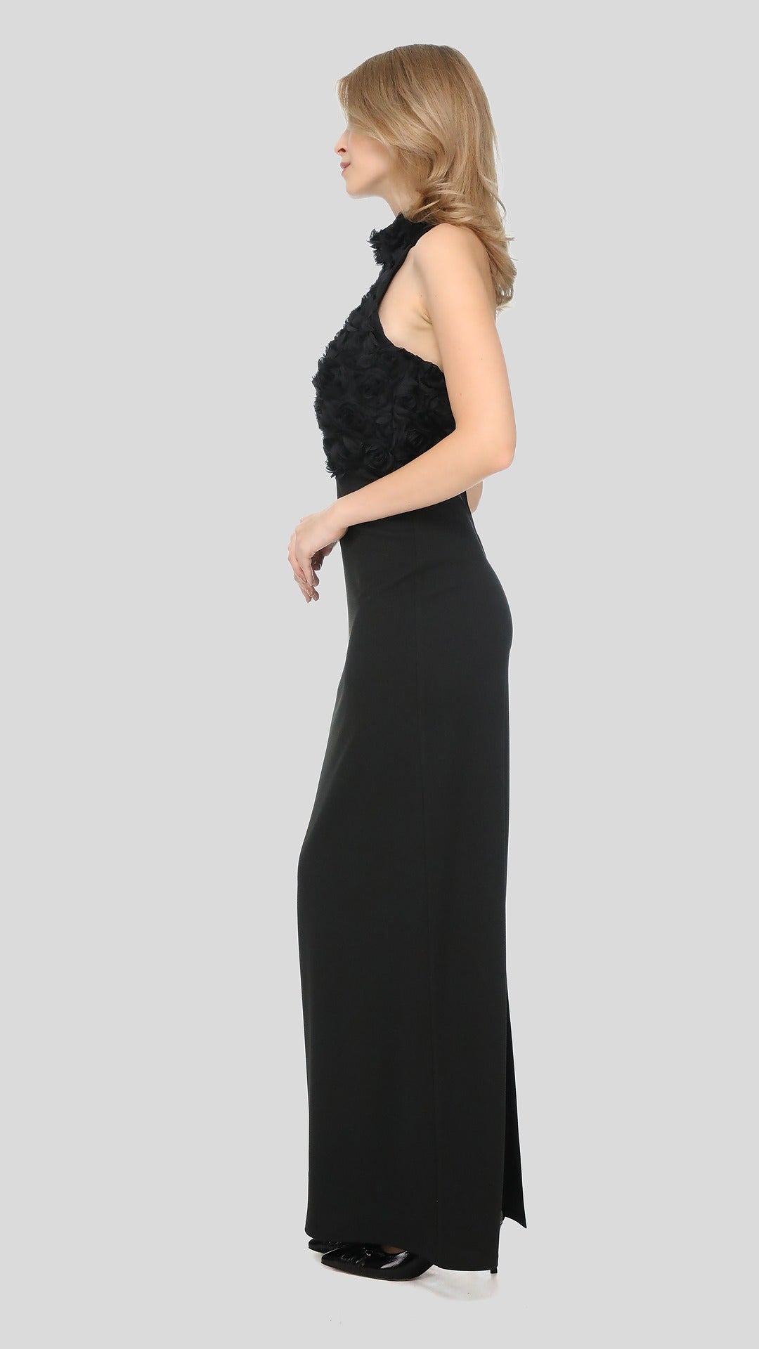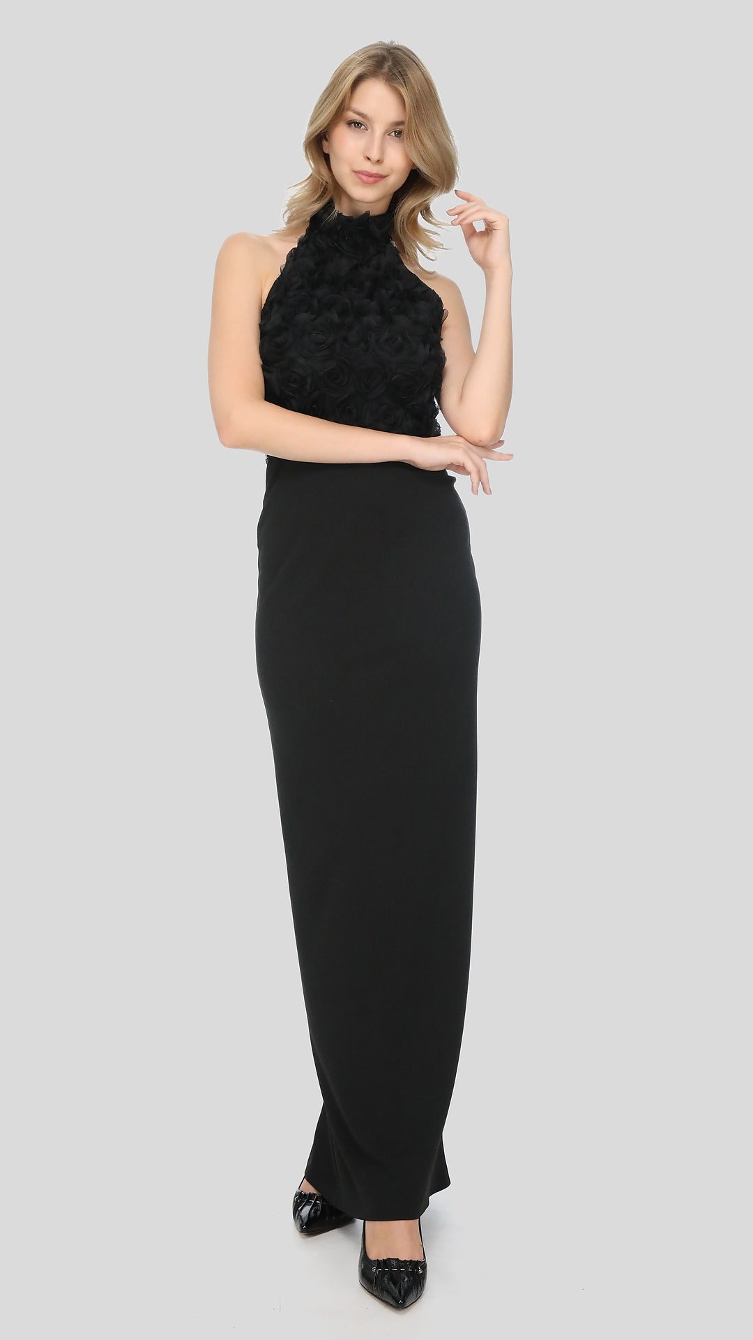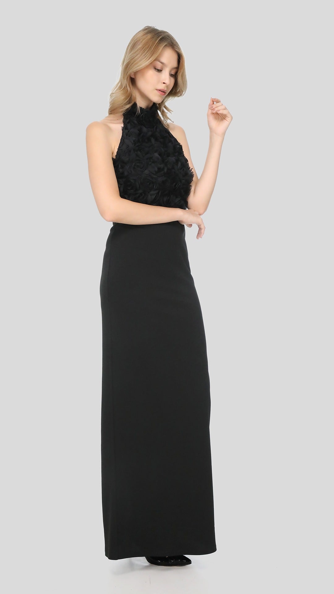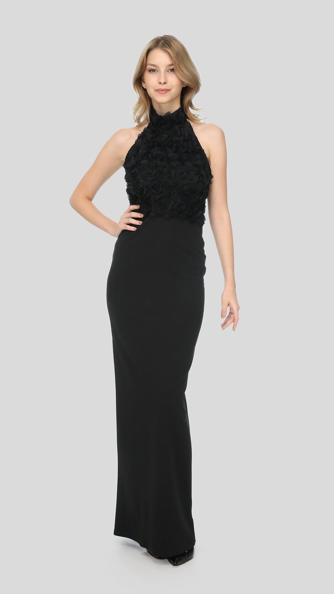 siyah üç boyut çiçekli boğazlı uzun elbise