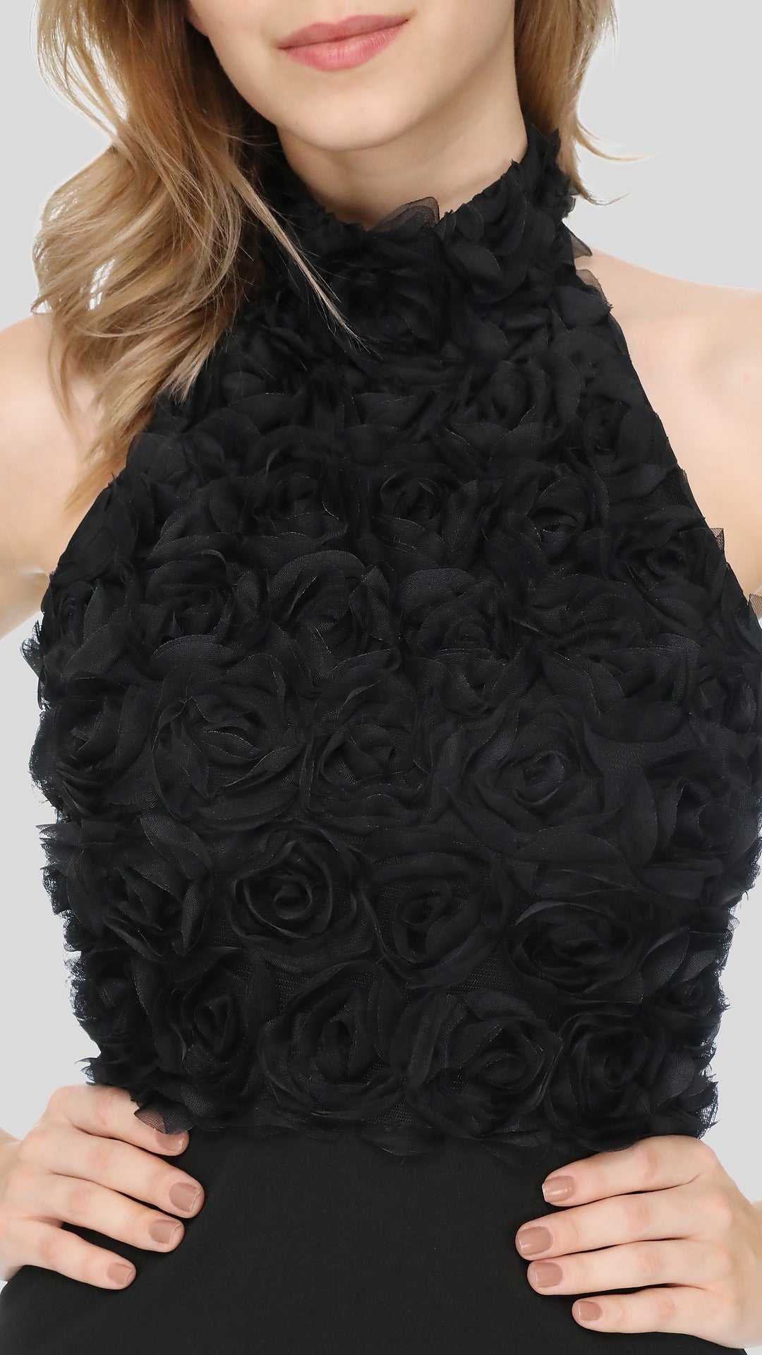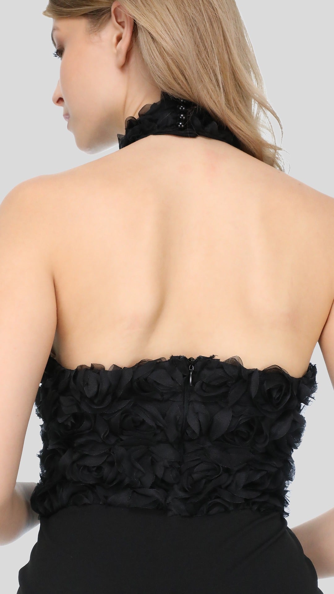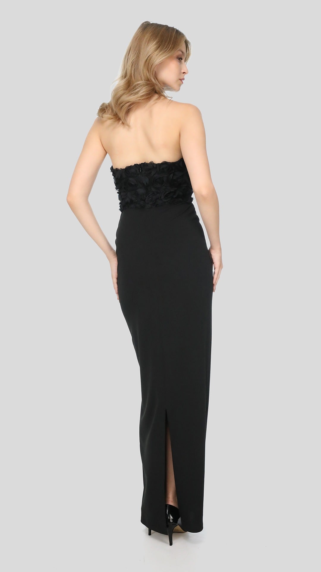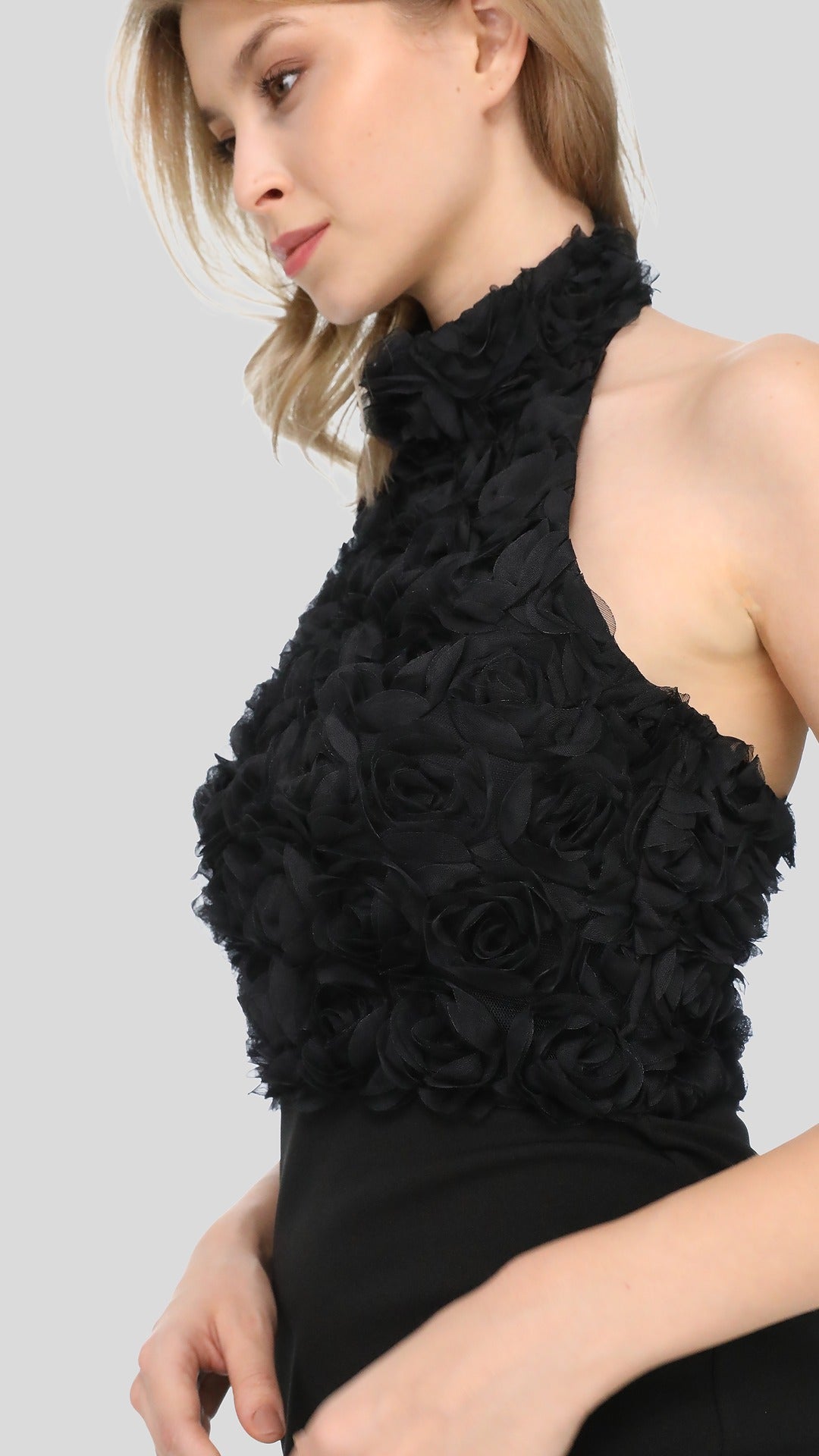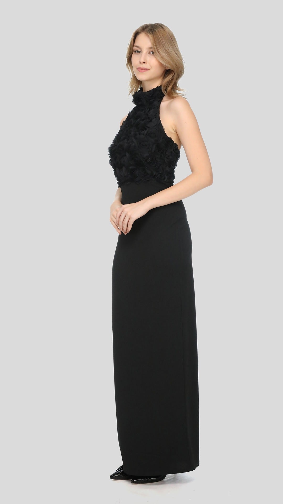 siyah üç boyut çiçekli boğazlı uzun elbise