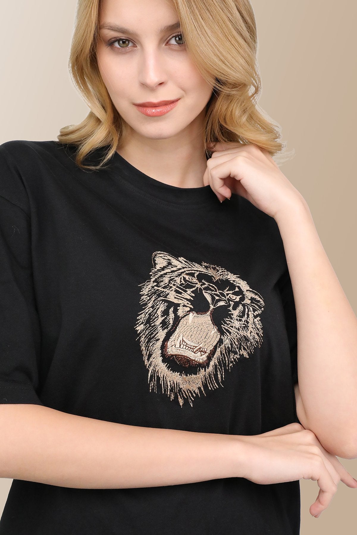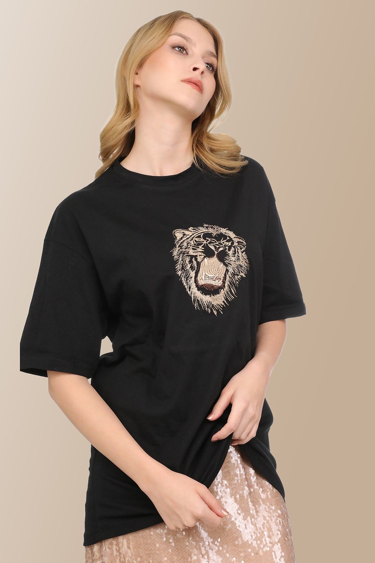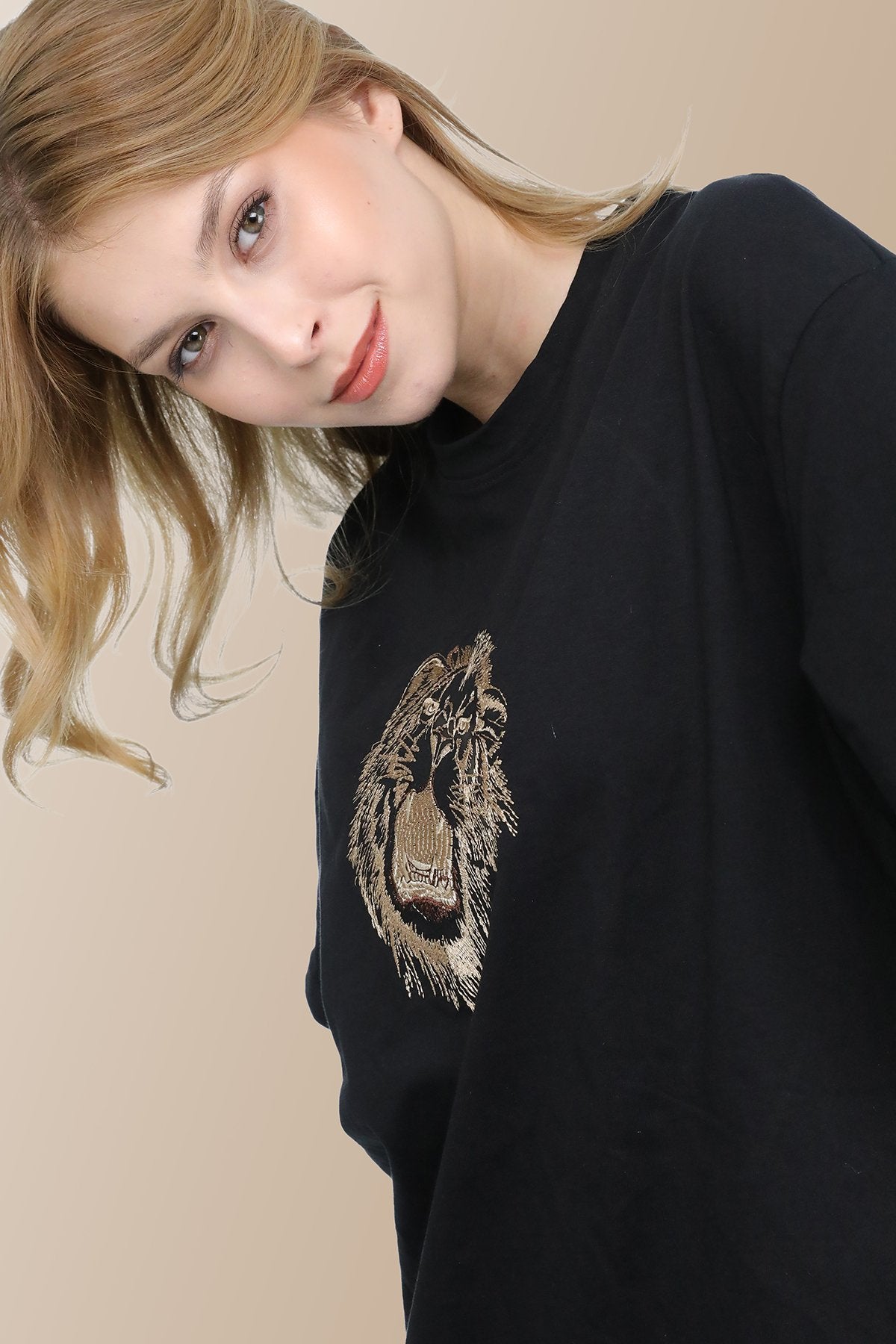 Siyah Uzun Aslan Desen Nakışlı Normal Tişört