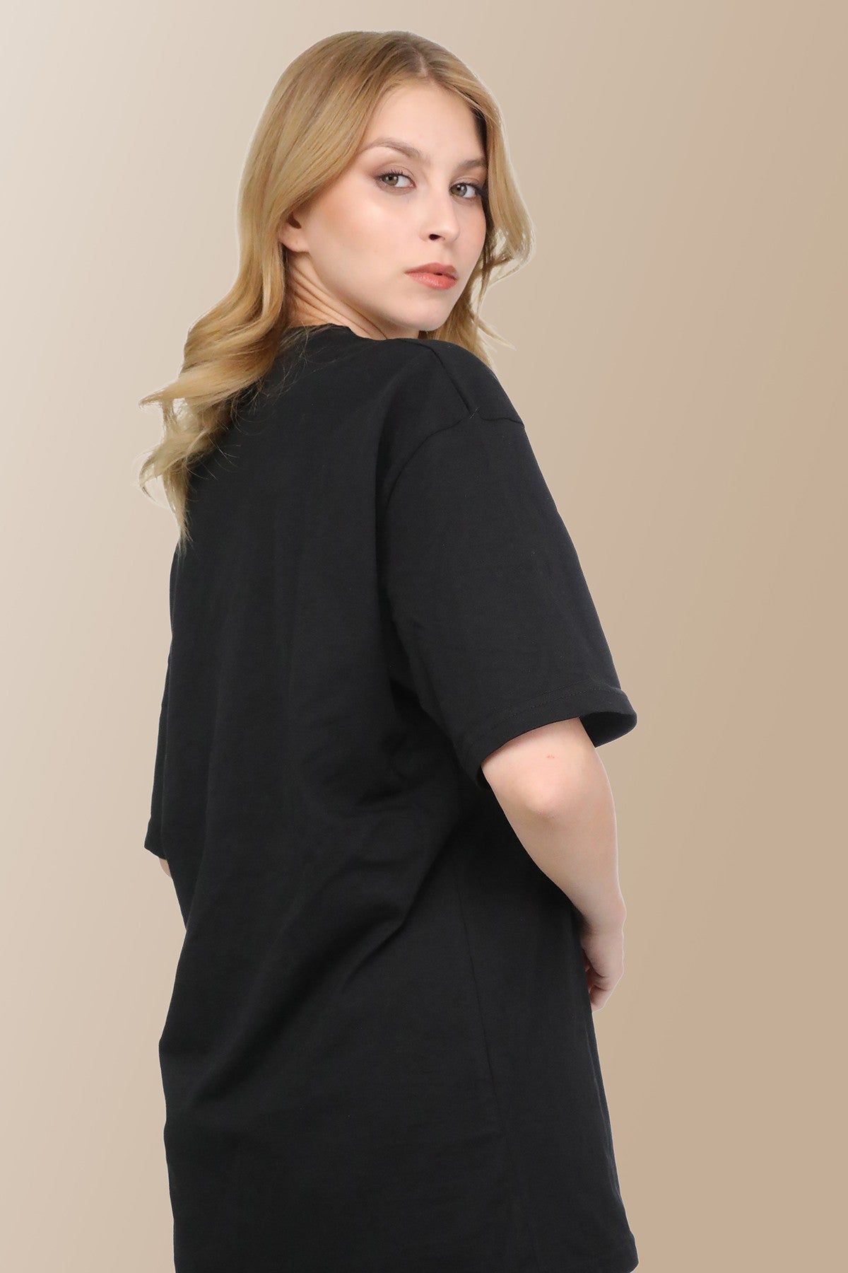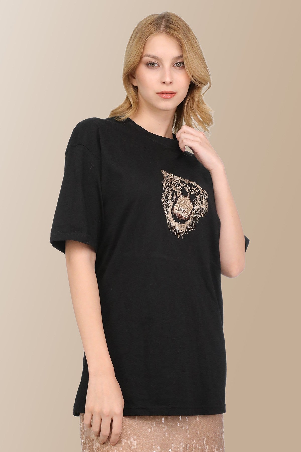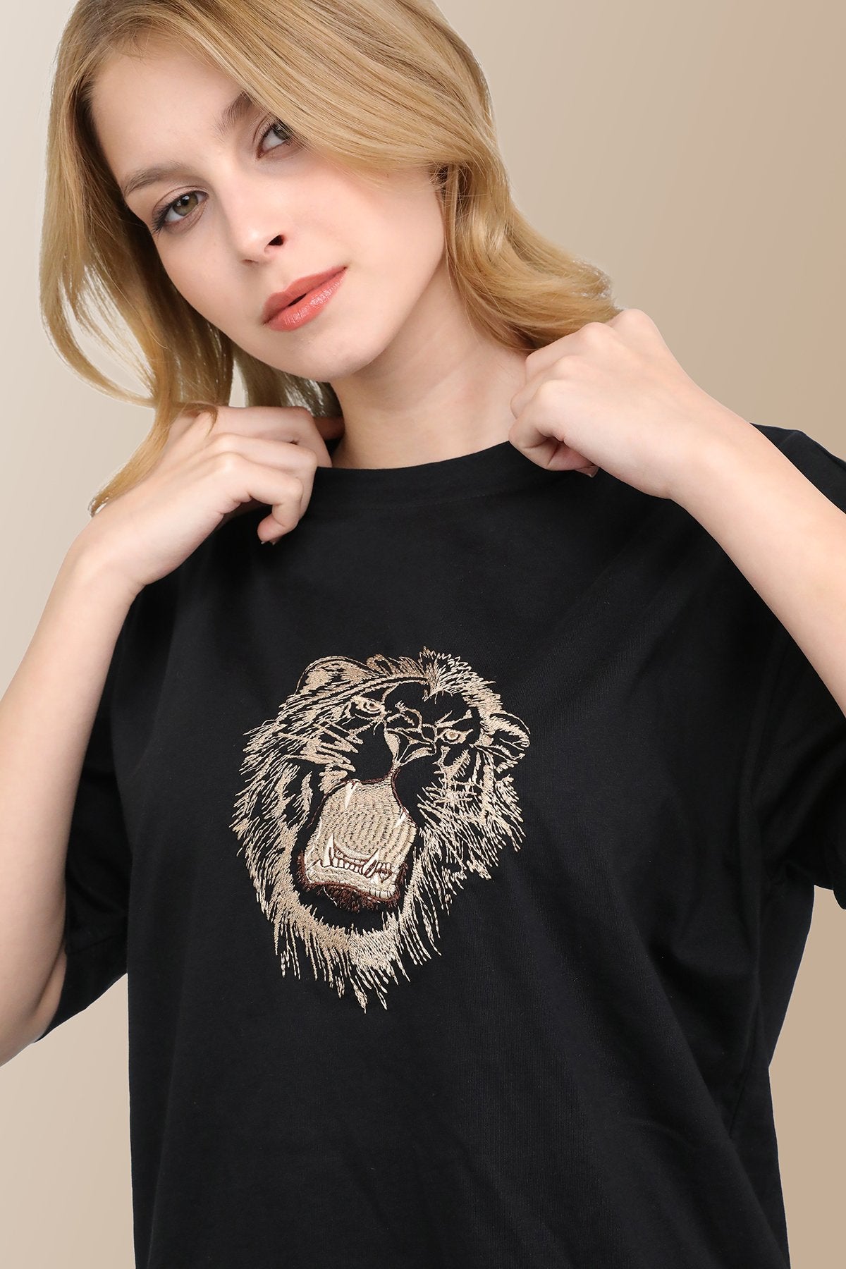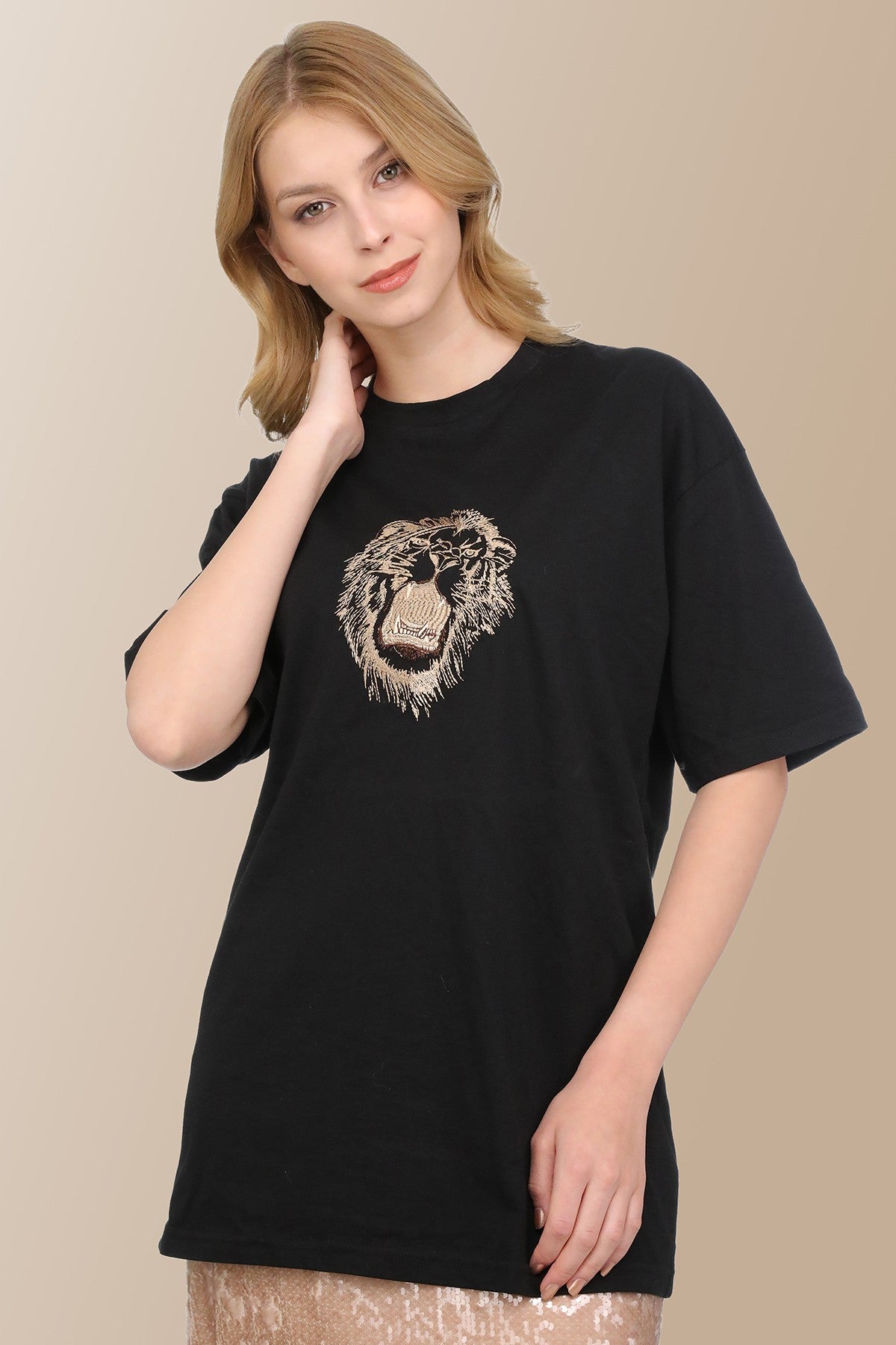 Siyah Uzun Aslan Desen Nakışlı Normal Tişört