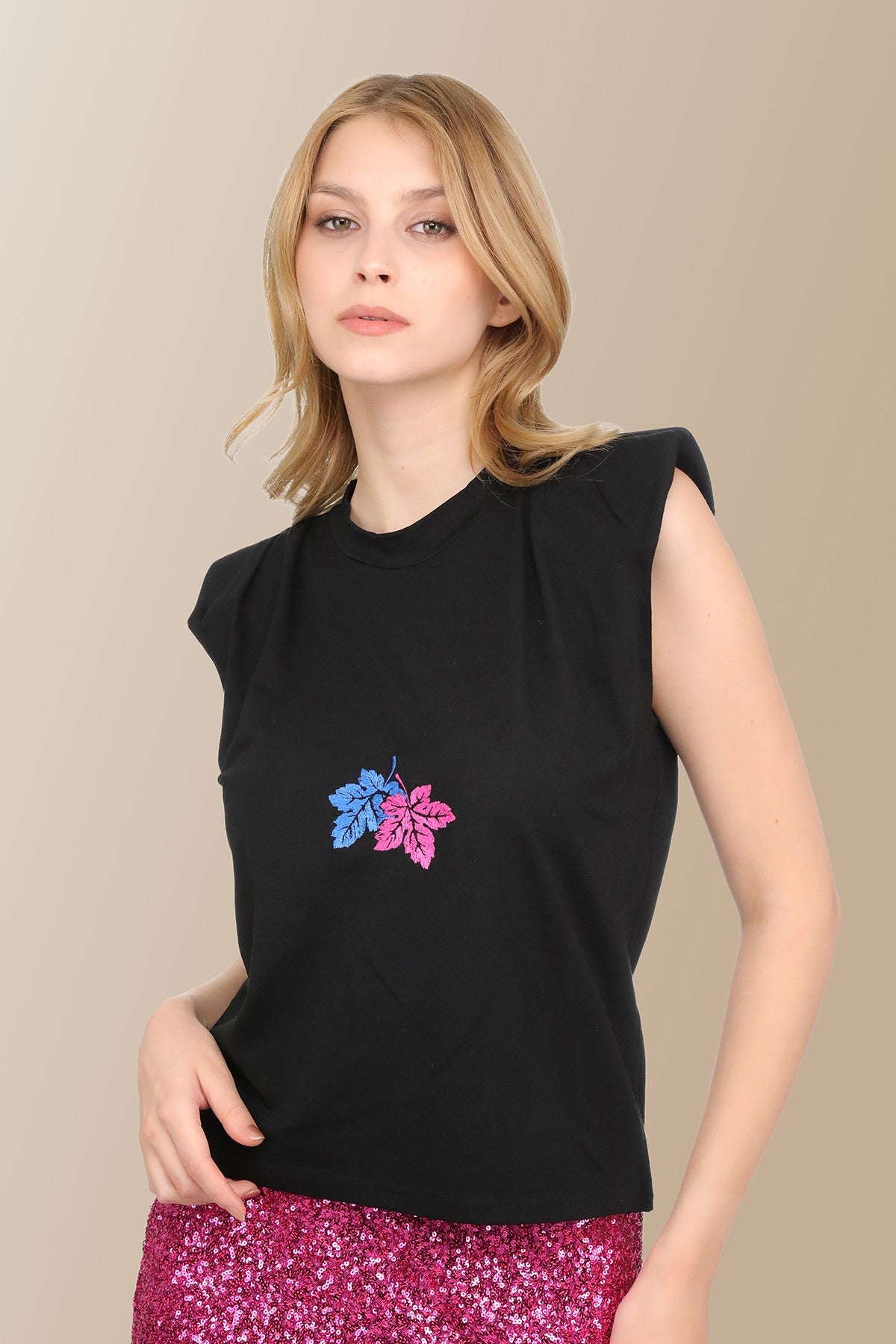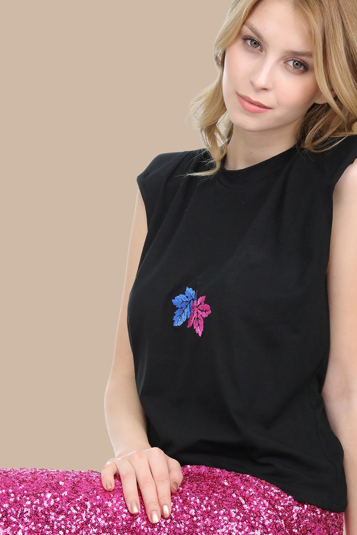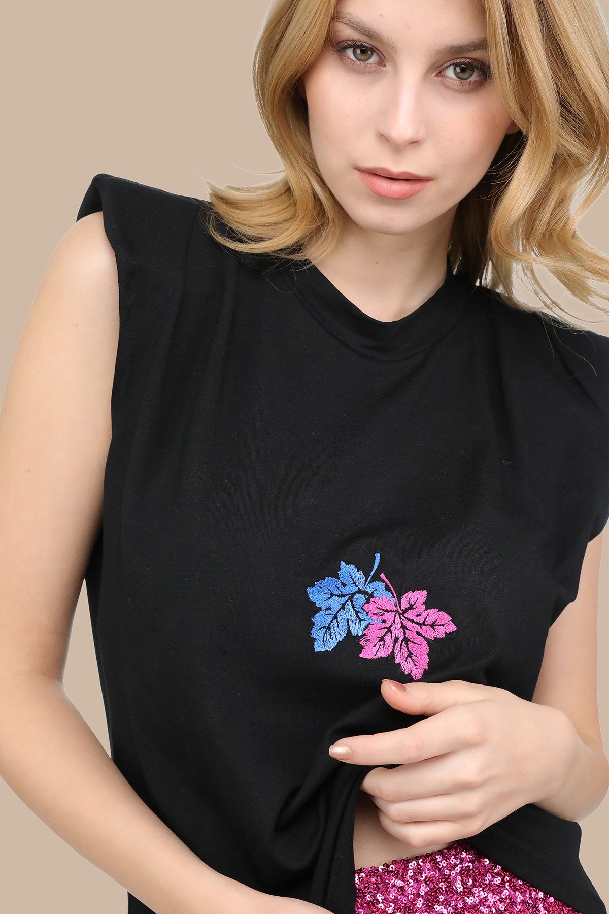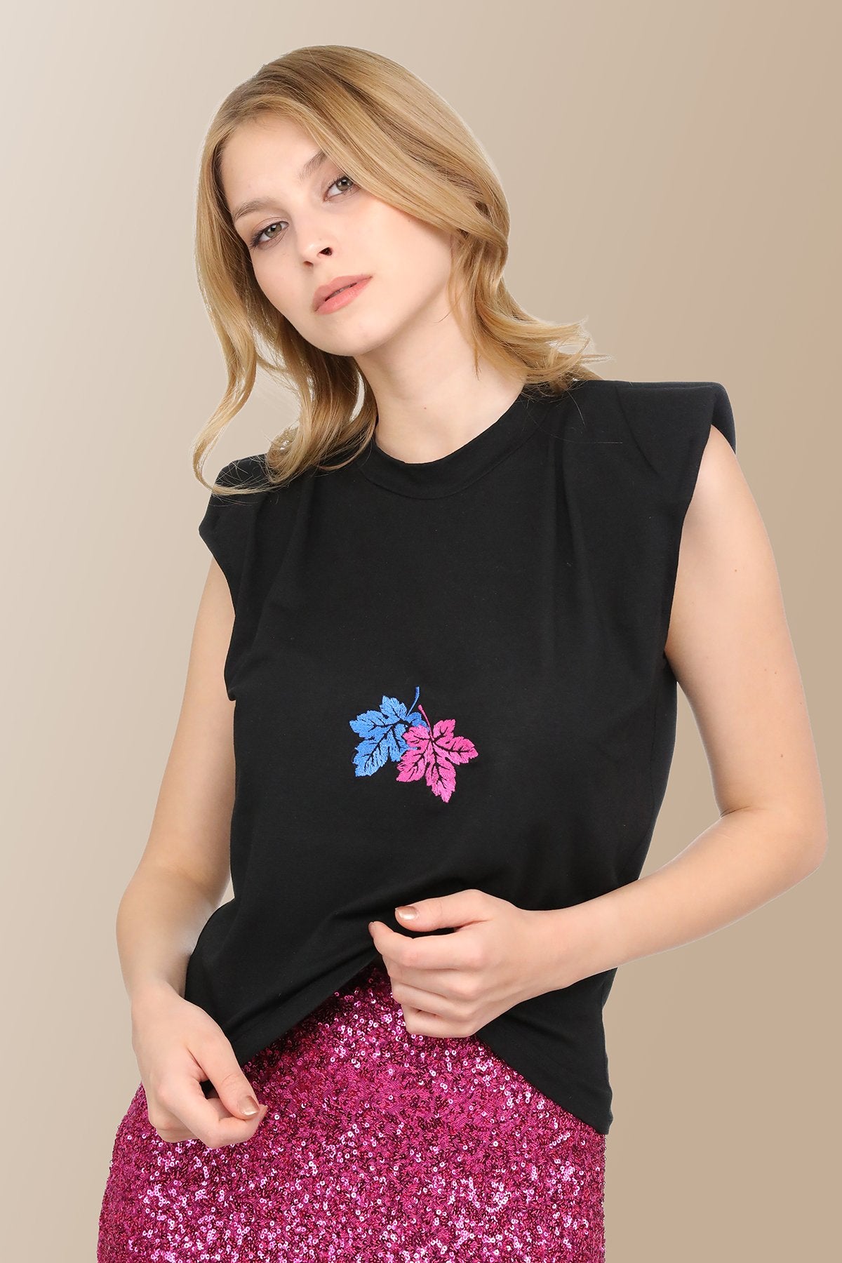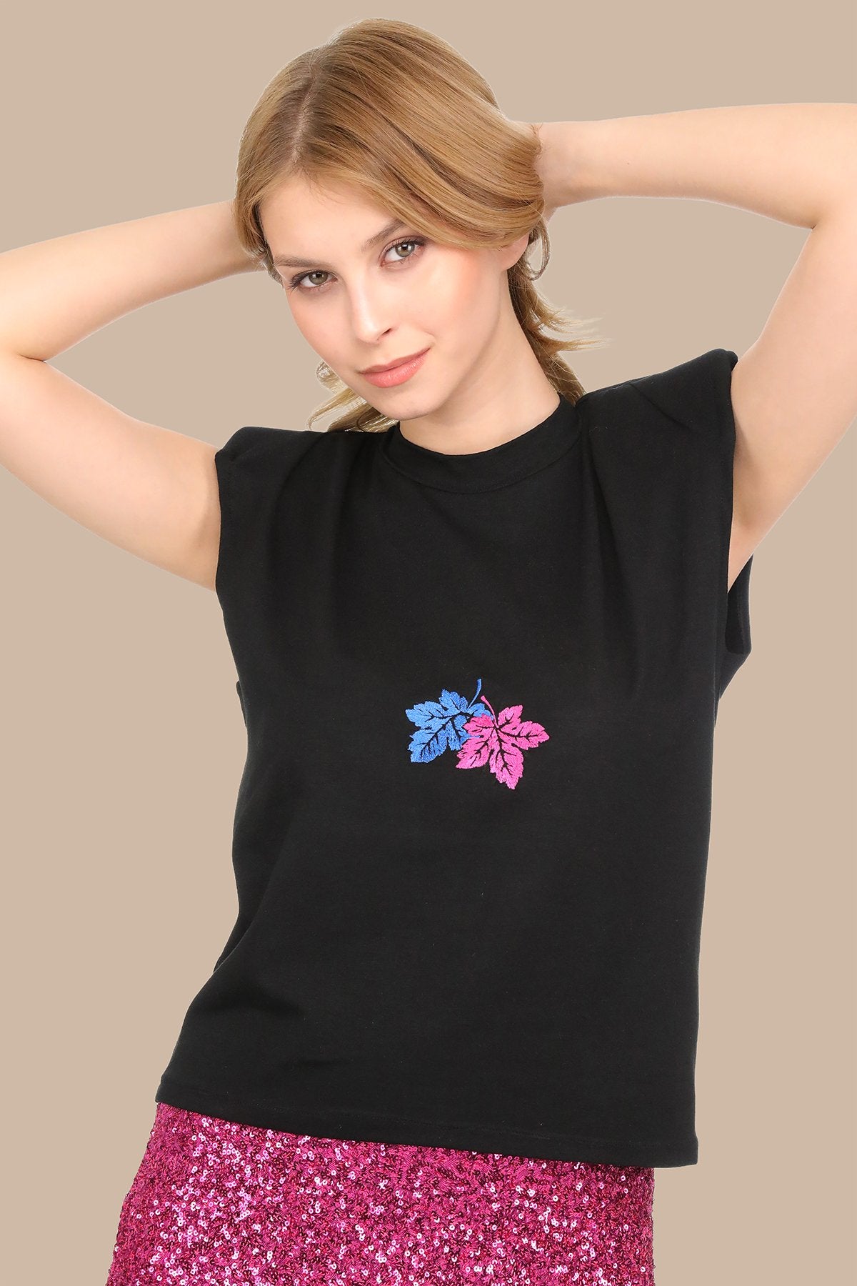 Siyah Yaprak Nakışlı Kolsuz tişört