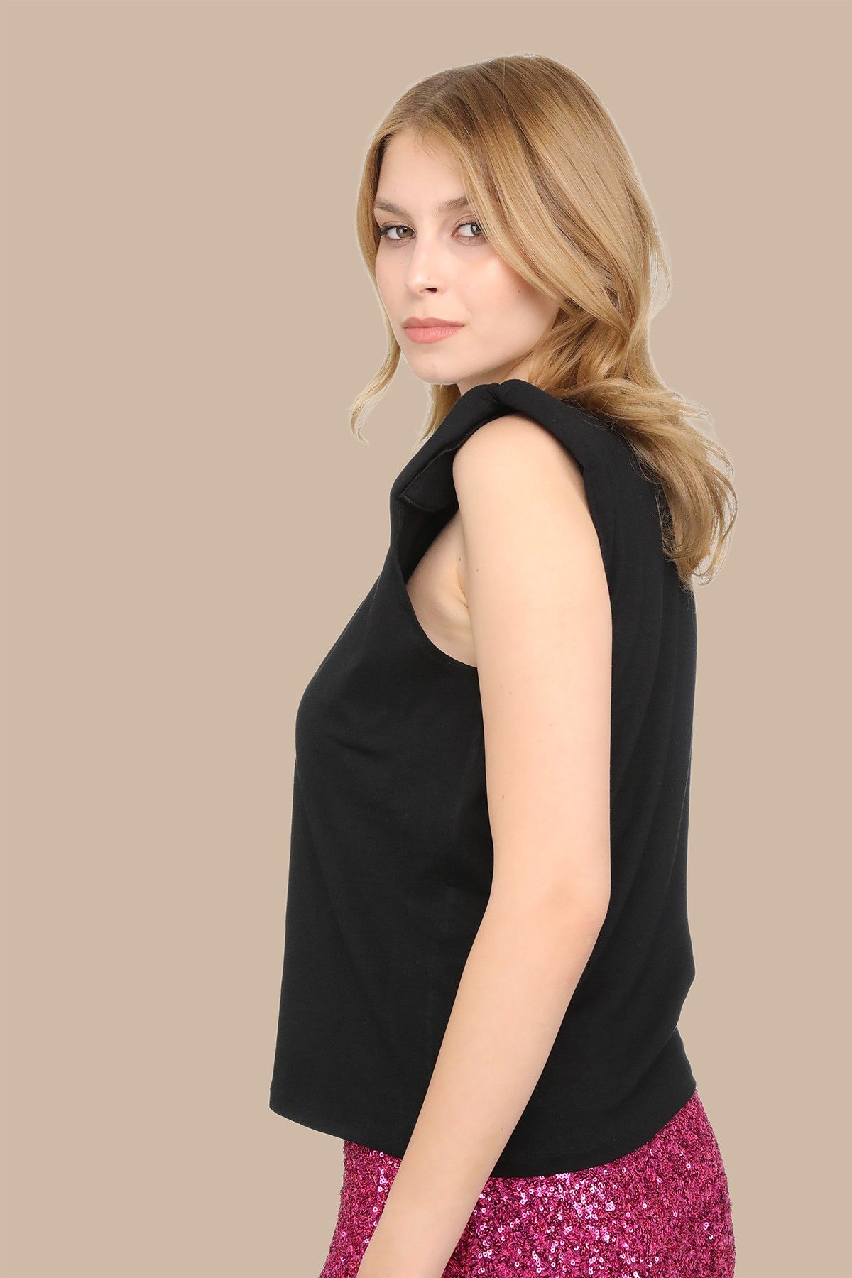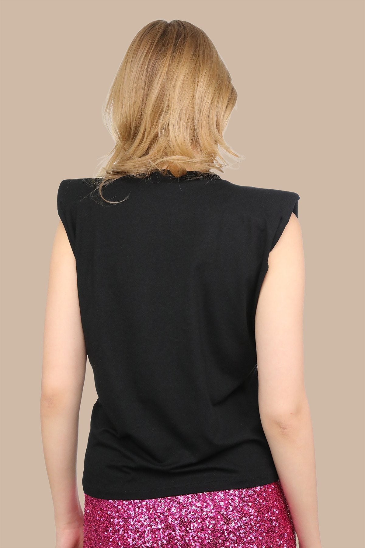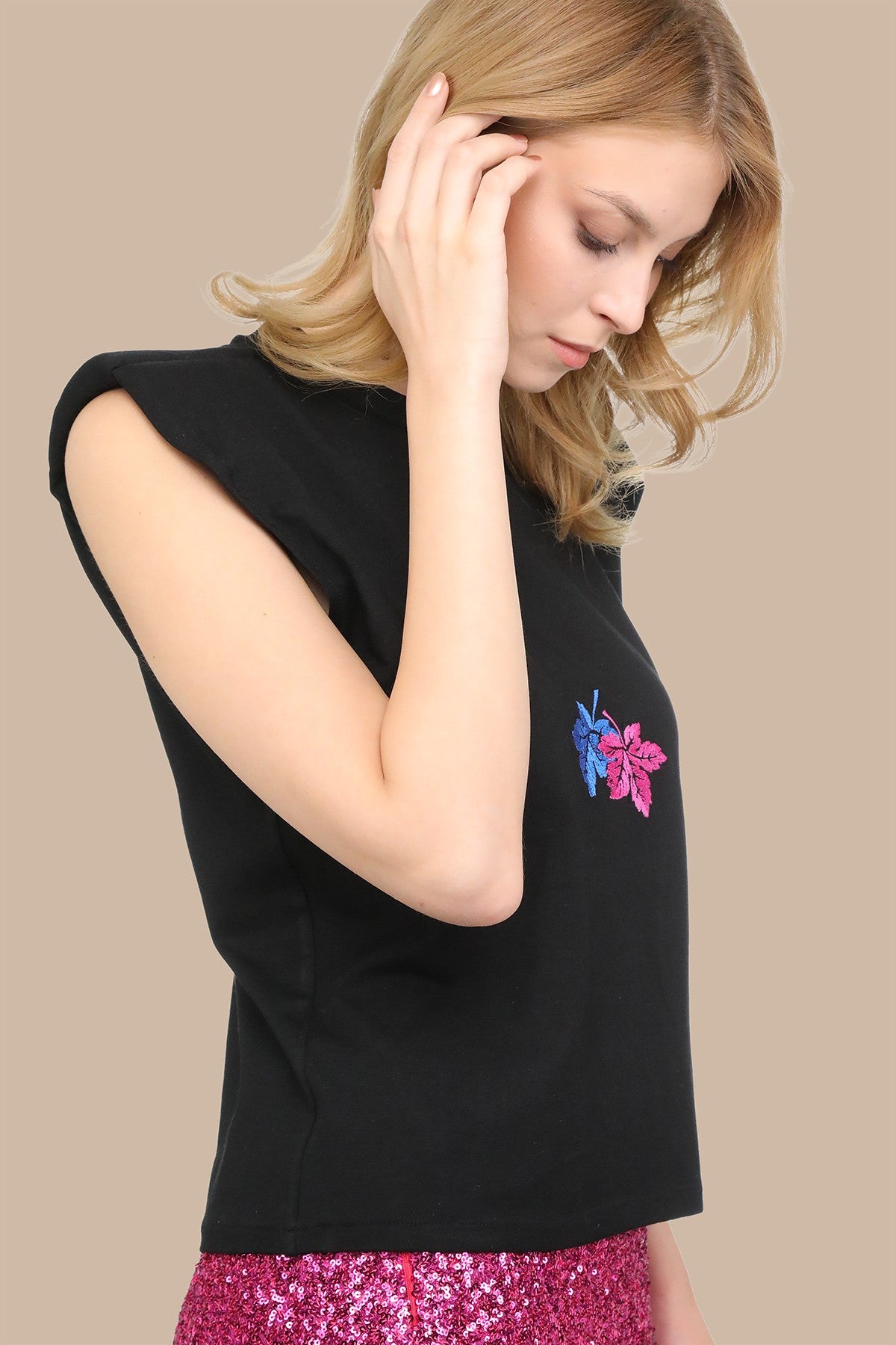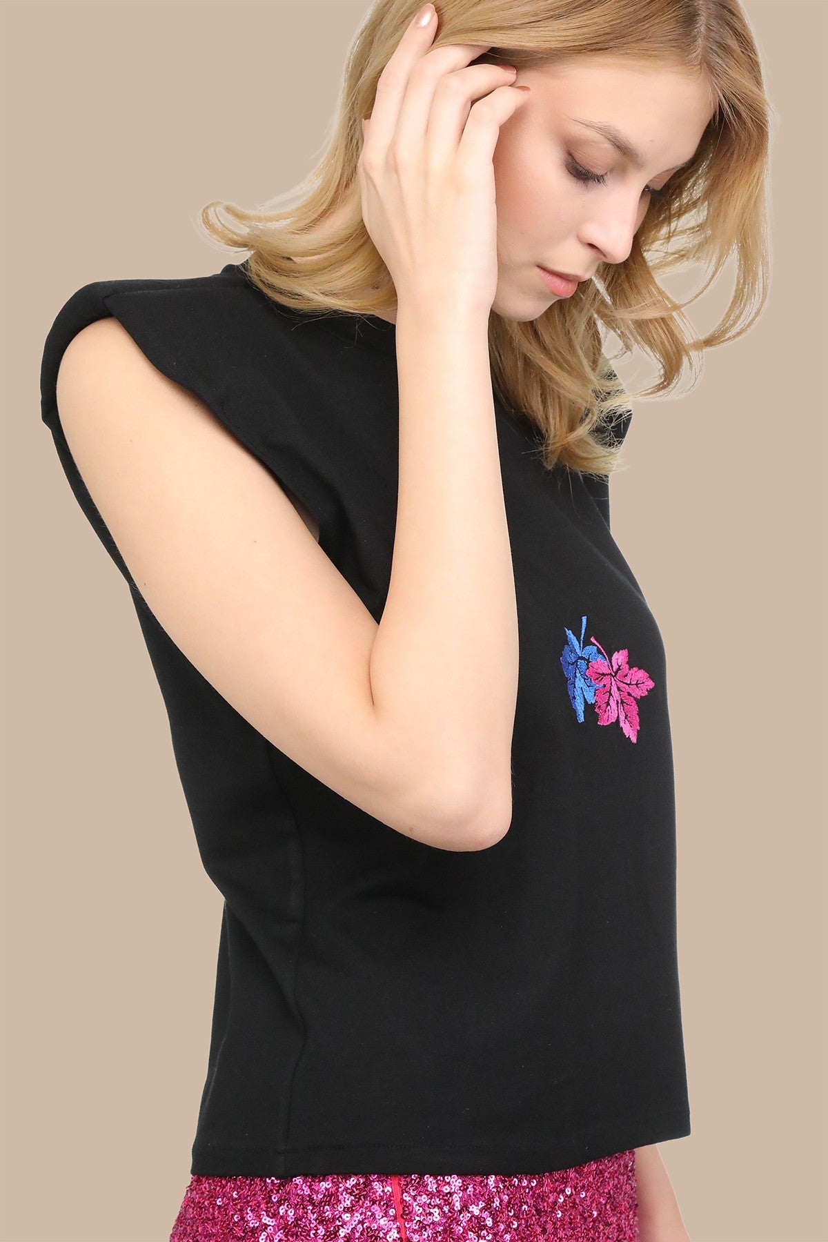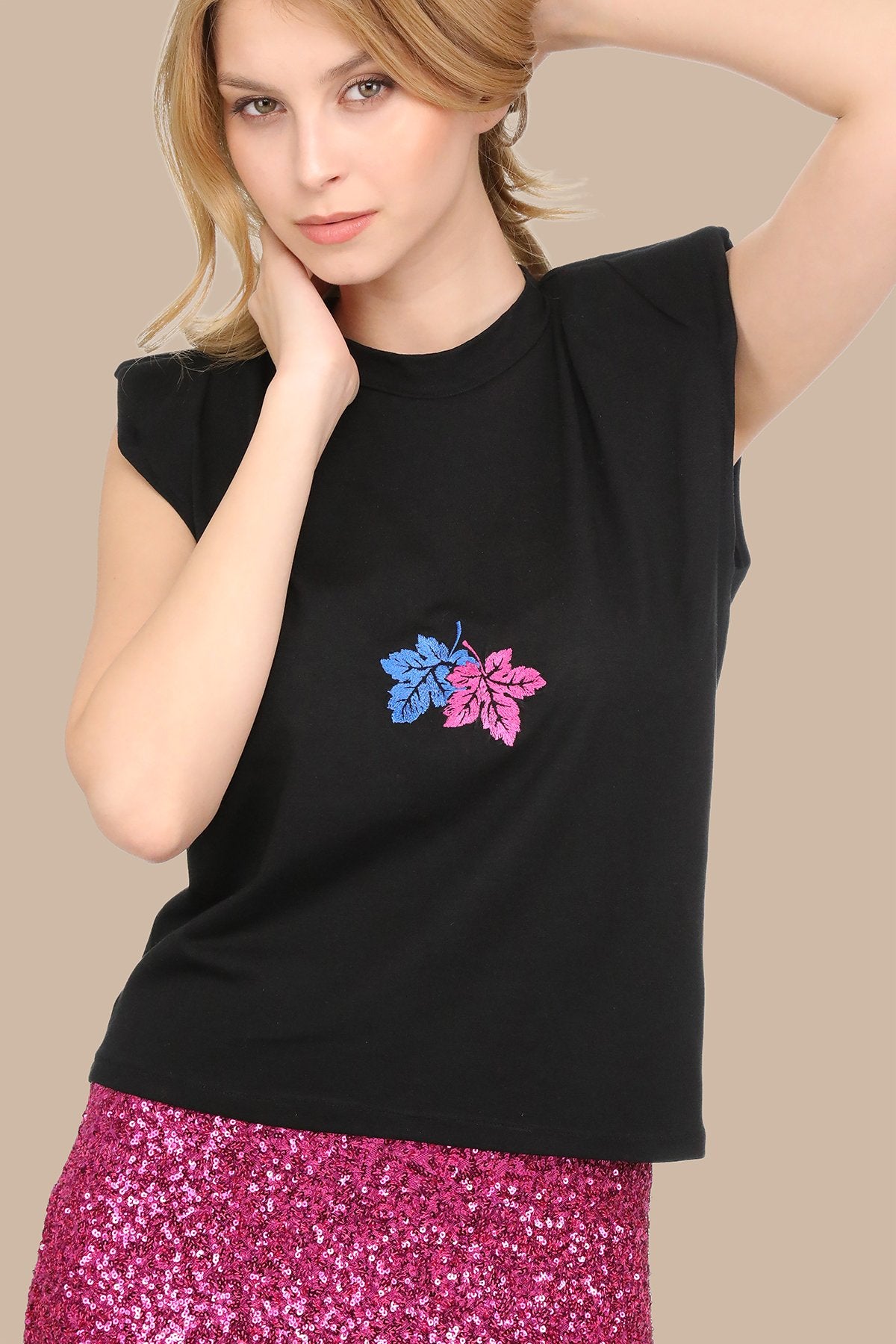 Siyah Yaprak Nakışlı Kolsuz tişört