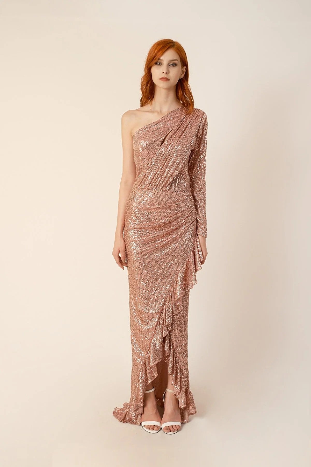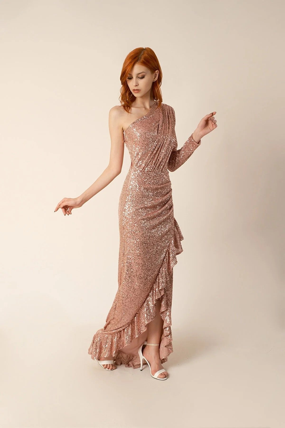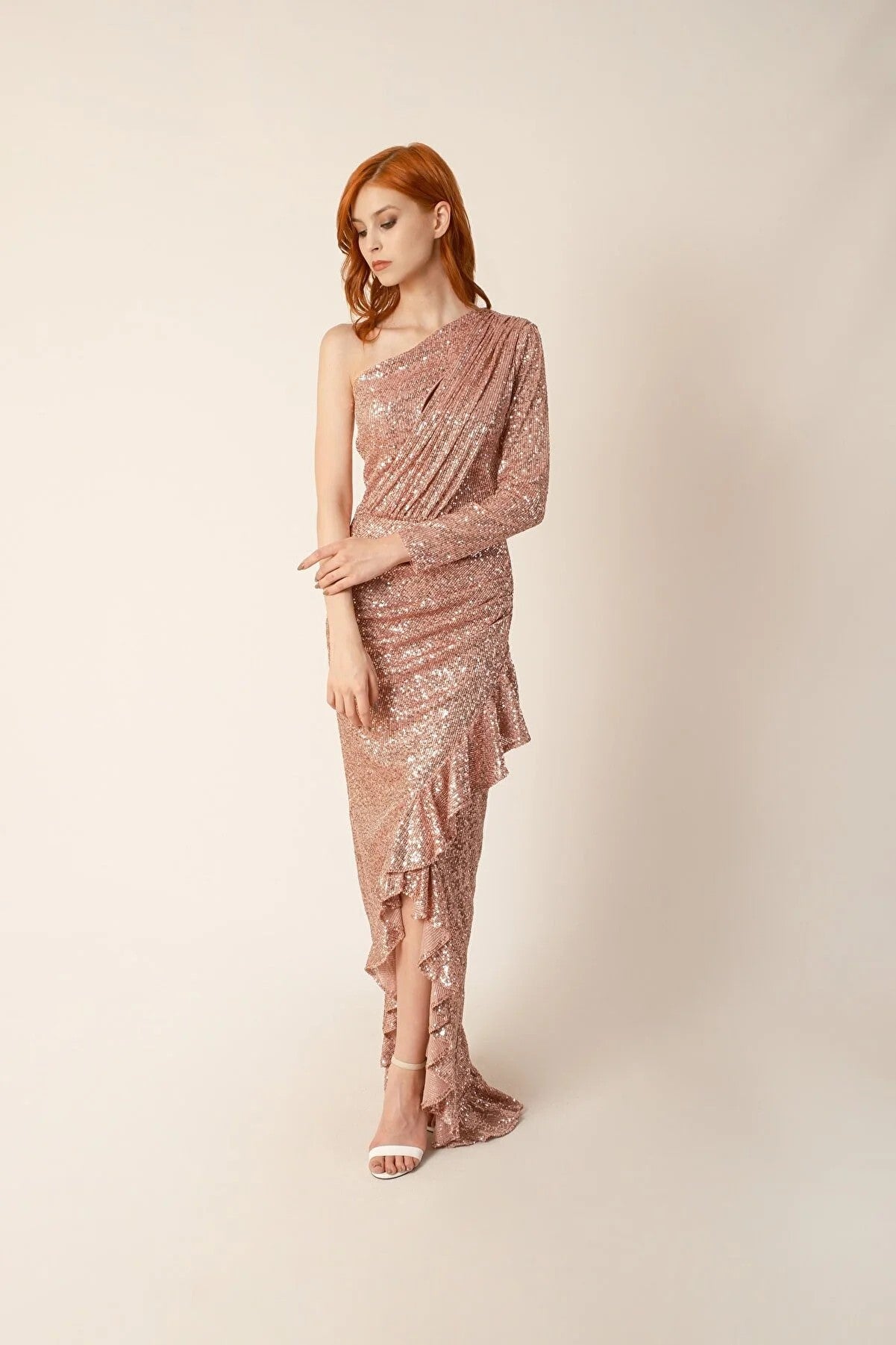 Tek Omuz Fırfırlı Uzun Elbise - Gül Kurusu
