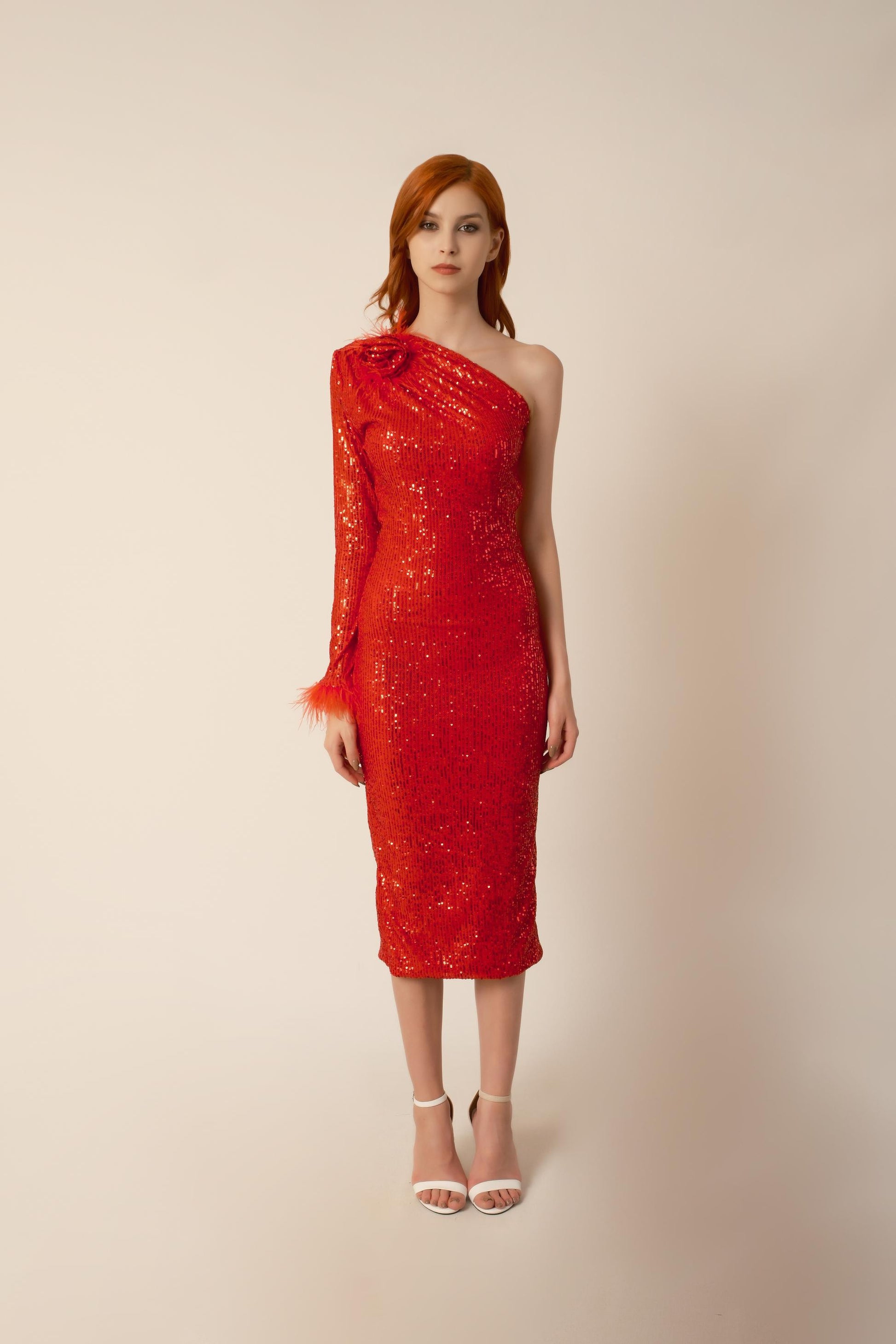Tek Omuz Güllü Otrişli Elbise - Kırmızı